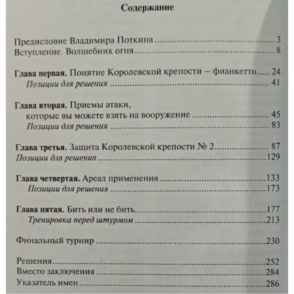 Автори продовжують вивчення типових позицій дебюту та миттельшпиля. У Королівської фортеці № 2 пішаки знаходяться на полях f7, g6, h7 (або f2, g3, h2) і до них зазвичай приєднується ще один захисник - слон на g7 (g2). Така побудова називається фіанкетто, вона зустрічається в багатьох популярних дебютах, таких як Каталонський початок, Староіндійський захист, захист Грюнфельда та інших. Автори докладно розбирають прийоми атаки, захисту та контратаки. Більшість прикладів – із творчості сучасних шахістів (так, окремий розділ присвячений найсильнішому російському гросмейстеру Яну Непомнящему); їх доповнюють партії, які стали класичною спадщиною. У книзі близько 300 позицій для самостійного вирішення, тож це не лише підручник, а й солідний задачник.
