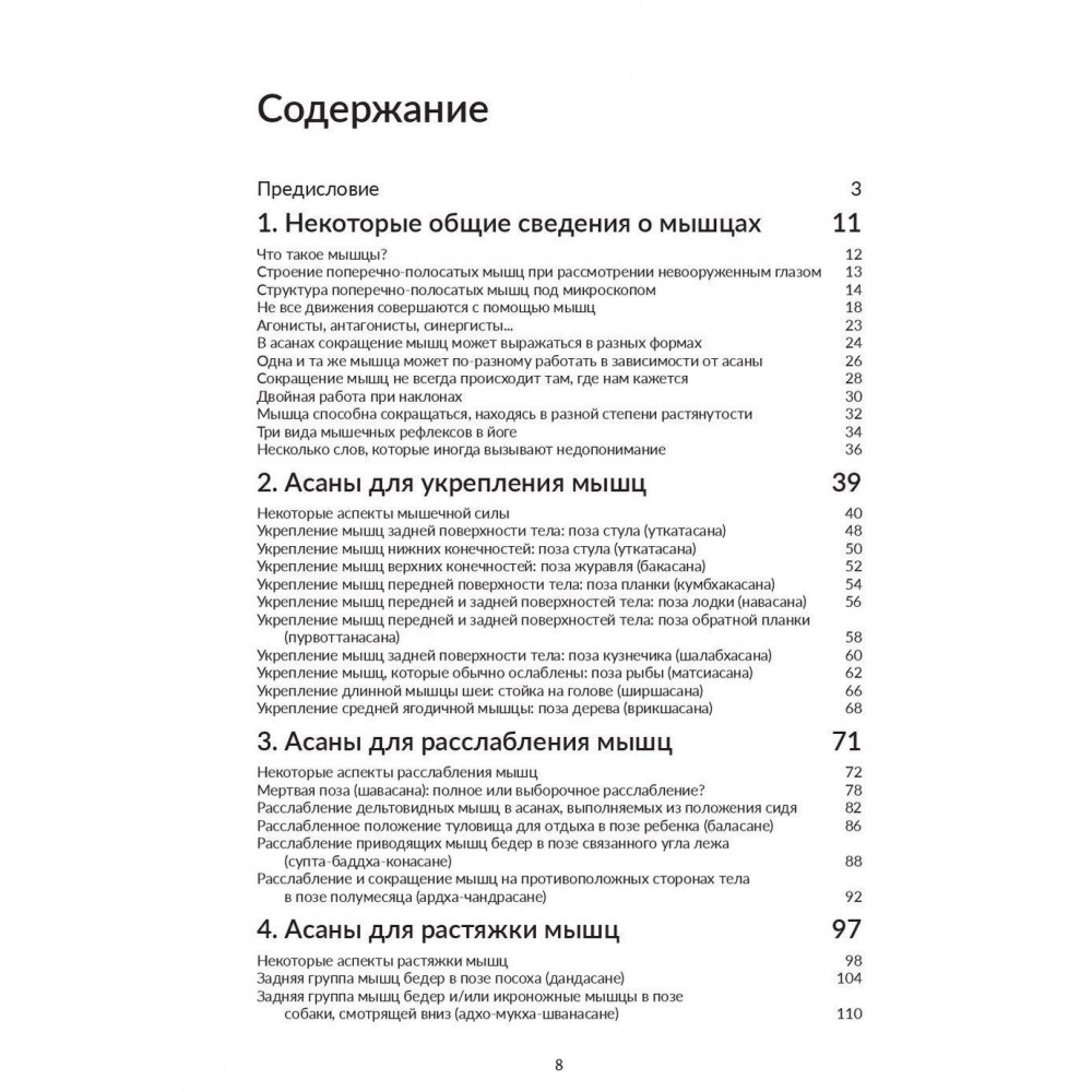 При виконанні будь-якої асани в йозі м'язи керують нашими кістками, забезпечують стабільність суглобів, захищають нерви, утримують або переміщують частини тіла... Їхня роль дуже різноманітна. Тому, залежно від ситуації, м'язи повинні бути сильними або еластичними, здатними розслаблятися і розтягуватися, а також знаходитися відразу в кількох цих станах і координувати свої дії. Йога при правильному виконанні вправ може поступово розвивати всі ці якості м'язів. У книзі розглядаються різноманітні варіації роботи мускулатури у різних асанах. На прикладах та ілюстраціях, об'єднаних у тематичні блоки, ми зможемо поспостерігати за окремими м'язами або їхніми групами та навчимося розрізняти їх функції у кожному конкретному випадку. Цей посібник призначений для людей, які мають досить просунутий рівень підготовки. Воно допоможе читачам більш усвідомлено підходити до своїх тренувань.