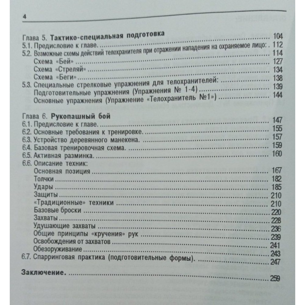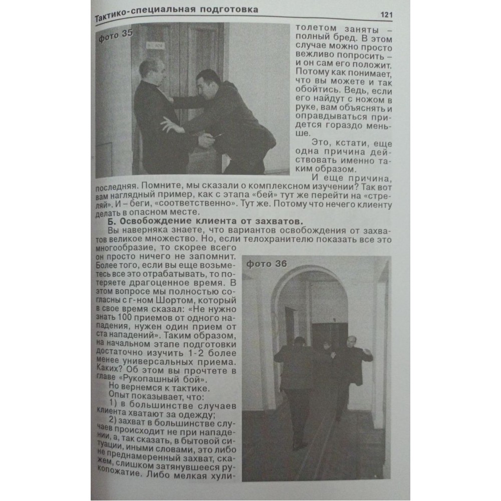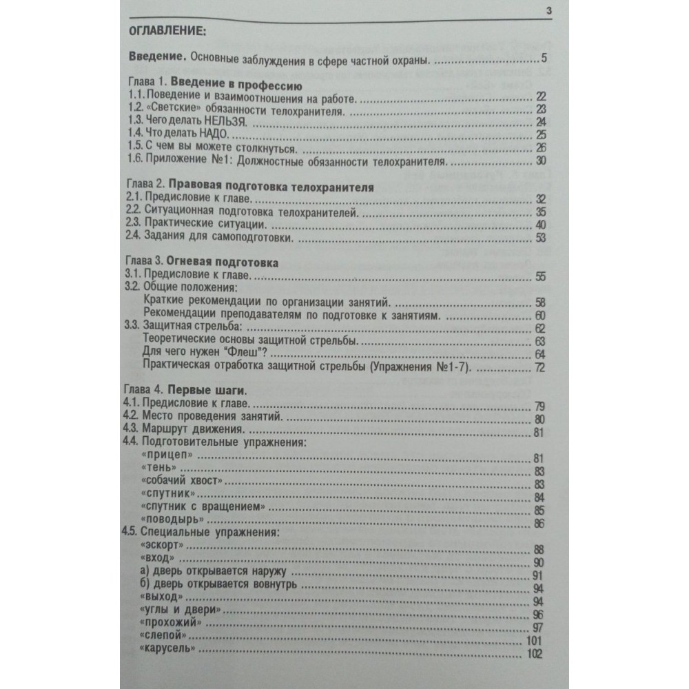 Навчально-методичне посібник для викладачів та інструкторів шкіл приватної охорони. Основна увага приділяється у ньому підготовці охоронця-одинака. Розглянуто традиційні помилки та помилки в навчанні та роботі охоронних структур, етичні та психологічні особливості професії охоронця. А також правова та ситуаційна підготовка з позицій "Що робити, якщо..."; навчання швидкісної захисної стрільби на коротких дистанціях; вироблення навичок природної поведінки у різних ситуаціях. Зі змісту: Поведінка і взаємини на роботі. «Світські» обов'язки охоронця. Що робити не можна. Що робити треба. Спеціальні вправи: "ескорт", "вхід". двері відчиняються назовні, двері відчиняються всередину, «вихід». "Сліпий", "карусель". Рукопашний бій. Захоплення. Звільнення від захоплень. Обеззброєння та ін.