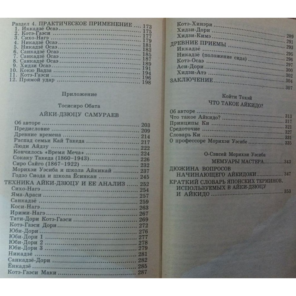 Букіністичне видання. До книги включені роботи легендарних майстрів, які є учнями основоположника сучасного Айкідо Моріхеї Уесіби - Годзо Сіоди, Тосісіро Обати, а також Койті Тохея. Майстри знайомлять не тільки зі своїми тренувальними техніками та бойовими прийомами, але й дають докладний опис психофізичного та аутотренінгу в Айкідо. Цікава історія Айки-Дзюцу самураїв, що наводиться в книзі. Дуже допоможе читачеві словник японських термінів, що використовуються в Айкідо та Айкі-Дзюцу. Книга буде корисна всім любителям бойових мистецтв, як початківцям, так і професіоналам.