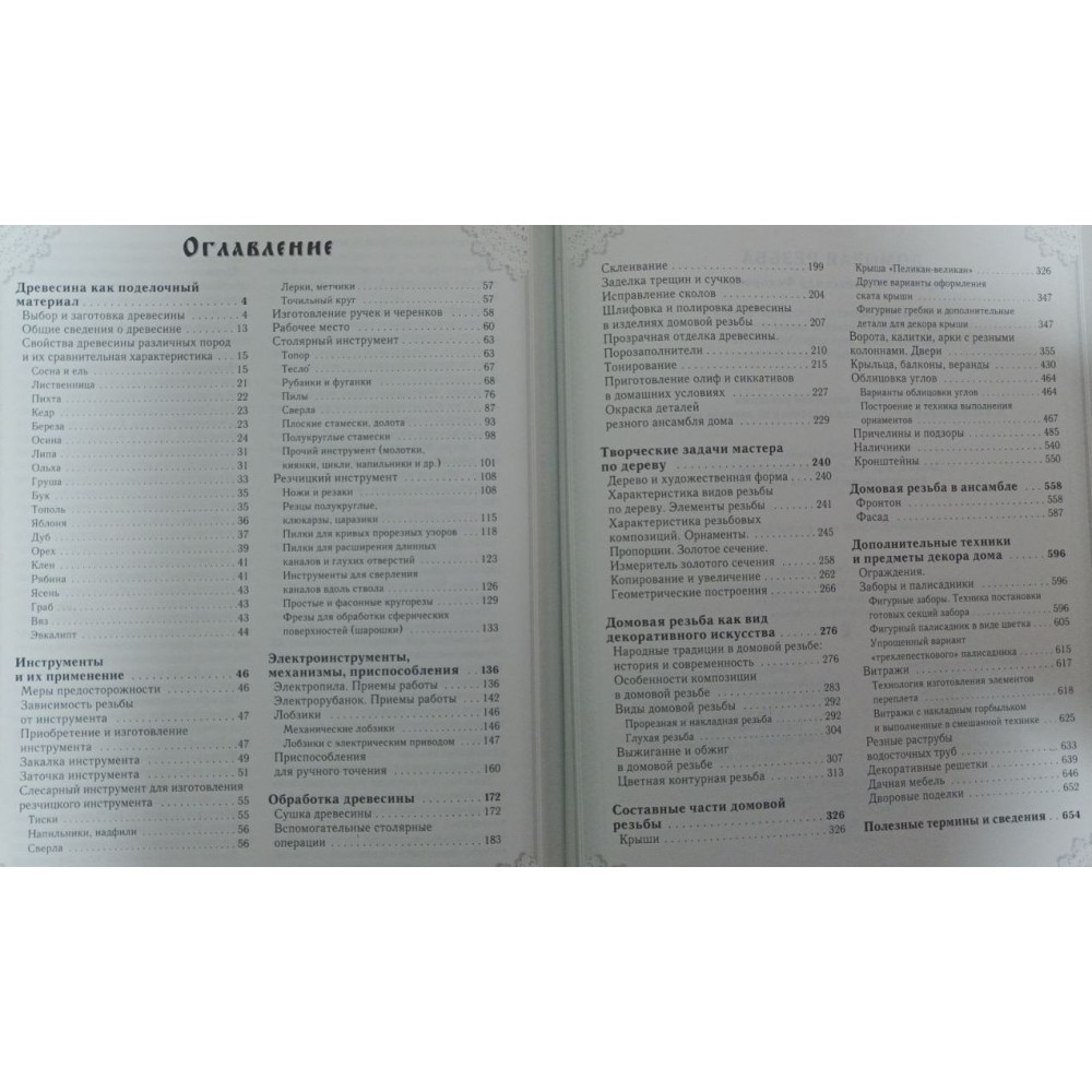 Букіністичне видання. У книзі узагальнено багаторічний досвід автора у різьбленні по дереву. Наведено характеристики деревини різних порід, дано рекомендації щодо вибору та заготівлі матеріалу, докладним чином описані інструменти для різьблення та всілякі пристрої, їх виготовлення. Розказано про теорію прикладного мистецтва, описано побудову креслень та орнаментів. Читачами цієї книги можуть стати не тільки фахівці в різьбленні по дереву, а й люди, які цікавляться технікою різьблення, її застосуванням в оформленні власних заміських дач та котеджів.