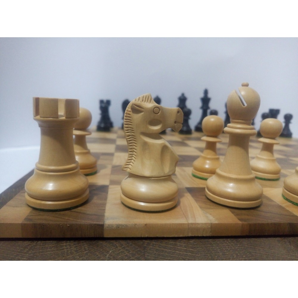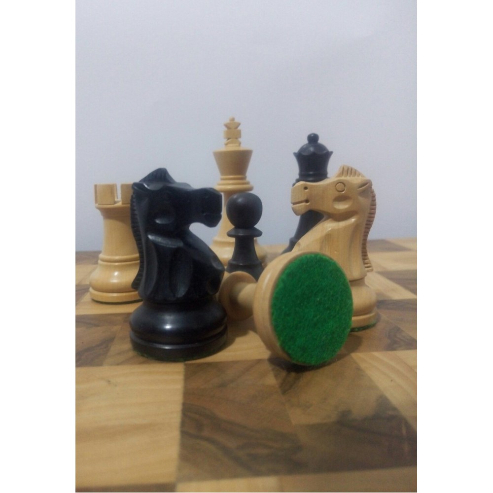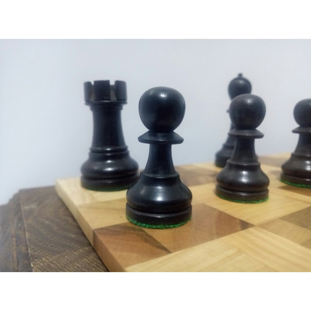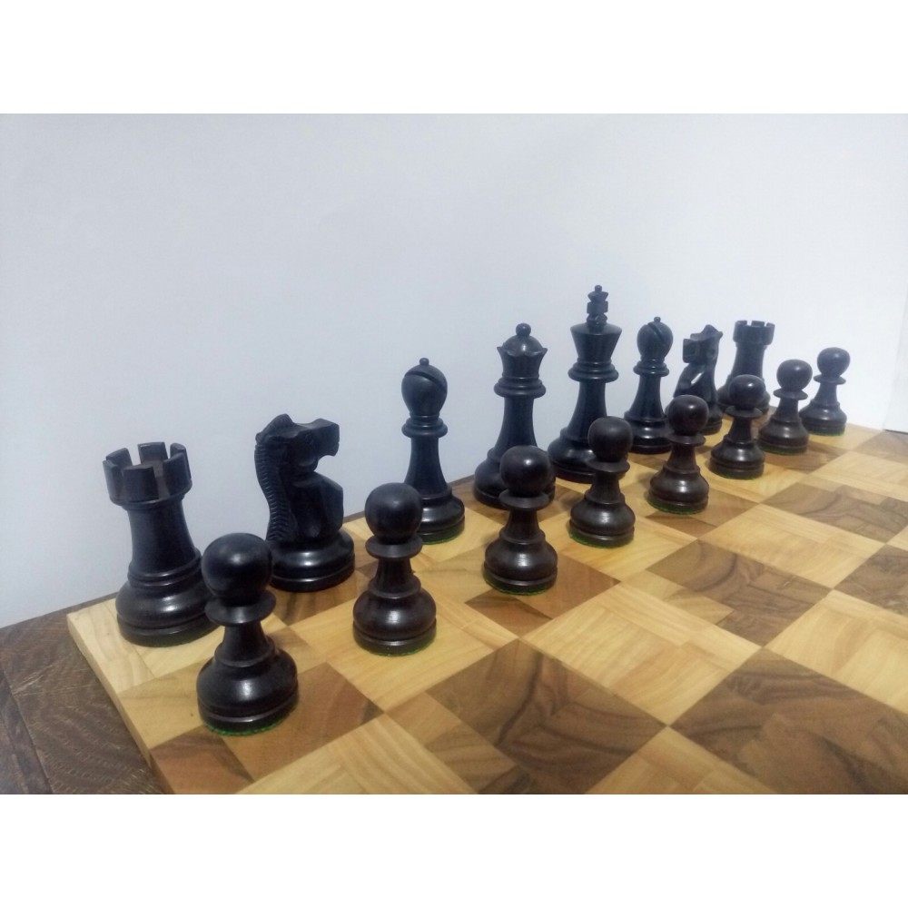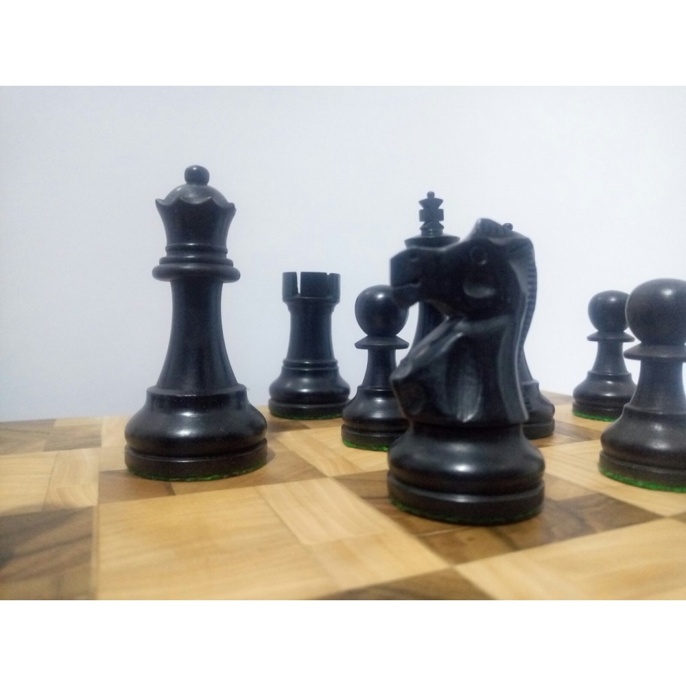 Шахові фігури з цільного дерева з металевим обтяжувачем всередині.  Білі – самшит, чорні – EBONISED (фарбоване дерево). Фігури ручної роботи. Основи фігур покриті зеленим сукном. Вага комплекту – 850 грам. Виробництво Індія.