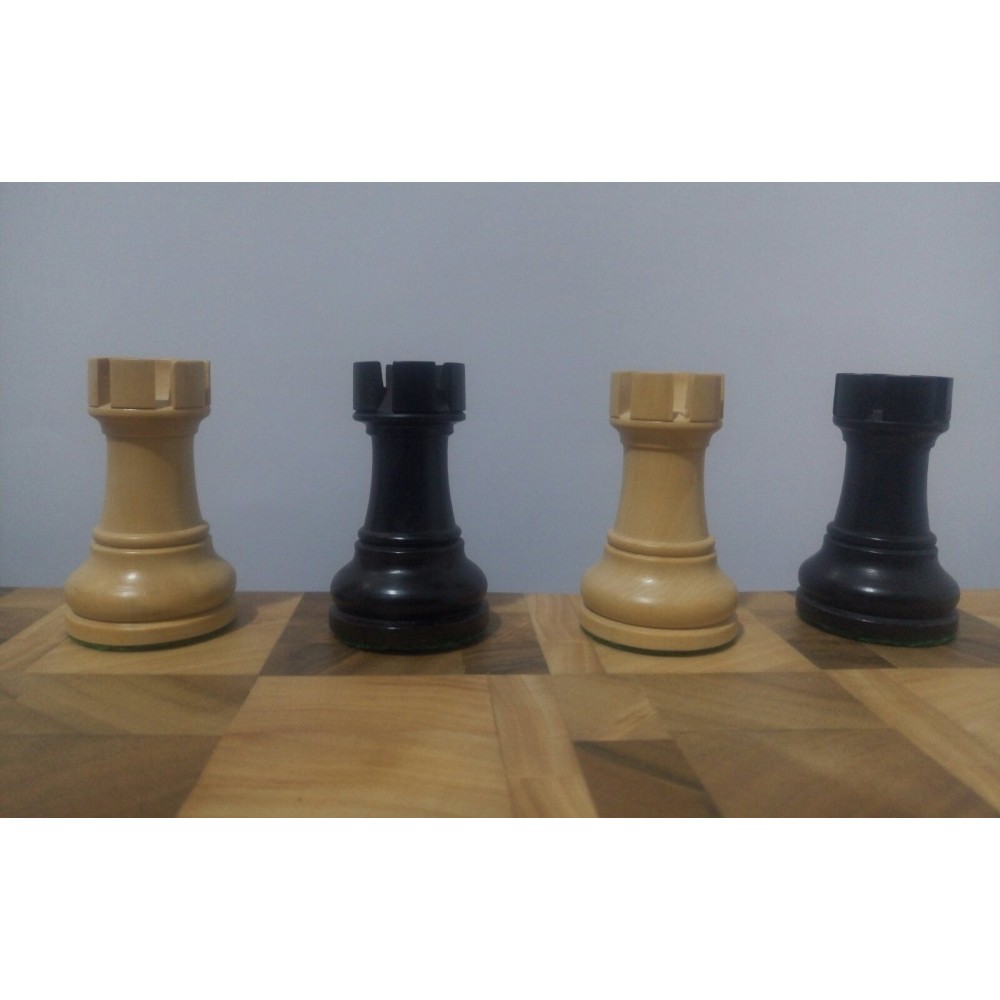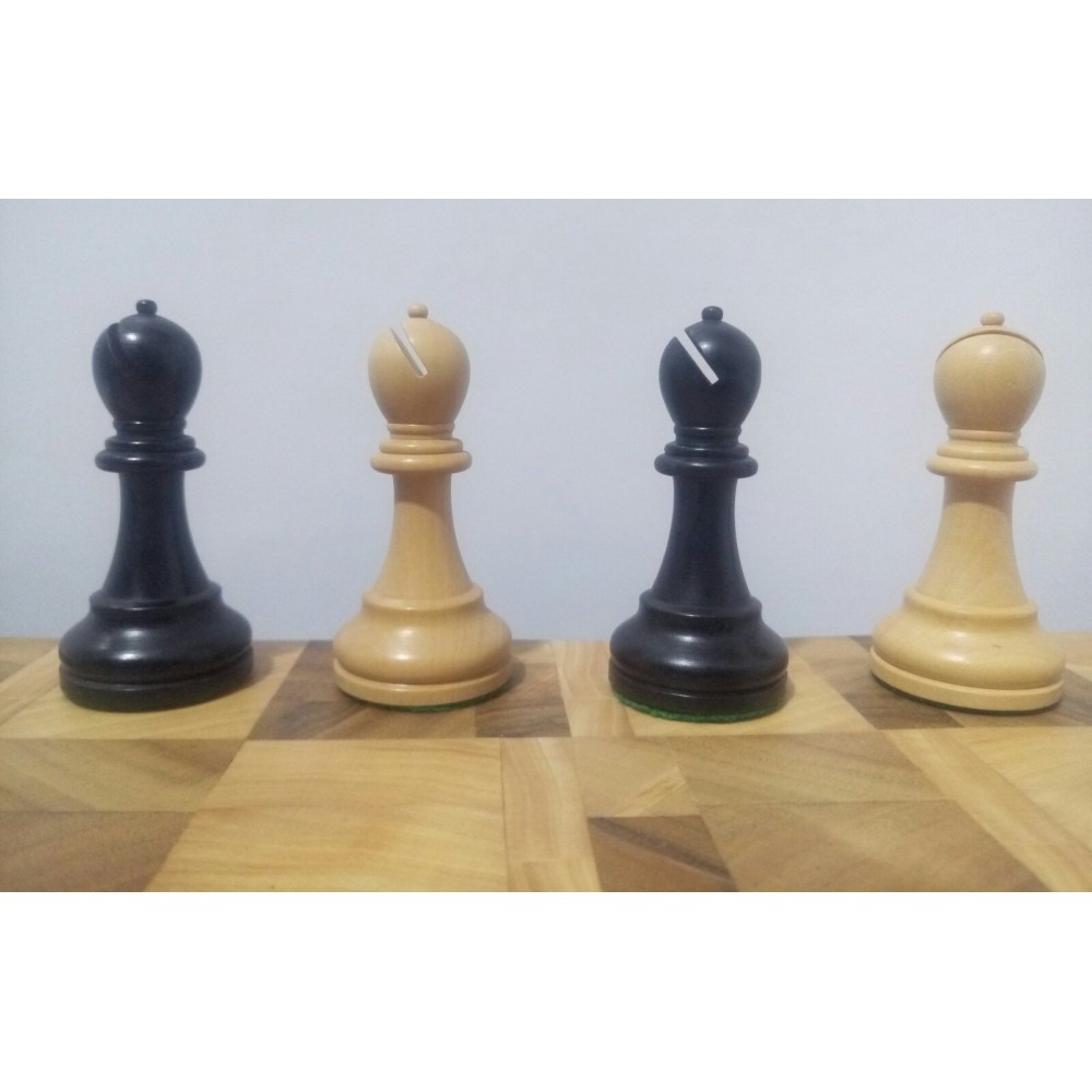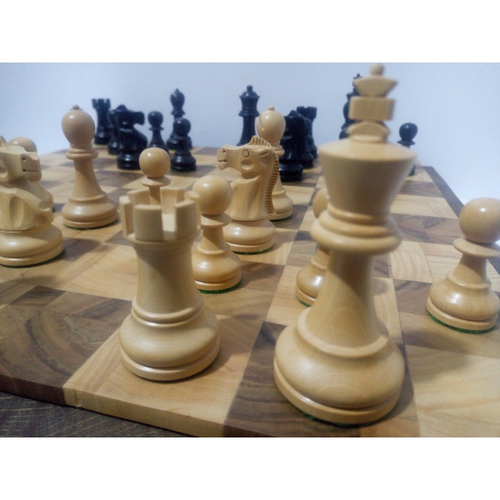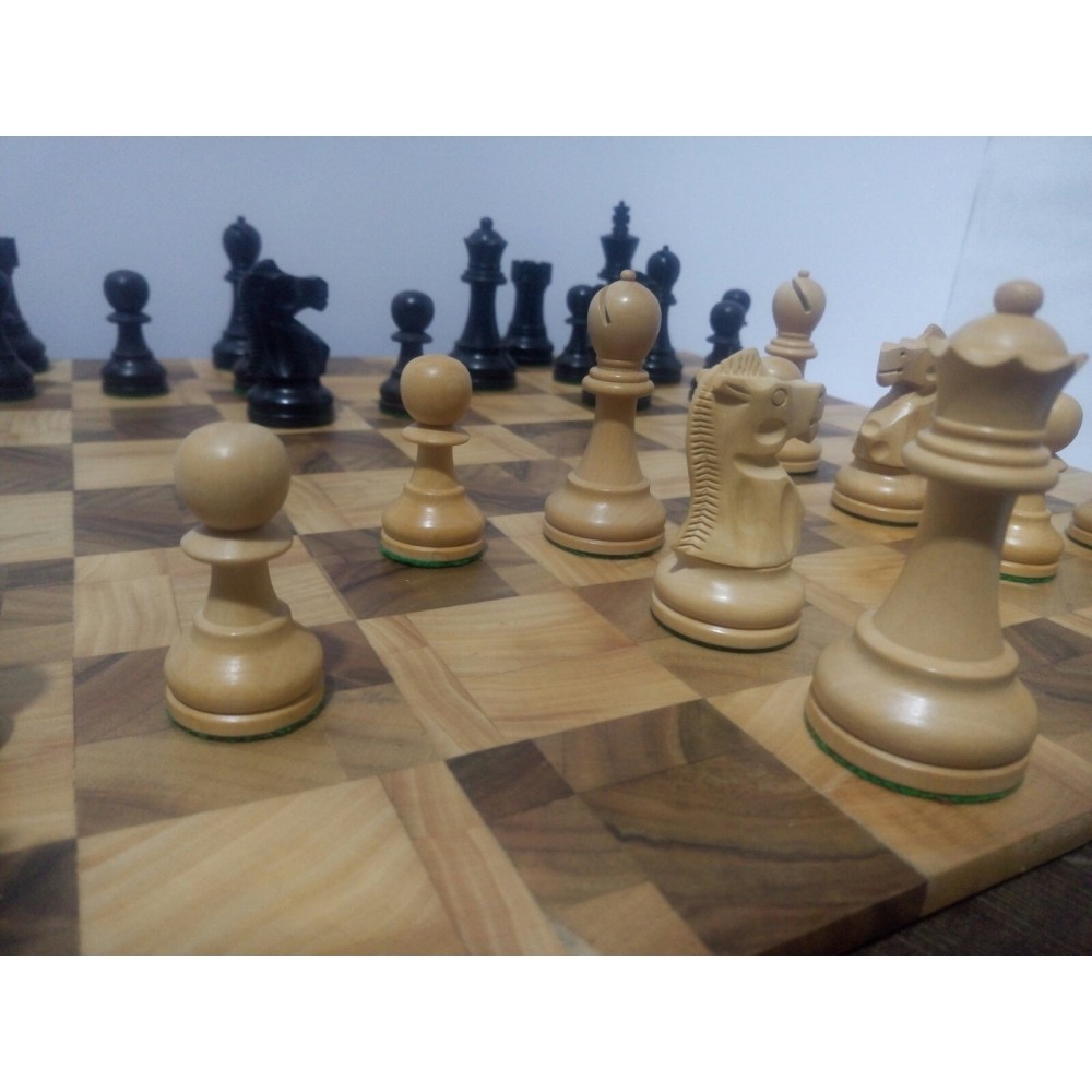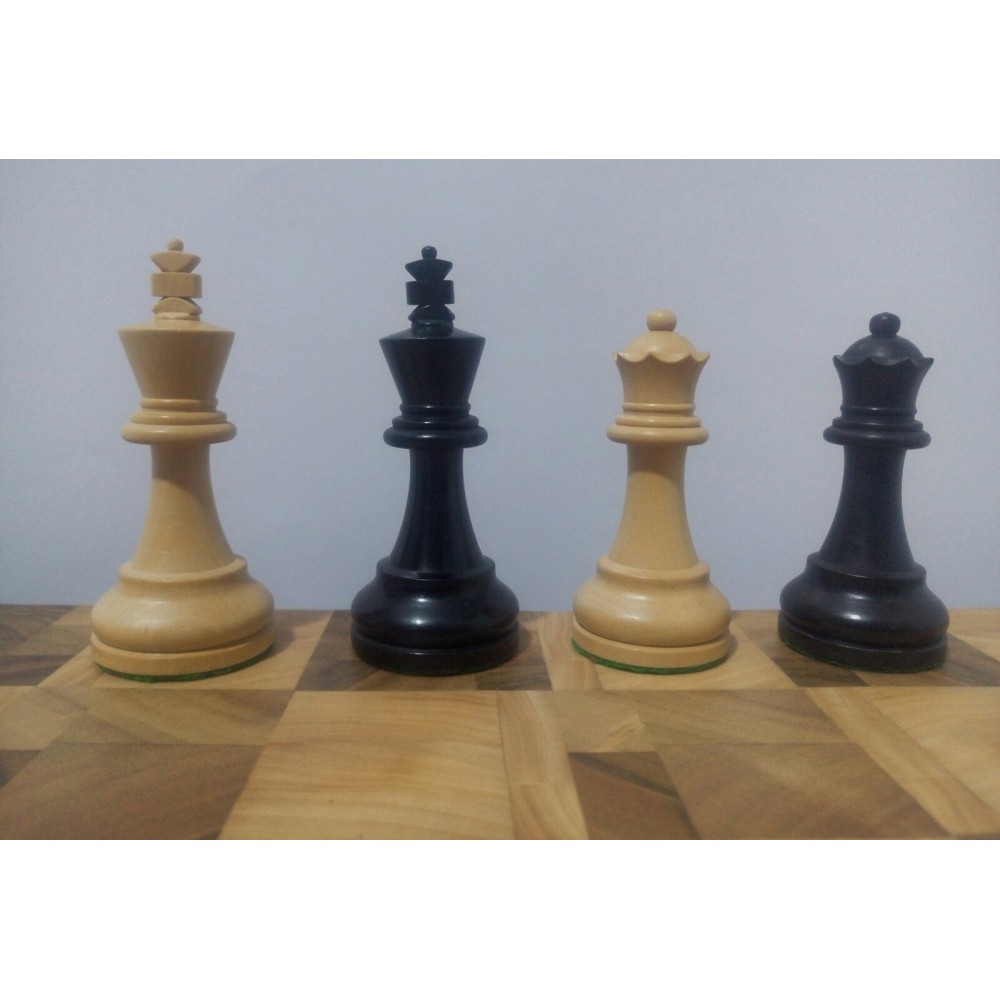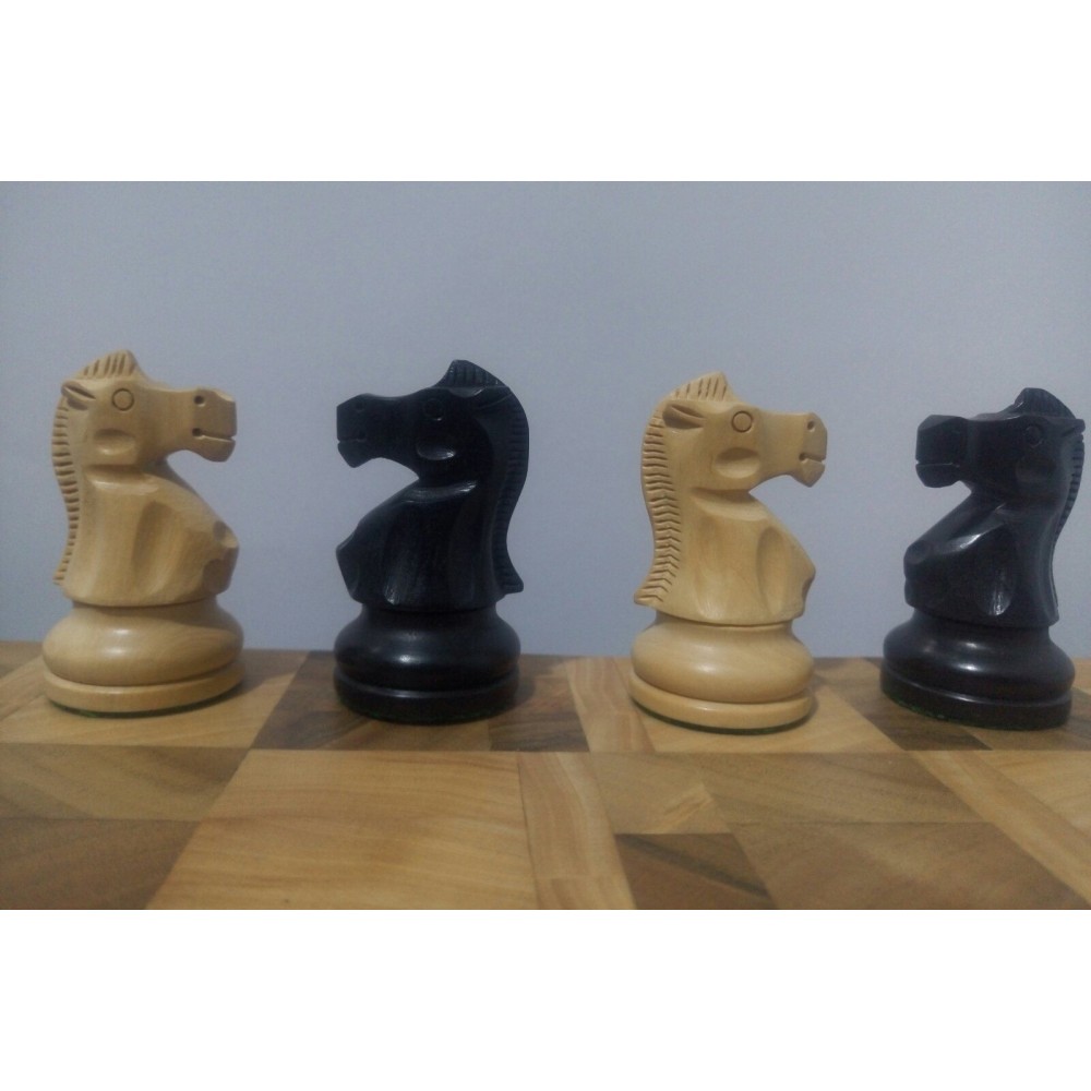 Шахові фігури з цільного дерева з металевим обтяжувачем всередині.  Білі – самшит, чорні – EBONISED (фарбоване дерево). Фігури ручної роботи. Основи фігур покриті зеленим сукном. Вага комплекту – 850 грам. Виробництво Індія.