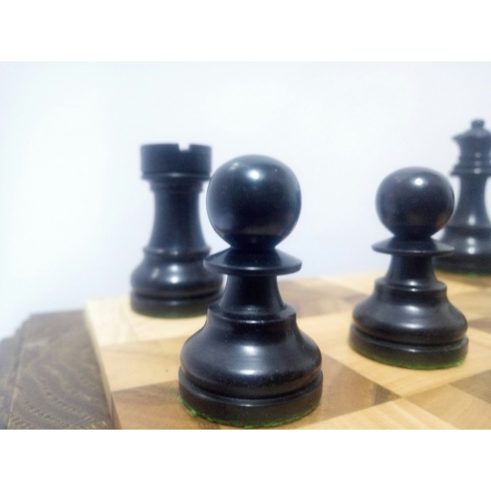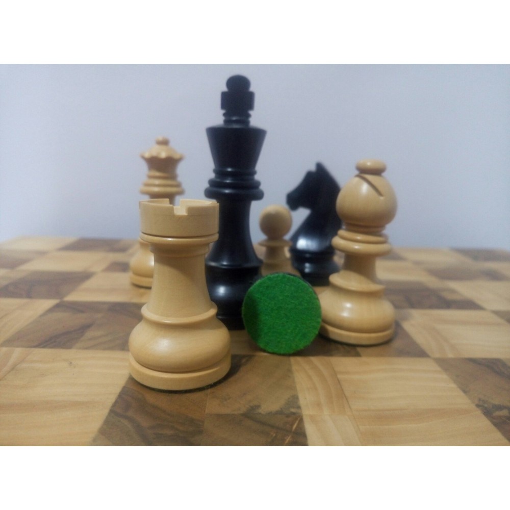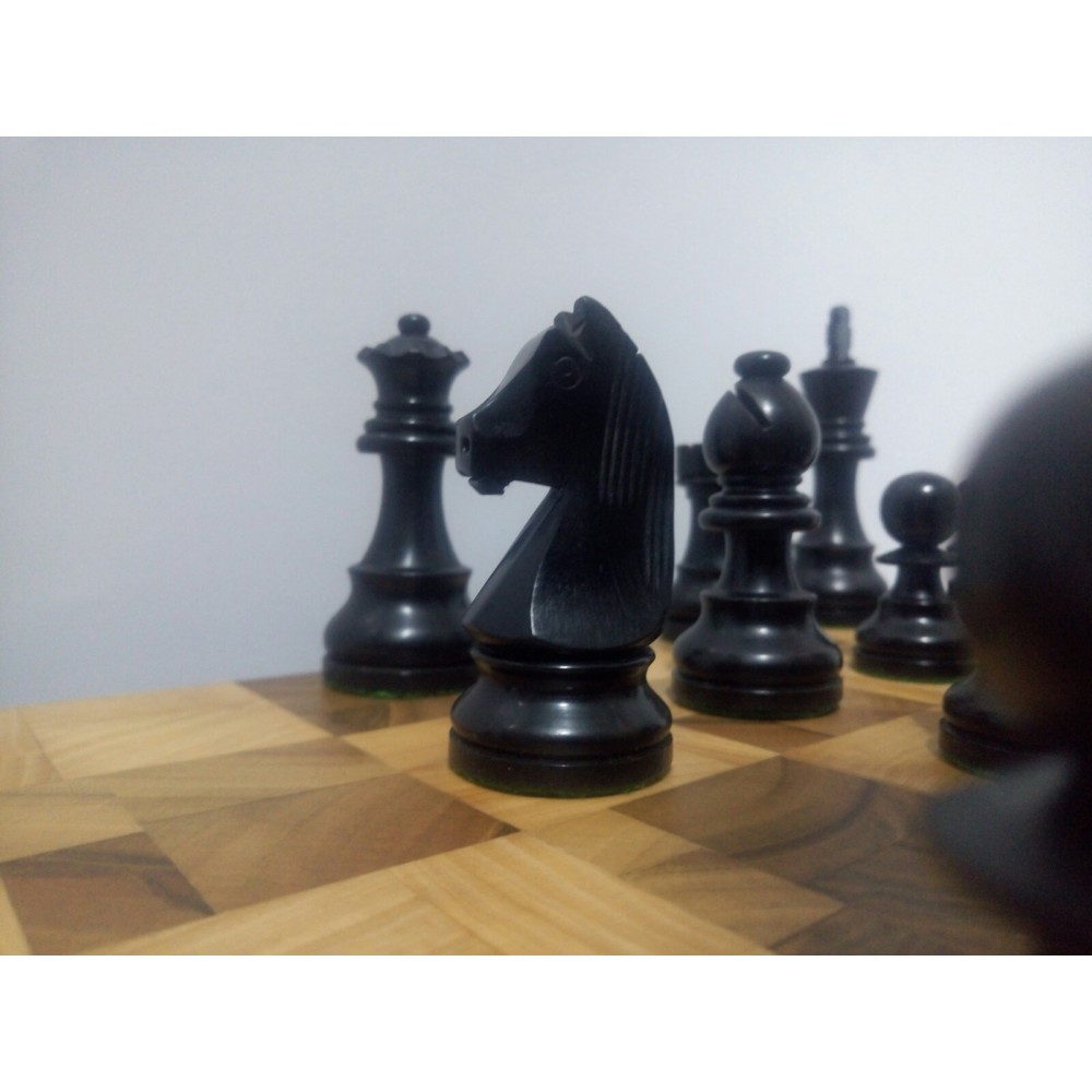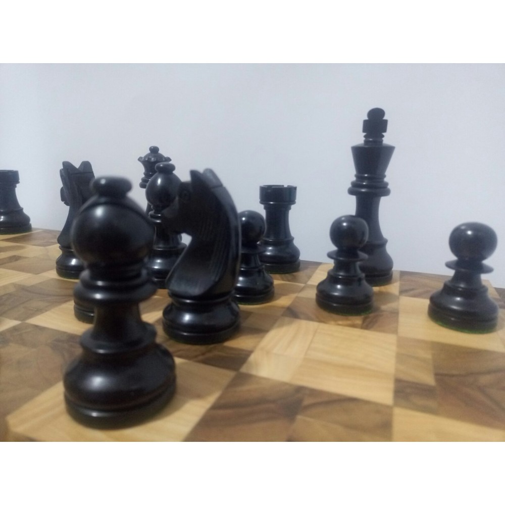 Шахові фігури з цільного дерева з металевим обтяжувачем всередині. Білі – самшит, чорні – EBONISED (фарбоване дерево). Фігури ручної роботи. Основи фігур покриті зеленим сукном. У наборі є два додаткові ферзи. Вага комплекту – 800 грам. Виробництво Індія.