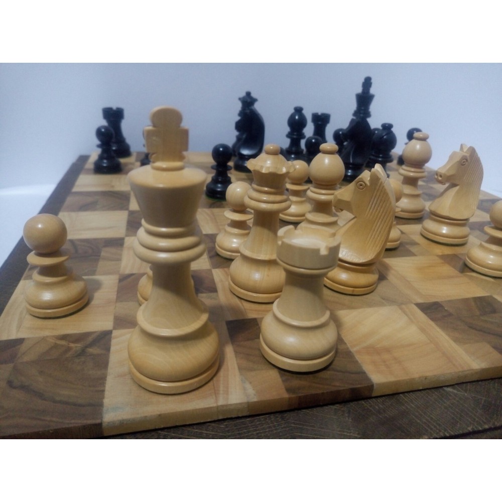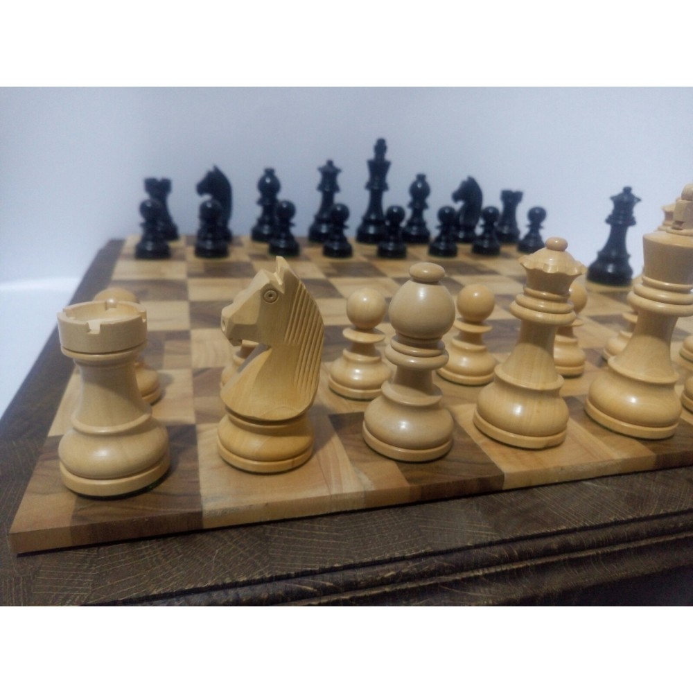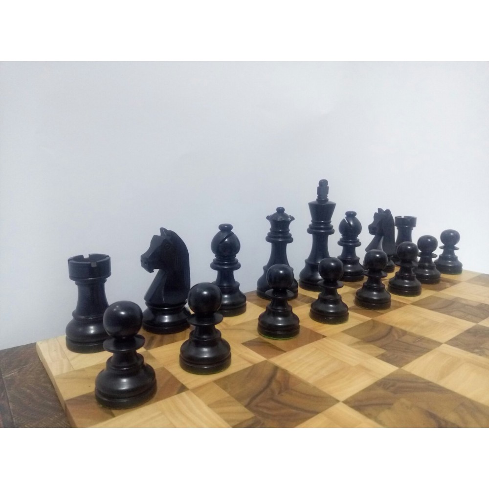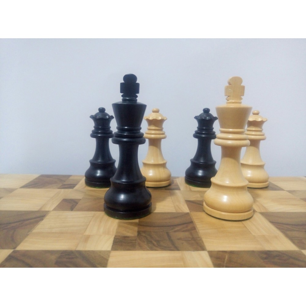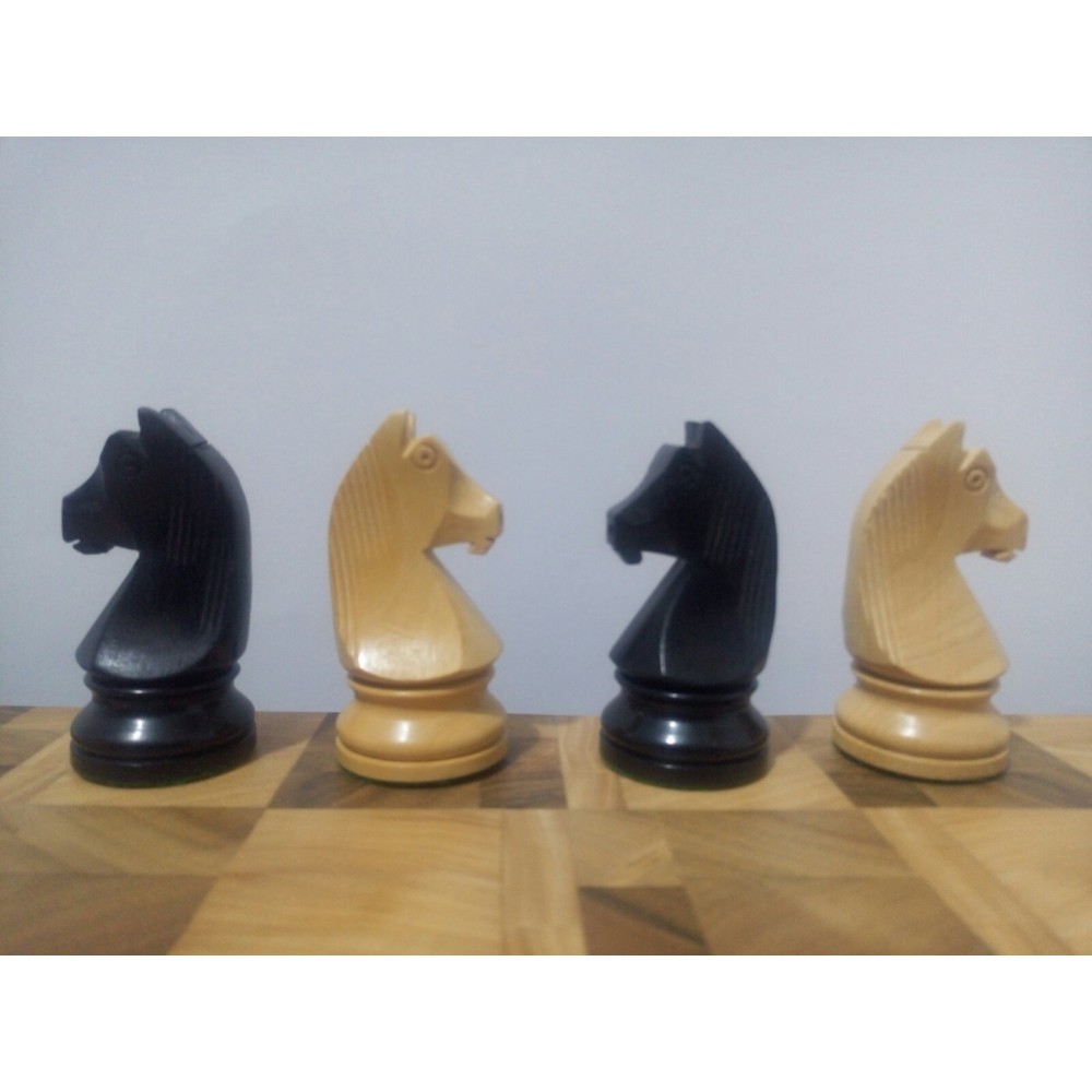 Шахові фігури з цільного дерева з металевим обтяжувачем всередині. Білі – самшит, чорні – EBONISED (фарбоване дерево). Фігури ручної роботи. Основи фігур покриті зеленим сукном. У наборі є два додаткові ферзи. Вага комплекту – 800 грам. Виробництво Індія.