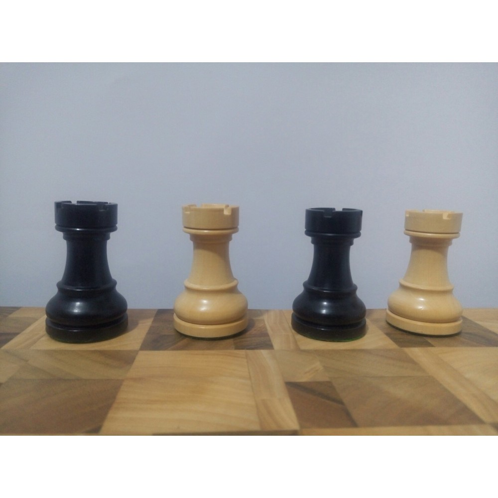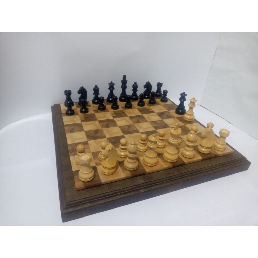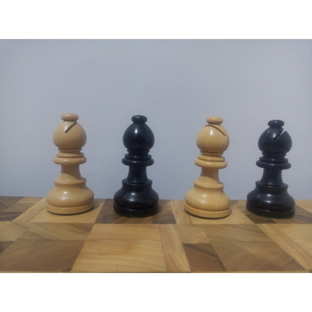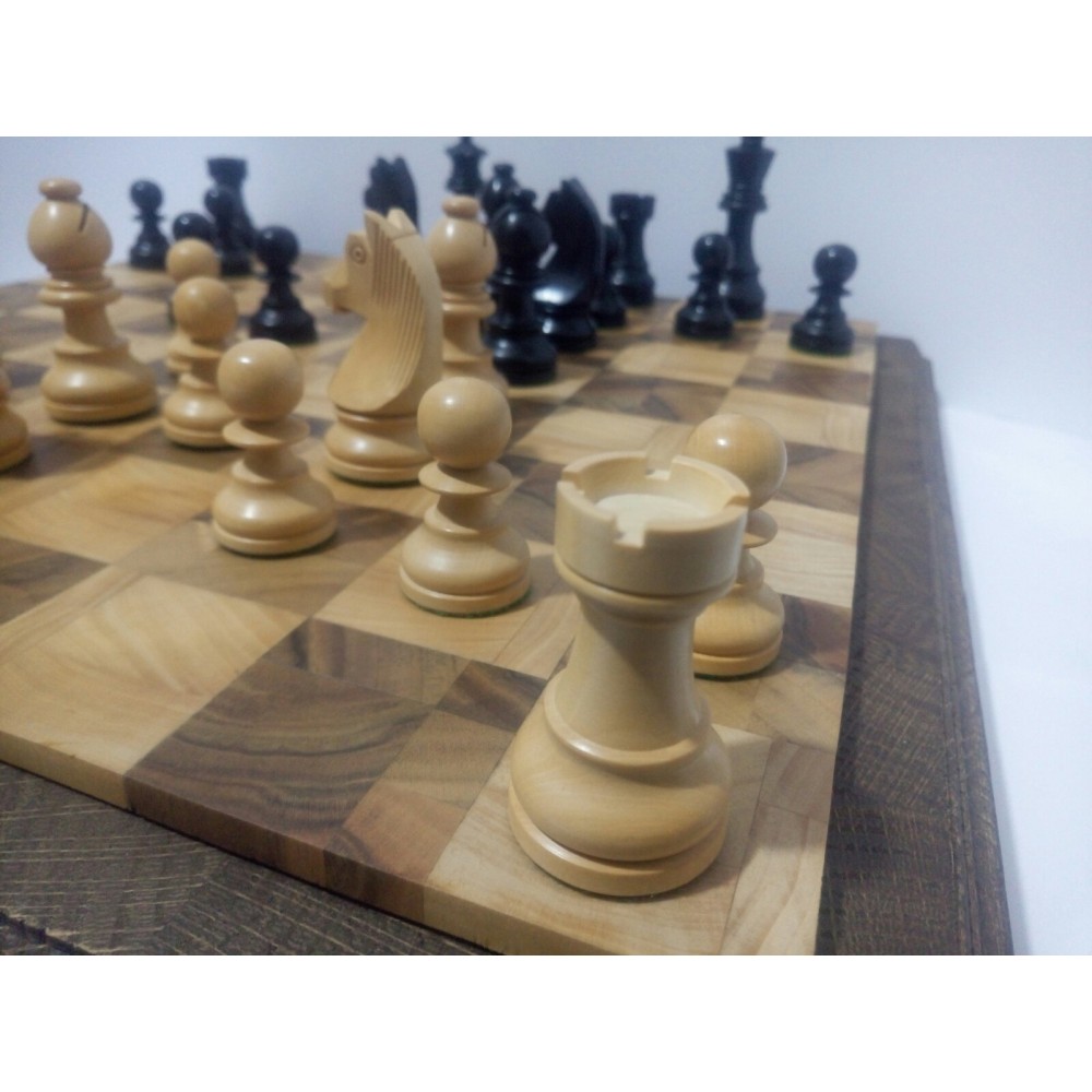 Шахові фігури з цільного дерева з металевим обтяжувачем всередині. Білі – самшит, чорні – EBONISED (фарбоване дерево). Фігури ручної роботи. Основи фігур покриті зеленим сукном. У наборі є два додаткові ферзи. Вага комплекту – 800 грам. Виробництво Індія.