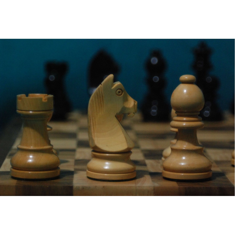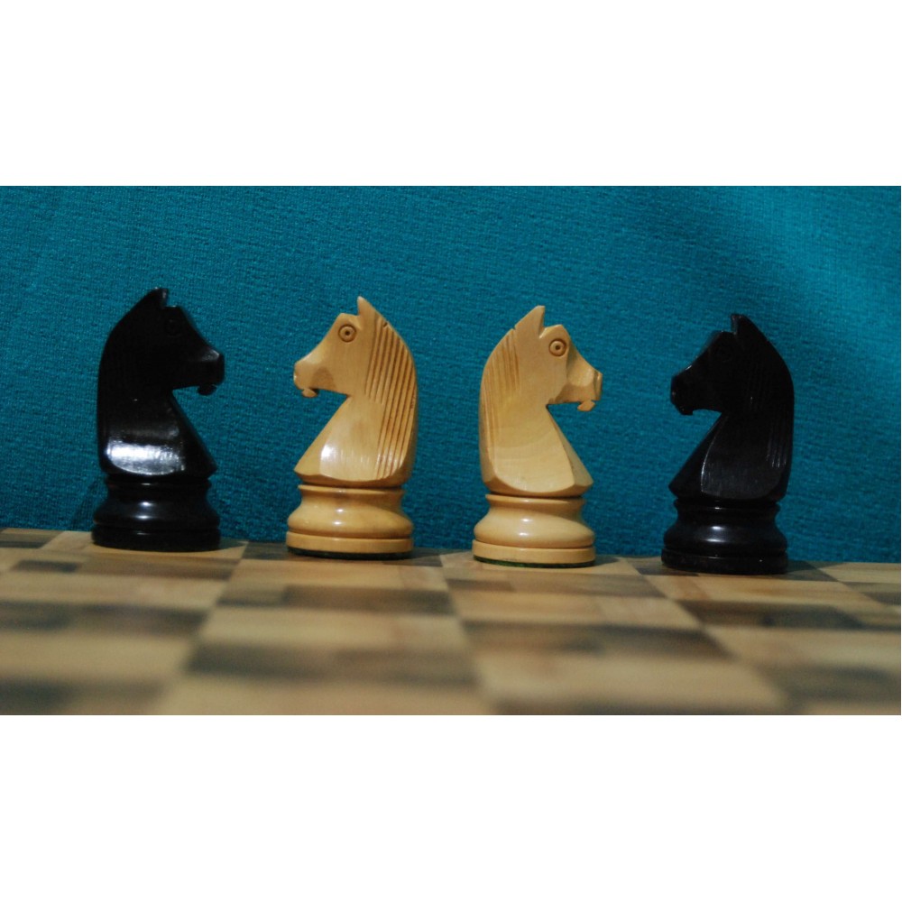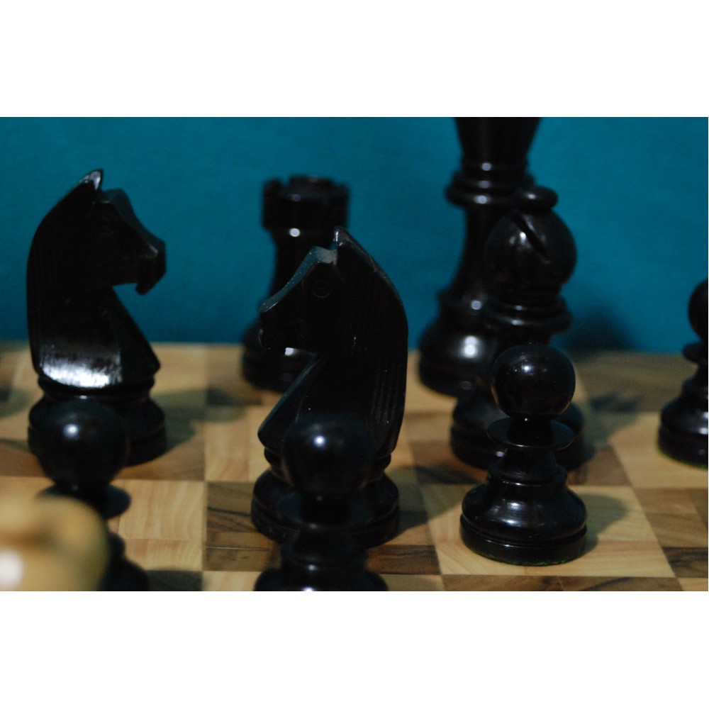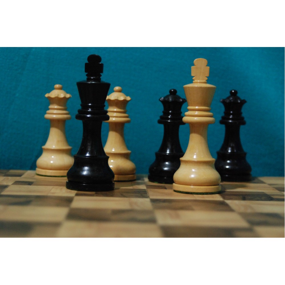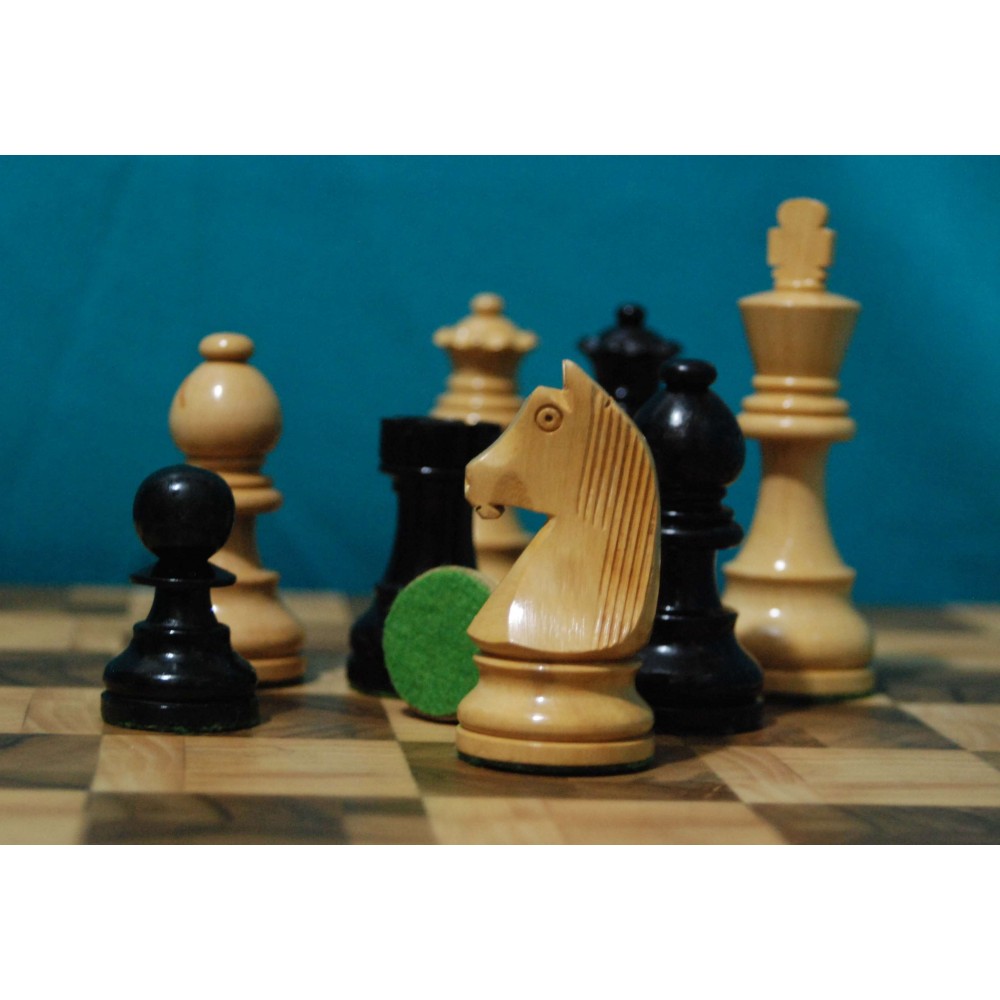 Шахові фігури з цільного дерева з металевим обтяжувачем всередині.  Білі – самшит, чорні – EBONISED (фарбоване дерево) + додатковий лак). Фігури ручної роботи. Основи фігур покриті зеленим сукном. У наборі є два додаткові ферзи. Вага комплекту – 800 грам. Виробництво Індія.