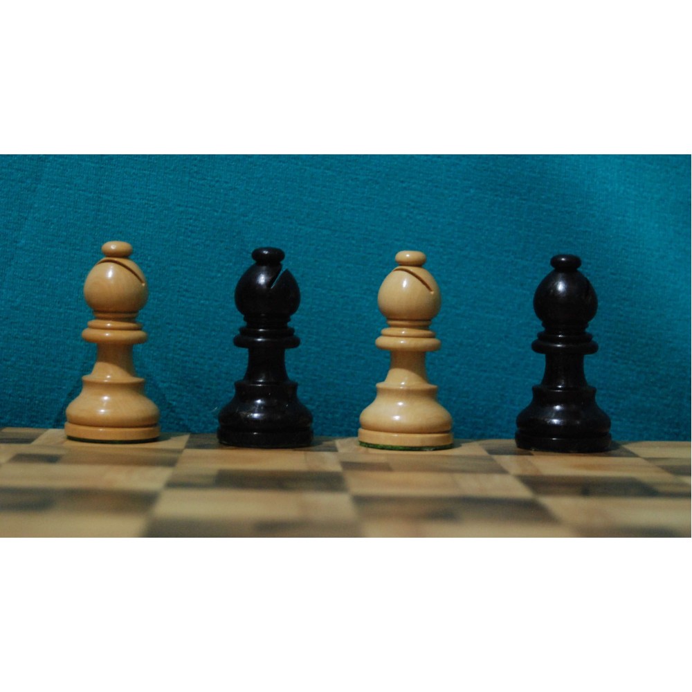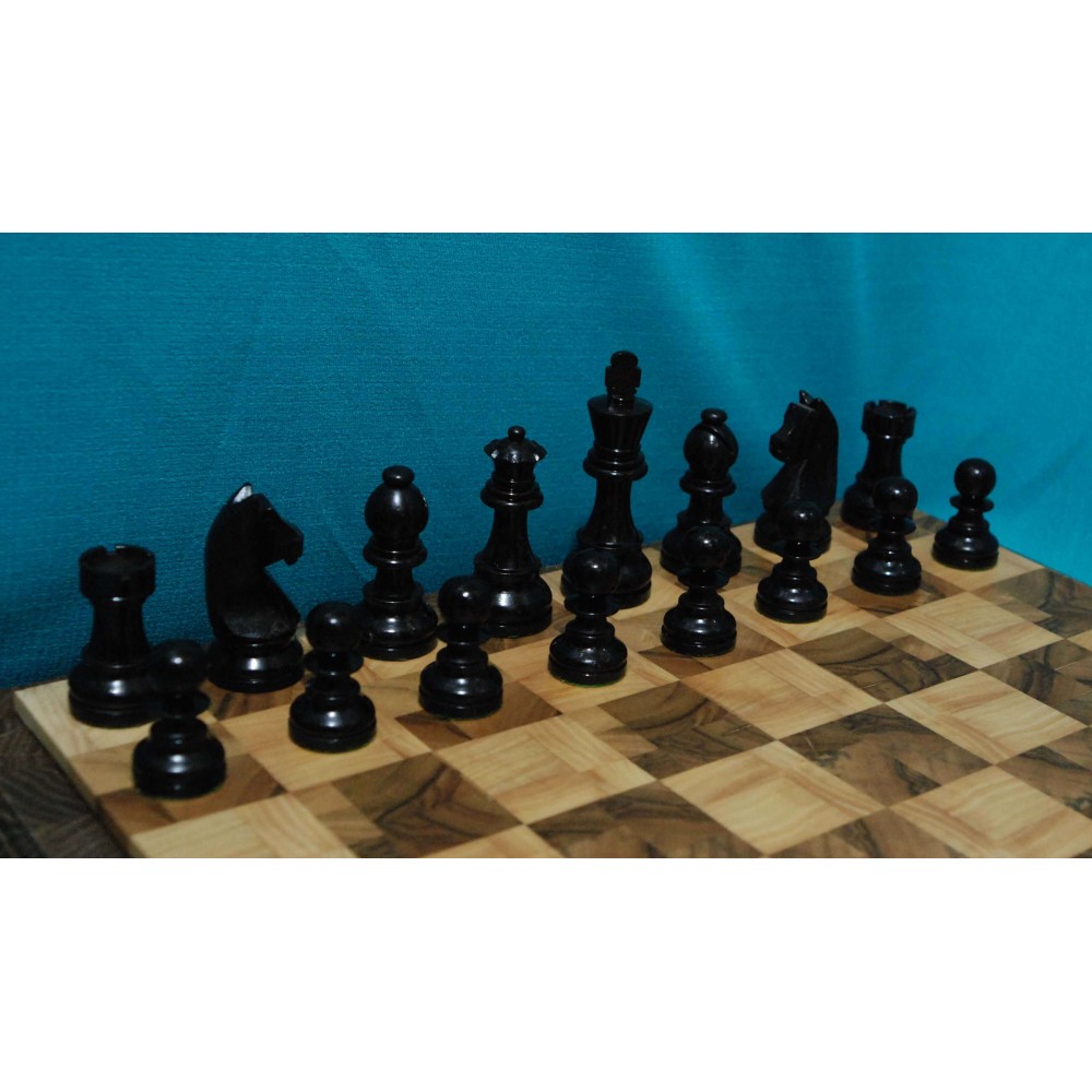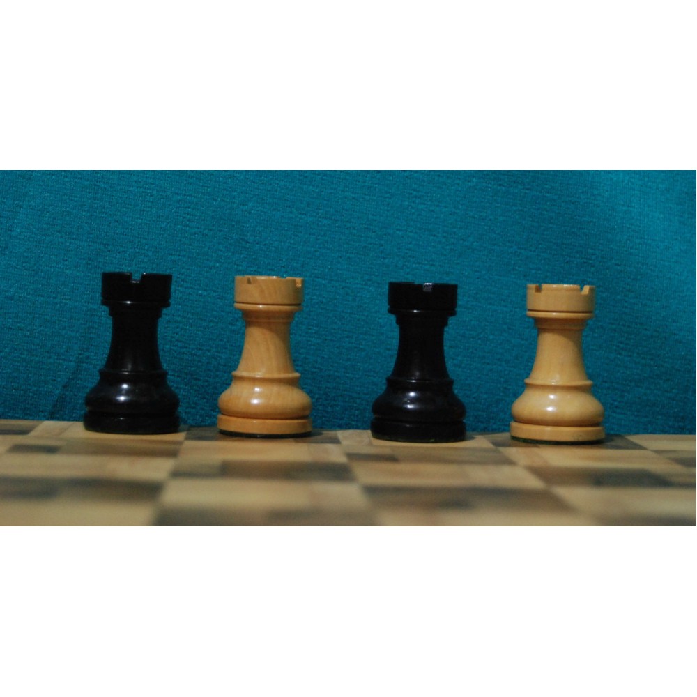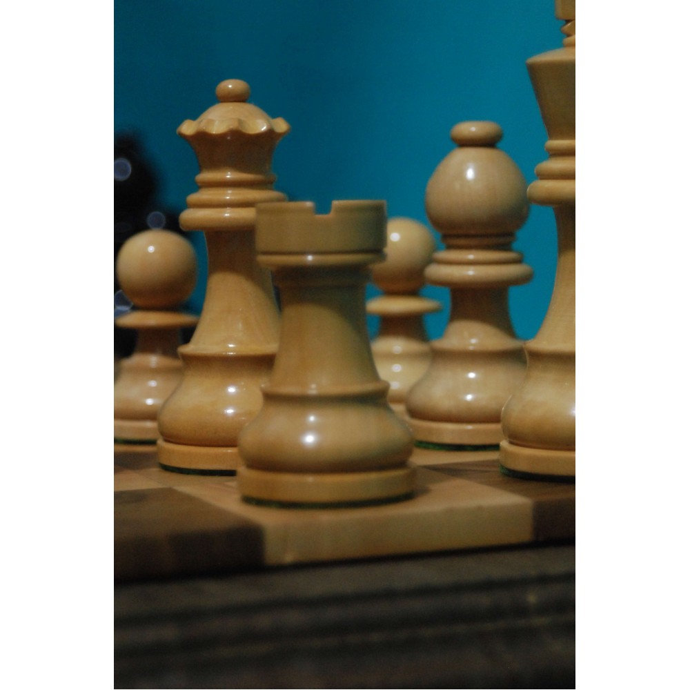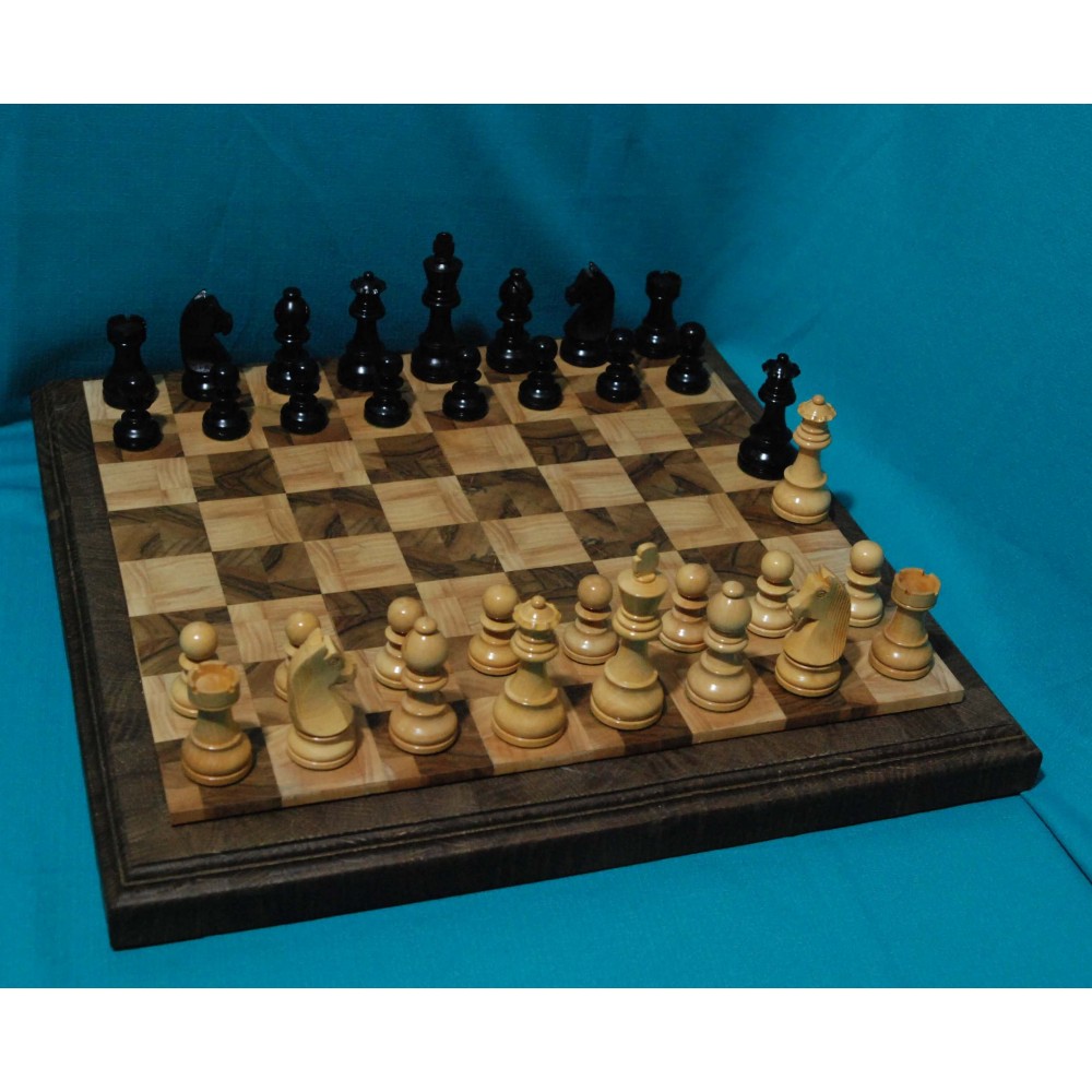 Шахові фігури з цільного дерева з металевим обтяжувачем всередині.  Білі – самшит, чорні – EBONISED (фарбоване дерево) + додатковий лак). Фігури ручної роботи. Основи фігур покриті зеленим сукном. У наборі є два додаткові ферзи. Вага комплекту – 800 грам. Виробництво Індія.