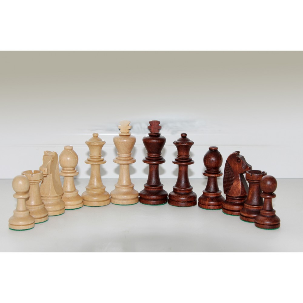 Шахові фігури з цільного дерева (клен) з металевим обтяжувачем усередині. Класичні стаунтонівські постаті. Чи не лаковані (не бликують). Основи фігур покриті зеленим сукном. Вага – 700 грам. Виробництво Польща.