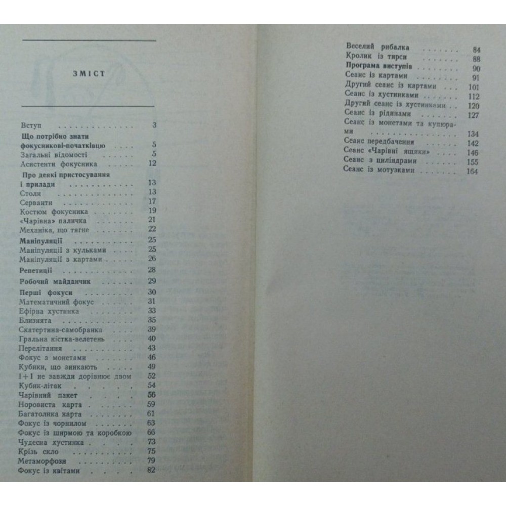 Все частіше у концертах мистецької самодіяльності виступають фокусники-аматори. Ця книга познайомить ілюзіоністів-початківців з секретами різних фокусів, допоможе самостійно виготовити необхідний реквезит і апаратуру. Підкаже, як уникнути помилок та зробити виступи цікавими та оригінальними.