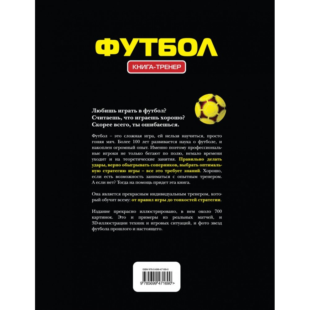 Перед вами книга-тренер, в якій зібрано всю необхідну інформацію для підготовки сучасних футболістів. Видання навчить усьому: від правил гри до тонкощів стратегії. Книга чудово ілюстрована – у ній близько 700 зображень. Це приклади із реальних матчів та 3D-ілюстрації технік та ігрових ситуацій, а також фотографії легендарних футболістів. Перед вами унікальна книжка-тренер. У ній зібрано всю необхідну інформацію для підготовки сучасних футболістів. Видання навчить усьому: від правил гри до тонкощів стратегії. Книга чудово ілюстрована – у ній близько 700 зображень. Це приклади із реальних матчів та 3D-ілюстрації технік та ігрових ситуацій, а також фотографії легендарних футболістів. Ця книга відмінно підійде тренерам і футболістам-початківцям.