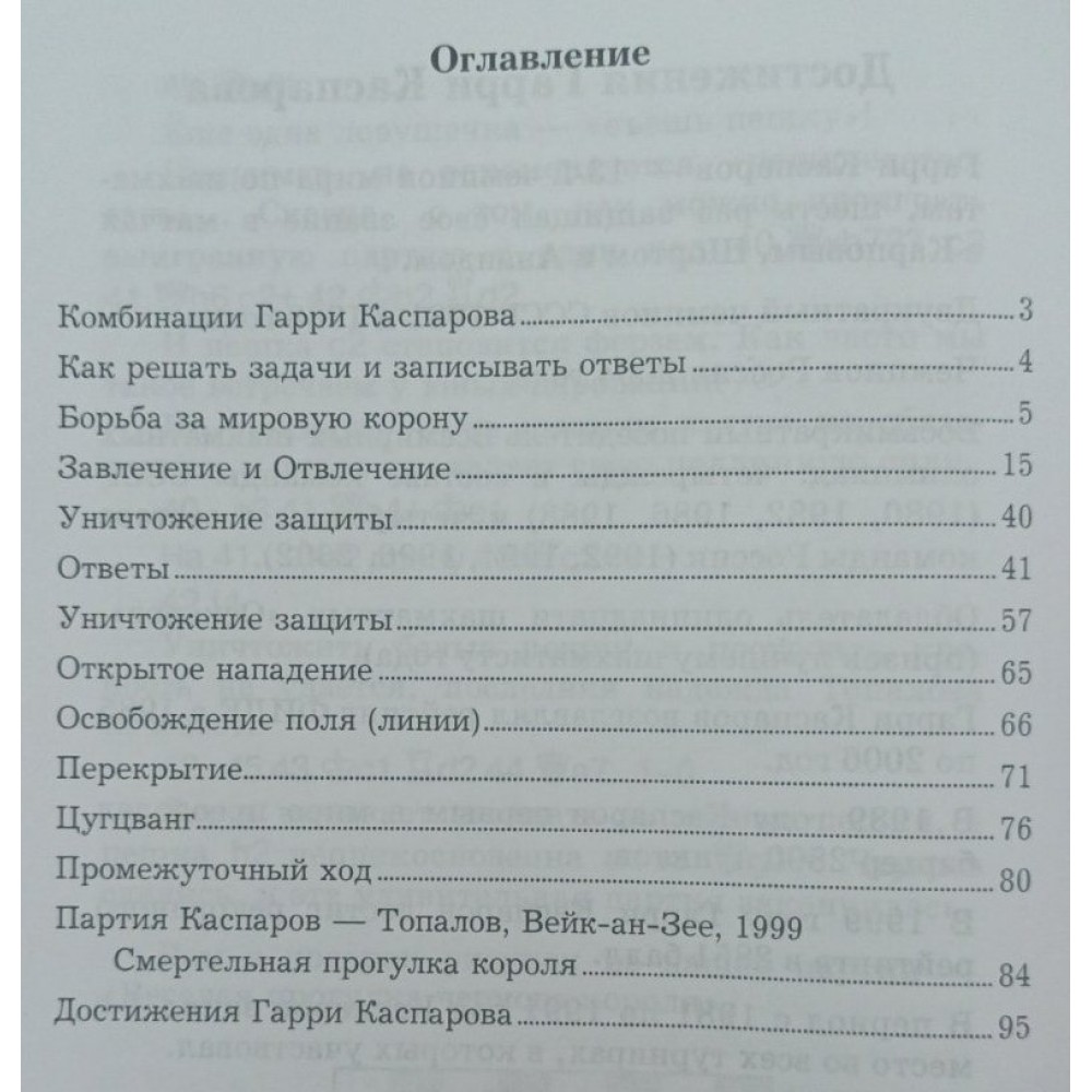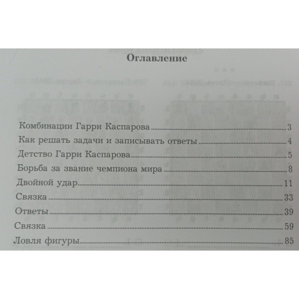 Ви тримаєте в руках задачник, складений за партіями Гаррі Каспарова — шахового генія, короля комбінаційної гри! Тут представлені найцікавіші шахі позиції з партій великого шахіста. Завдання знайти рішення в ситуаціях, з якими в ході партії стикався Гаррі Каспаров. Решник буде цікавим не лише новачкам, а й шахістам високих розрядів, для яких відзначено завдання підвищеної складності. У 1-й книзі позиції систематизовані за темами: залучення та відволікання, знищення захисту, відкритий напад, звільнення лінії, перекриття та інші – тому тренери та котрі займаються самостійно зможуть використовувати їх як навчальний матеріал. У 2-й книзі позиції систематизовані за темами: залучення і відволікання, знищення захисту, відкритий напад, звільнення лінії, перекриття та інші — тому тренери та самостійно, що займаються, зможуть використовувати їх як навчальний матеріал. Вирішивши всі позиції, ви суттєво піднімете силу своєї гри і досягнете нових турнірних перемог. Книга складена Всеволодом Костровим — відомим шаховим тренером та автором понад 100 книг із шахів. Займаючись за його підручниками та задачниками, багато учнів з легкістю освоюють шахову науку та перетворюються на сильних шахістів!