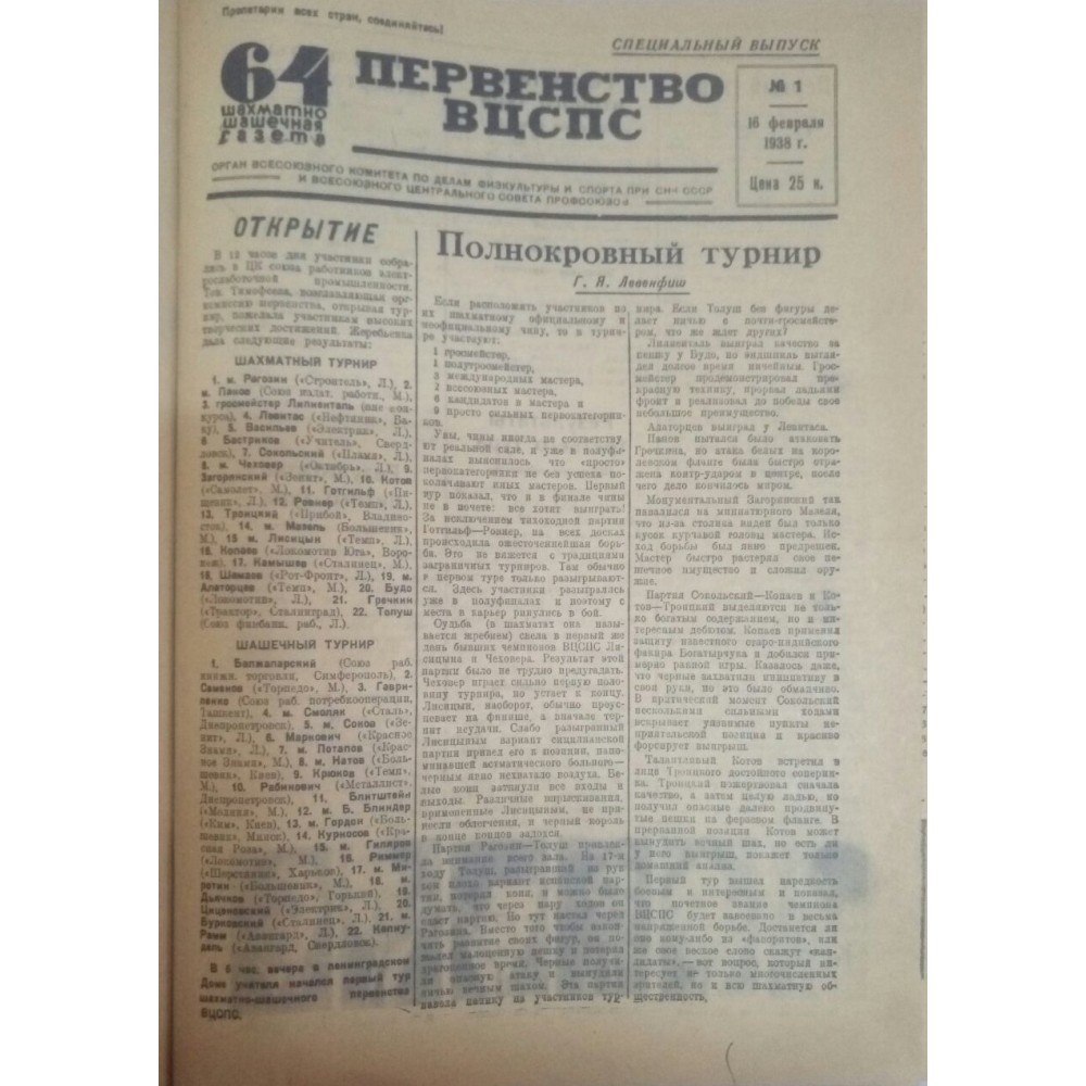 Першість ВЦРПС - всесоюзні особисті змагання за участю найсильніших шахістів профспілок. Результат: 1-2. В. Алаторцев, Л. Шамаєв - по 14 очок з 21 (обидва - чемпіони ВЦРПС); 3. А. Лілієнталь (поза конкурсом) - 13; 4-7. Н. Копаєв, В. Рагозін, Ровнер, Чеховер - по 12?; 8-10. Лісіцин, Сокольський, Толуш - по 12; 11. С. Готгільф - 11 ½; 12-13. В. Васильєв, Мазель - по 11; 14. А. Будо - 10 ½; 15. Д. Гречкін - 9 ½; 16. А. Котов - 9; 17. М. Камишов - 8 ½; 18. Загорянський - 8; 19. Панів - 7½; 20. П. Троїцький - 7; 21. Г. Бастриков - 6; 22. Н. Левітас - 4½.