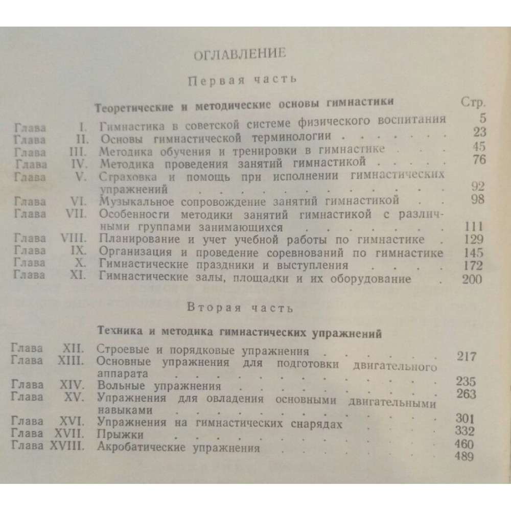 Підручник для технікумів фізичної культури. Зміст: Теоретичні та методичні засади гімнастики. Гімнастика у радянській системі фізичного виховання. Основи гімнастичної термінології Методика навчання та тренування в гімнастиці. Методика проведення занять гімнастикою. Страховка та допомога при виконанні гімнастичних вправ. Музичний супровід занять гімнастикою. Особливості методики занять гімнастикою з різними групами. Планування та облік навчальної роботи з гімнастики. Організація та проведення змагань з гімнастики. Гімнастичні свята та виступи. Гімнастичні зали, майданчики та їх обладнання. Техніка та методика-гімнастичних вправ. Стройові та порядкові вправи. Основні вправи на підготовку рухового апарату. Вільні вправи. Вправи для оволодіння основними руховими навичками. Вправи на гімнастичних снарядах. Стрибки. Акробатичні вправи.