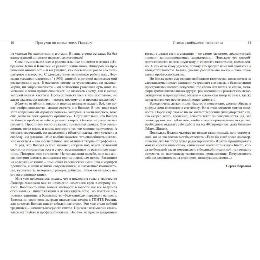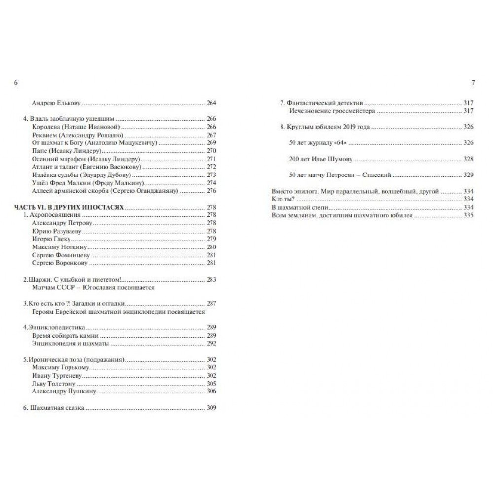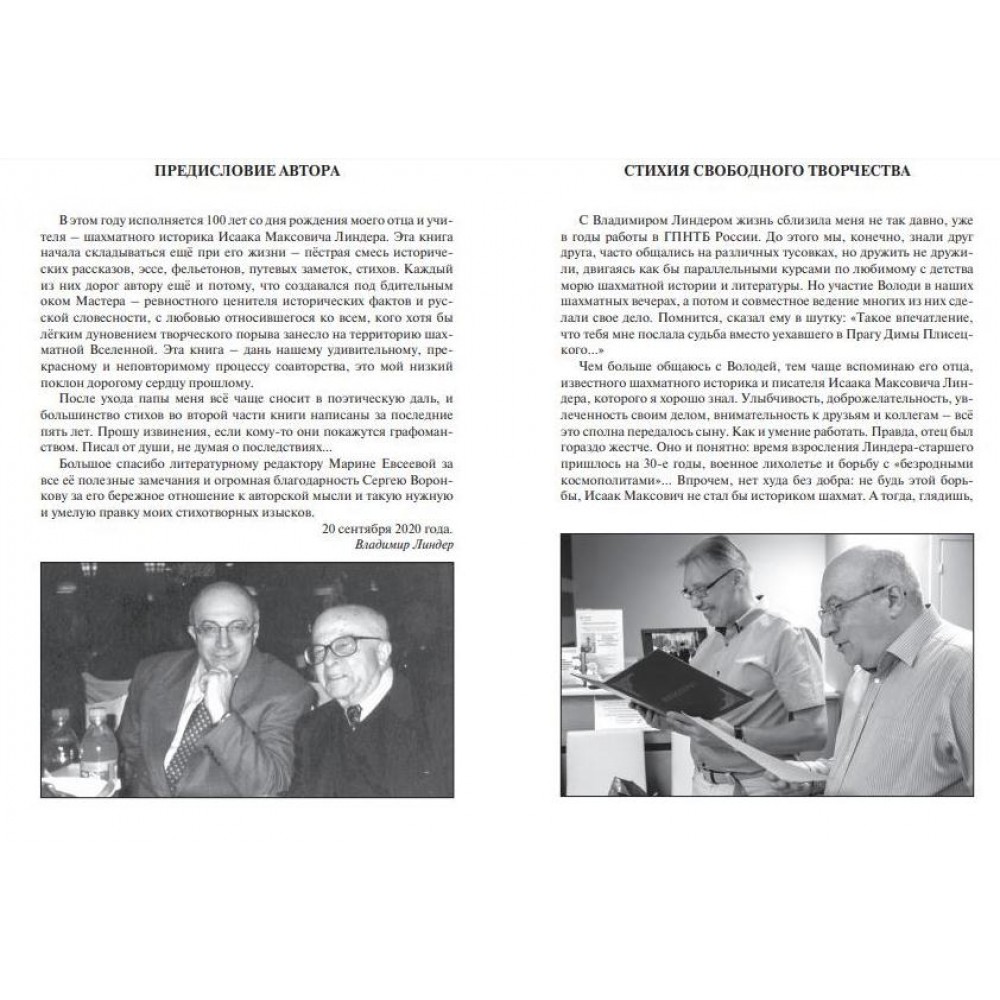 Шановний читачу! У твоїх руках збірка найдорожчих і найпам'ятніших автору творів – і давно написаних, і кілька десятиліть, що пролежали в архіві, і народилися останніми роками. Мої проби пера в найрізноманітніших літературних жанрах, включаючи поетичний, завжди дивували та радували тата – історика шахів Ісаака Ліндера. Суворий ревнитель шахового «класицизму» та історичного реалізму сміливо взяв у співавтори вільнодумця і, як сказали б критики з його улюбленого 19 століття, борзописця. І треба сказати, «стиковка» пройшла успішно. Я не без задоволення став писати історичні оповідання, а він почав дозволяти собі елегантні мистецькі відступи. Понад чверть століття ми чудово розуміли і доповнювали один одного… Ця книга присвячена 100-річному ювілею пристрасного пропагандиста шахової культури, шахового енциклопедиста, письменника та мудреця Ісаака Максовича Ліндера, вона – подяка та уклін його світлої пам'яті. Серед її героїв – люди, які волею долі пов'язали своє життя з Шахматами.