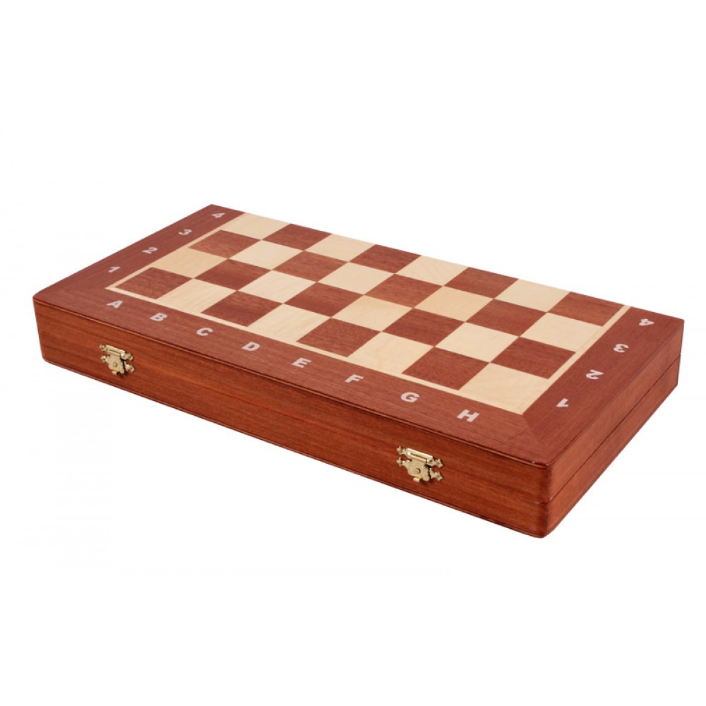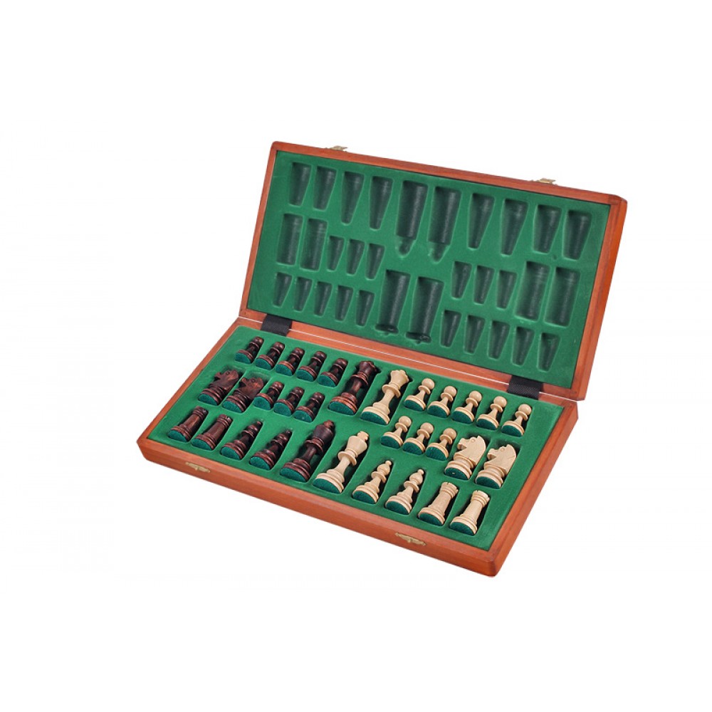 Ця модель шахів виготовлена за технологією "Маркетрі". Ця технологія використовувалася у Стародавньому Єгипті. Шпон двох порід дерева (темного та світлого) вирізуються під певним кутом і склеюються, за принципом мозаїки, разом. В результаті виходить шахова дошка з темними та світлими клітинами ручної роботи. Хороша якість виробу, зручна шахівниця, обважнені, різьблені фігури. Шахи стануть чудовим подарунком як досвідченому гравцю, так і шахісту-початківцю. Матеріал – клен. Розмір: 420x210x50 мм. (У закритому положенні). Дерев'яні фігури з масиву клена. Висота короля – 85 мм. Вага виробу – 1,6 кг. Виробник: Польща.