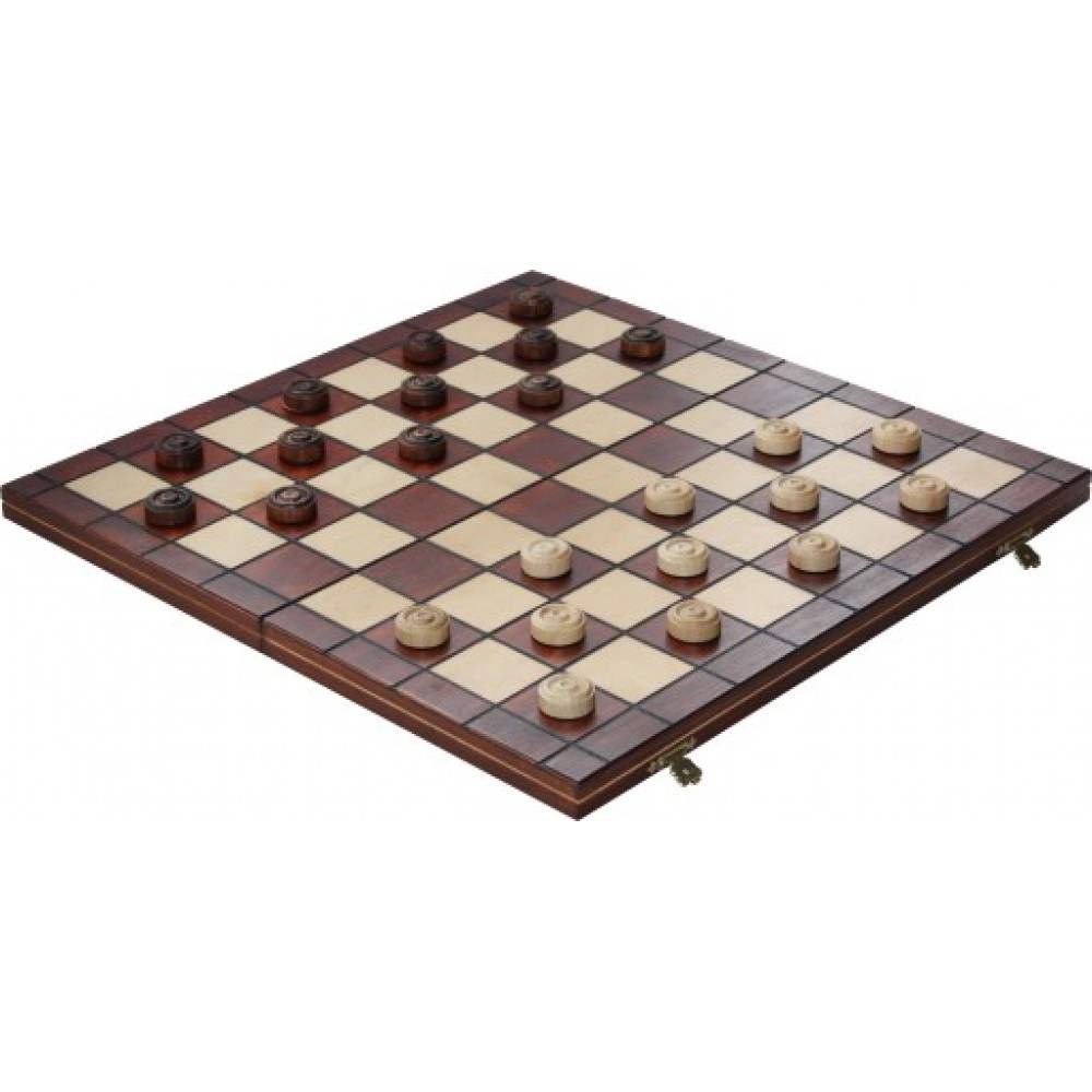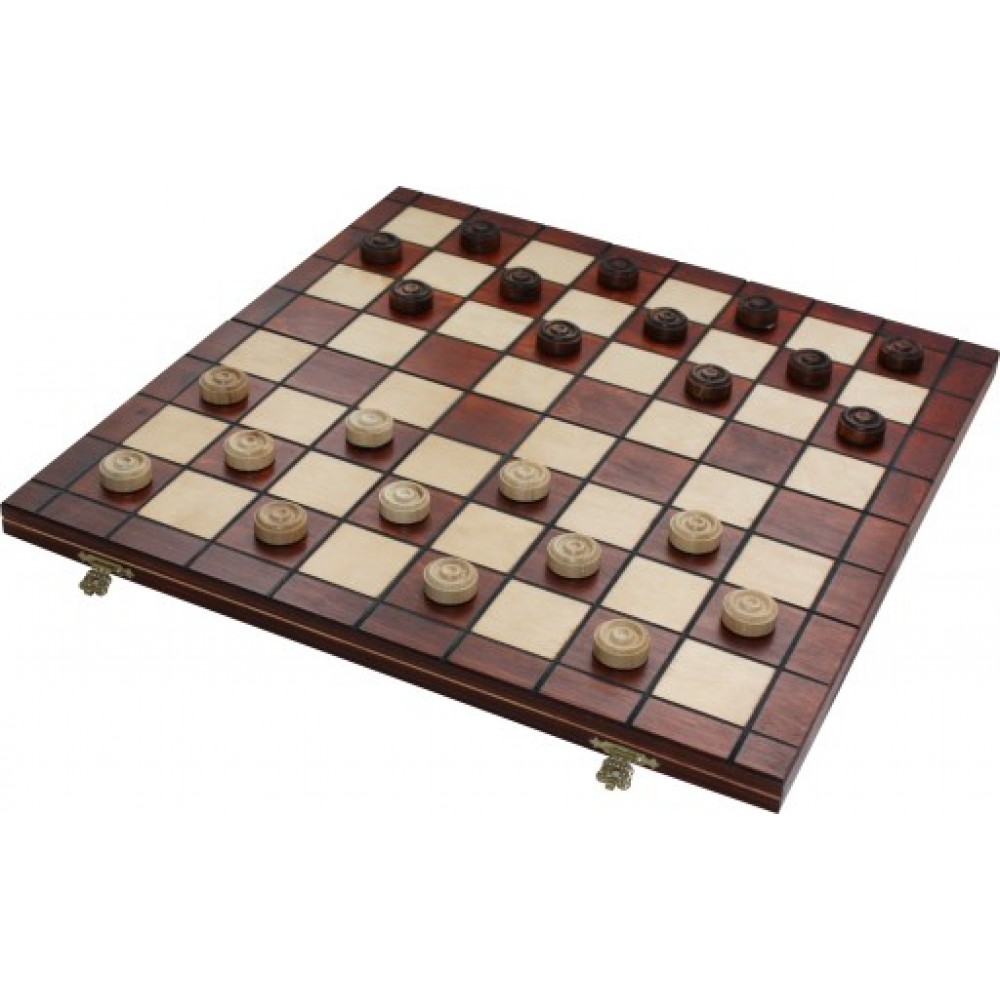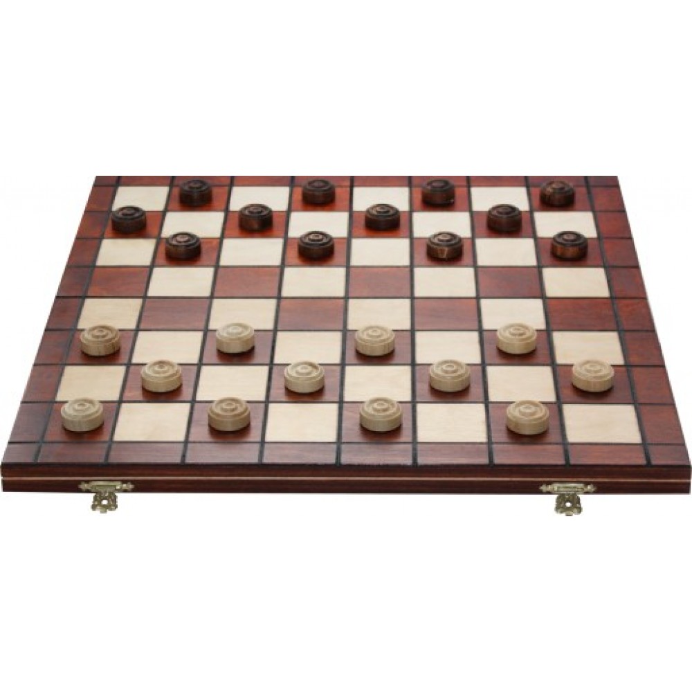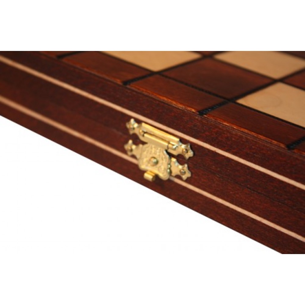 Без картонної коробки. Набір закривається двома дуже гарними клямками з гравіюванням. Пішки дерев'яні, обклеєні зеленим фетром. Висота пішака - 1 см. Ігрова дошка дерев'яна, обпалена, складена навпіл. У наборі є спеціальна вкладка, обшита повстю, для зберігання ігрових фішок.