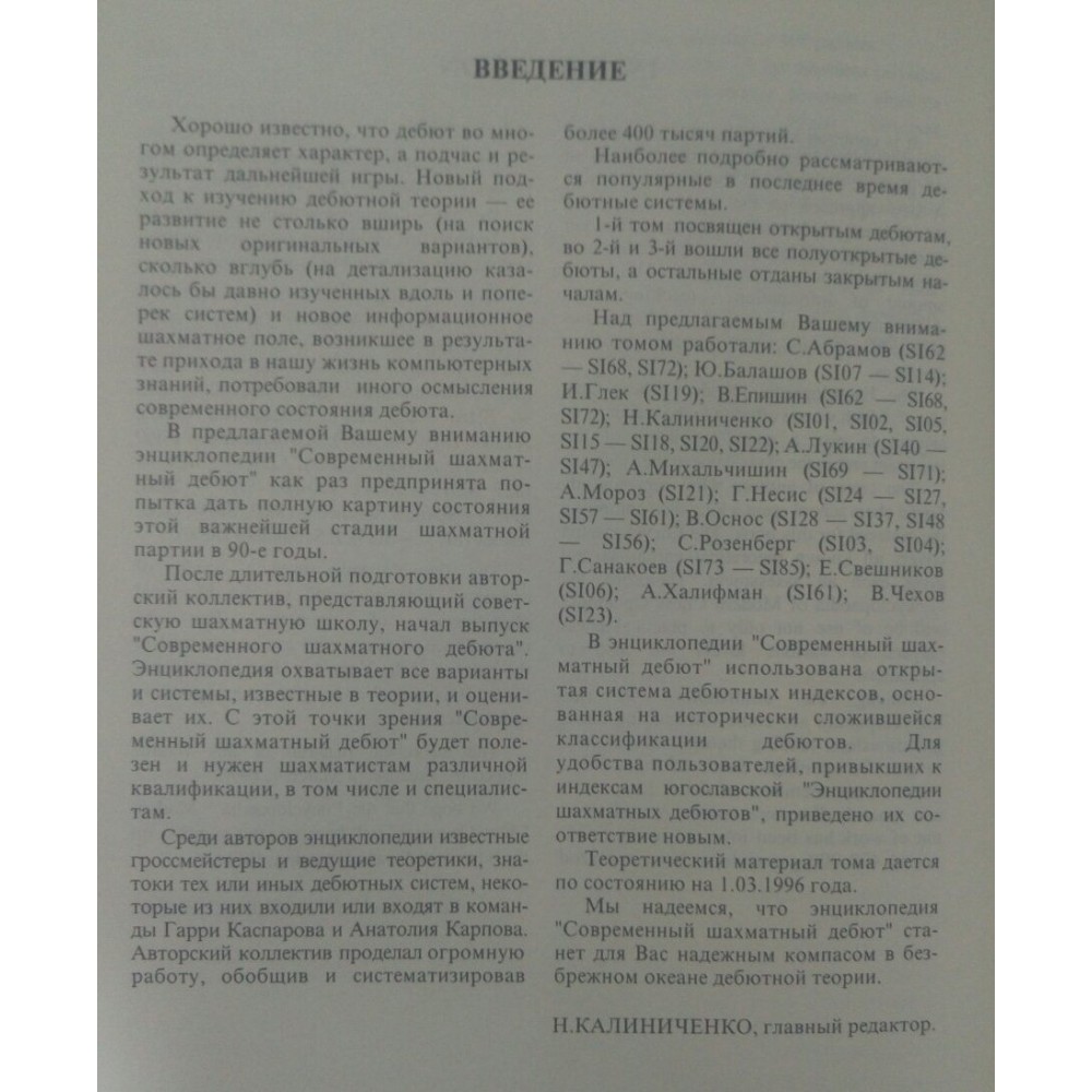 Добре відомо, що дебют багато в чому визначає характер, а часом і результат подальшої гри. Новий підхід до вивчення дебютної теорії - її розвиток не стільки вшир (на пошук нових оригінальних варіантів), скільки вглиб (на деталізацію здавалося б давно вивчених вздовж і впоперек систем) та нове інформаційне шахове поле, що виникло в результаті приходу в життя комп'ютерних знань, вимагали іншого осмислення сучасного стану дебюту. У пропонованій Вашій увазі енциклопедії "Сучасний шаховий дебют" якраз зроблено спробу дати повну картину стану цієї найважливішої стадії шахової партії у 90-ті роки.