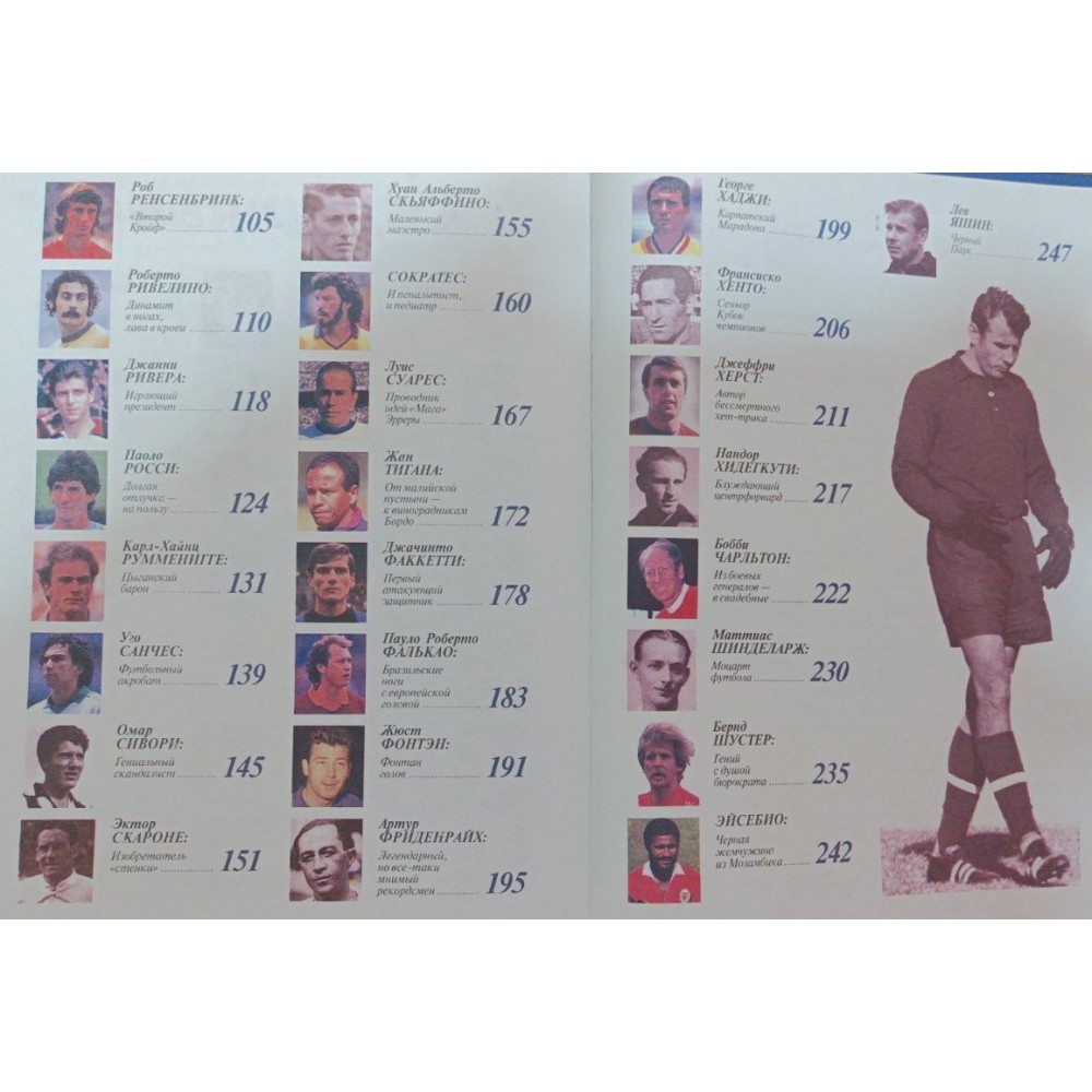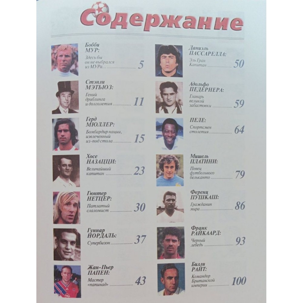 Книга відомого спортивного журналіста, історика та статистика футболу І.Гольдеса, що видається трьома окремими випусками, містить захоплюючі нариси про спортивні досягнення і особисте життя ста найяскравіших зірок шкіряного м'яча XX століття, серед яких такі легендарні імена, як Пеле, Марадона, Баджо, Бест, Гулліт, Ван Бастен, Блохін, Яшин, Гаррінча, Леонідас, Маццола, Пушкаш, Боббі Мур та інші. До уваги читачів представлені невигадані хроніки про тих, хто власною кров'ю і потім, титанічною працею та цілеспрямованістю досяг видатних успіхів у спорті; про тих, чия поява на футбольному полі приводила в справжнє божевілля та невимовний екстаз багатотисячні стадіони всіх континентів; про тих, хто своєю фантастичною грою змушував уболівальників тріумфувати і страждати, плакати і сміятися, любити і ненавидіти: про тих, хто подарував світові радість спілкування з чарівним мистецтвом Великої Ігри! Книга містить великий довідковий матеріал, ілюстрована рідкісними фотографіями та представляє величезний інтерес для багатомільйонних шанувальників футболу.