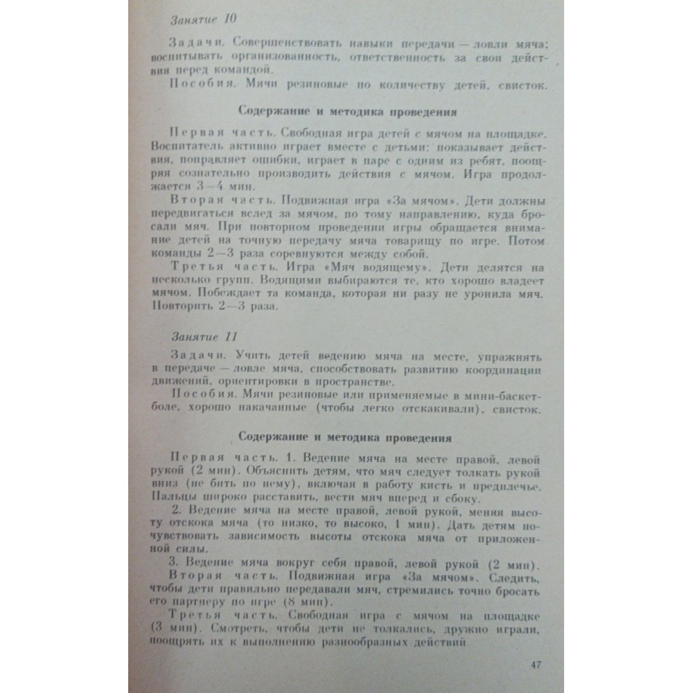 У дітей старшого дошкільного віку при систематичному навчанні значно покращуються навички володіння м'ячем. Вони вільно його тримають, передають, кидають. Діти вміють стежити за польотом м'яча і прямують у бік м'яча, що летить, намагаючись зловити його. Такі рухи з м'ячем, як перекидання один одному, лов, кидання в ціль, у дітей старшого дошкільного віку стають правильнішими, вільнішими порівняно з молодшими дітьми, досягають певного рівня досконалості. Тому на базі вже наявних рухів з'являється можливість формувати досить складні дії з м'ячем, навички виконання їх певними способами.