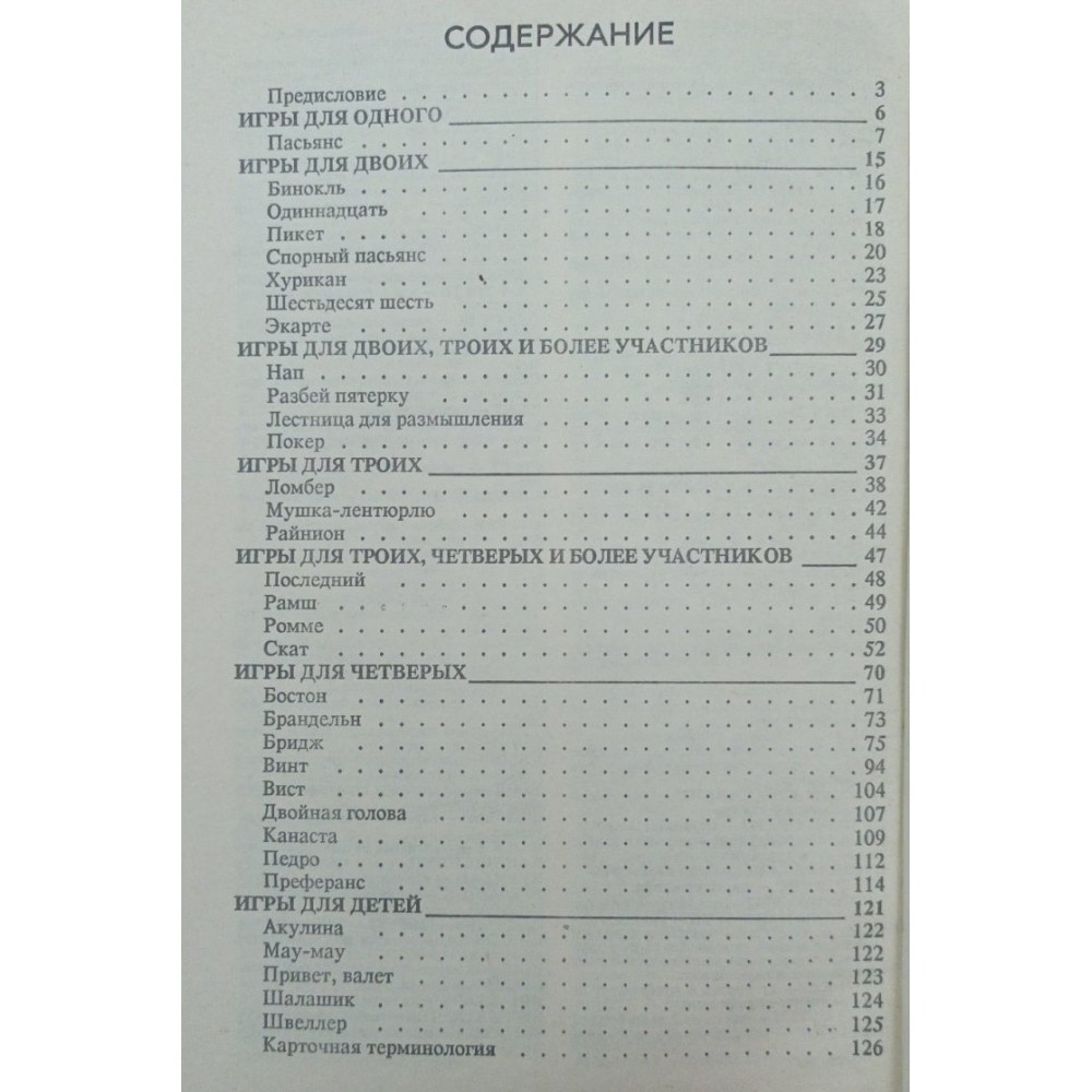 Автор зробив спробу переглянути ставлення до карткових ігор, що склалося в нашій країні в останні десятиліття. У книзі розказано про історію цього найдавнішого захоплення людства, систематизовані та докладно описані такі відомі у всьому світі ігри, як пасьянс, покер, ломбер, рамш, скат, бостон, бридж, віст, преферанс та багато інших. Книга виявиться корисною для любителів карткових ігор. а також для бажаючих навчитися грати.