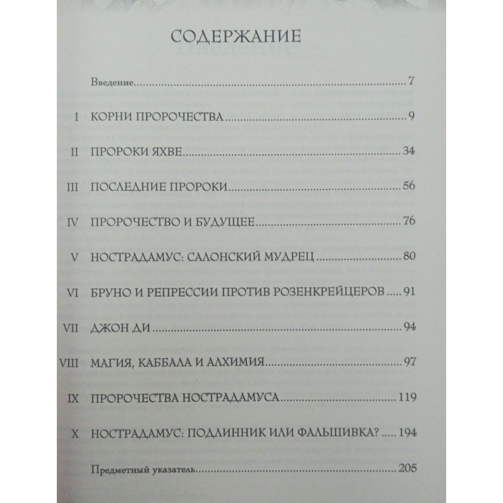 Навряд чи знайдеться людина, яка не чула про пророкування великих пророків і не цікавилася їх пророцтвами, що невблаганно збуваються. Автор цієї книжки зробив спробу пролити світло на таємниці пророцтв знаменитих мудреців і провидців. Особливу увагу в книзі приділено Мішелю Нострадамусу, пророцтва якого стали сенсацією з моменту своєї появи і донині є предметом невичерпного інтересу людей, які бажають зазирнути в майбутнє. Забезпечена безліччю ілюстрацій, книга досліджує роль астрології, алхімії та таємних знань у пророцтві, намагаючись розгадати таємницю напрочуд точних передбачень великих катастроф, багато з яких уже відбулися і вразили світ. Чи вдалося хоч трохи наблизитися до їхньої розгадки – покаже майбутнє.