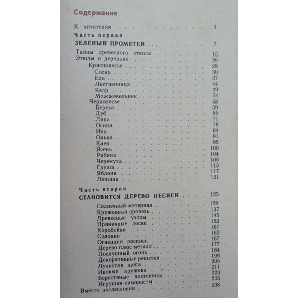 Букіністичне видання. Книжка присвячена художній обробці дерева, одного з найдавніших та універсальних природних матеріалів. Читач знайде в ній практичні поради та опис технологічних прийомів обробки деревних матеріалів у традиціях народного декоративно-ужиткового мистецтва (пропильна та кудринська різьба, аплікація з тріски, плетіння з лози та ін.). Невеликі етюди, в яких містяться відомості історичного, літературного характеру, познайомлять читача з найпоширенішими породами дерев — з особливостями їхньої будови, фізичними та механічними властивостями, а також розкажуть про роль лісу, рідної природи у морально-естетичному вихованні людини. Книга може бути з інтересом і користю прочитана не лише школярами, а й усіма, хто займається художньою обробкою дерева та самодіяльною творчістю.