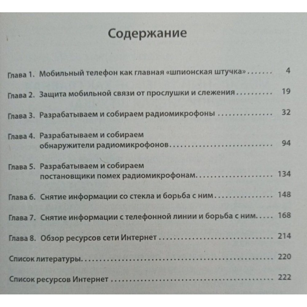 Головною "шпигунською штучкою" сьогодні став мобільний телефон. Шпигунські програми здатні контролювати активність на мобільному пристрої, на який встановлені. Текстові повідомлення, що набираються на телефоні, вхідні та вихідні дзвінки разом із тривалістю дзвінка, SMS, MMS, електронна пошта, будь-які дані, отримані чи надіслані через Інтернет, координати пристрою – все це буде доступно для перегляду у будь-який час доби. Найкращі шпигунські програми також прослуховують і записують розмови через мобільний пристрій, перетворивши телефон на справжній електронний жучок. Зрозуміло, описуються й існуючі антвіруси-антишпигуни, що дозволяють виявити та знищити у вашому мобільному телефоні шпигунські програми. У книзі розглянуті і традиційні шпигунські та протишпигунські штучки: представлені схемні рішення пристроїв для отримання інформації та захисту своєї інформації від витоку. Схеми супроводжуються описами, рекомендаціями щодо збирання та налаштування. Всі ці конструкції доступні домашнім майстрам. Книга призначена для широкого кола читачів.