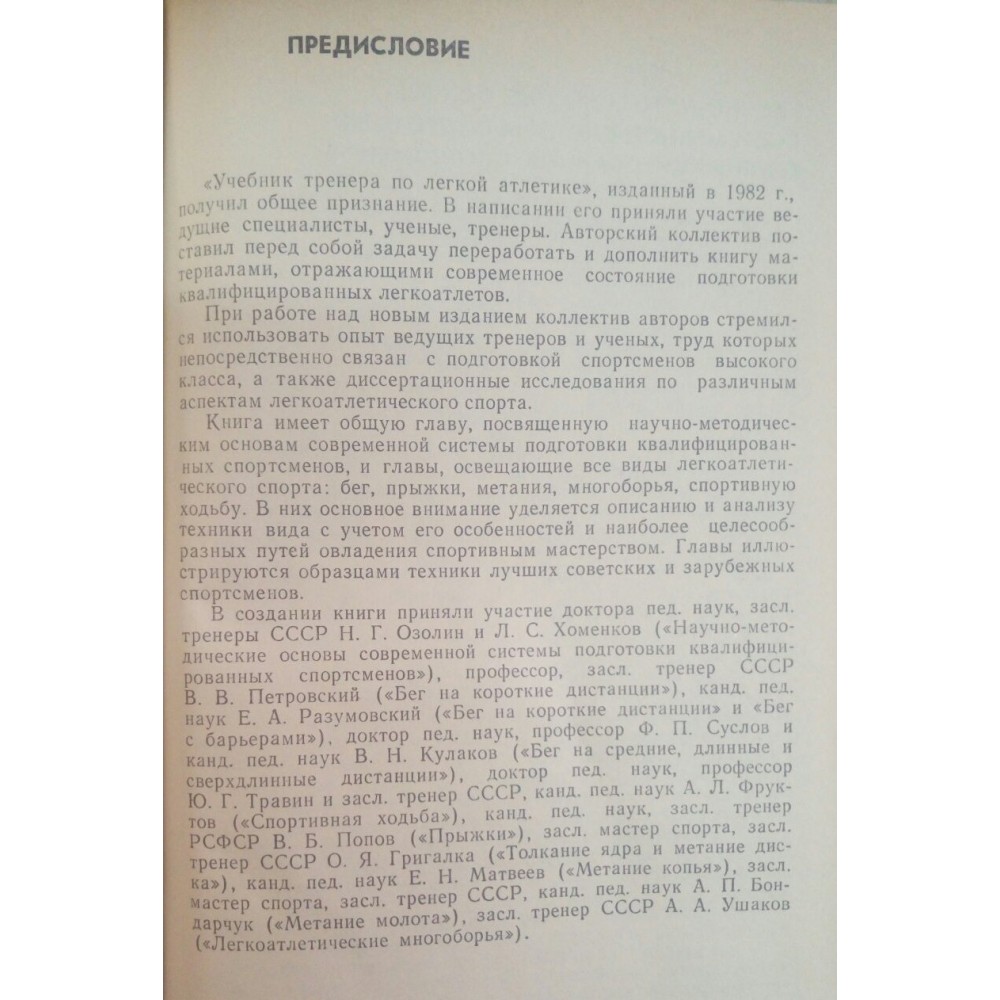 У новому виданні (останнє під назвою «Підручник тренера з легкої атлетики вийшло 1981 р.) автори — найвизначніші фахівці легкої атлетики — ґрунтуються на досвіді роботи провідних радянських тренерів зі спортсменами вищих розрядів. Основну увагу приділено суттєвим сторонам сучасної техніки, а також методиці оволодіння спортивною майстерністю. Для тренерів, студентів вузів та учнів технікумів фізкультури, спортсменів-розрядників.