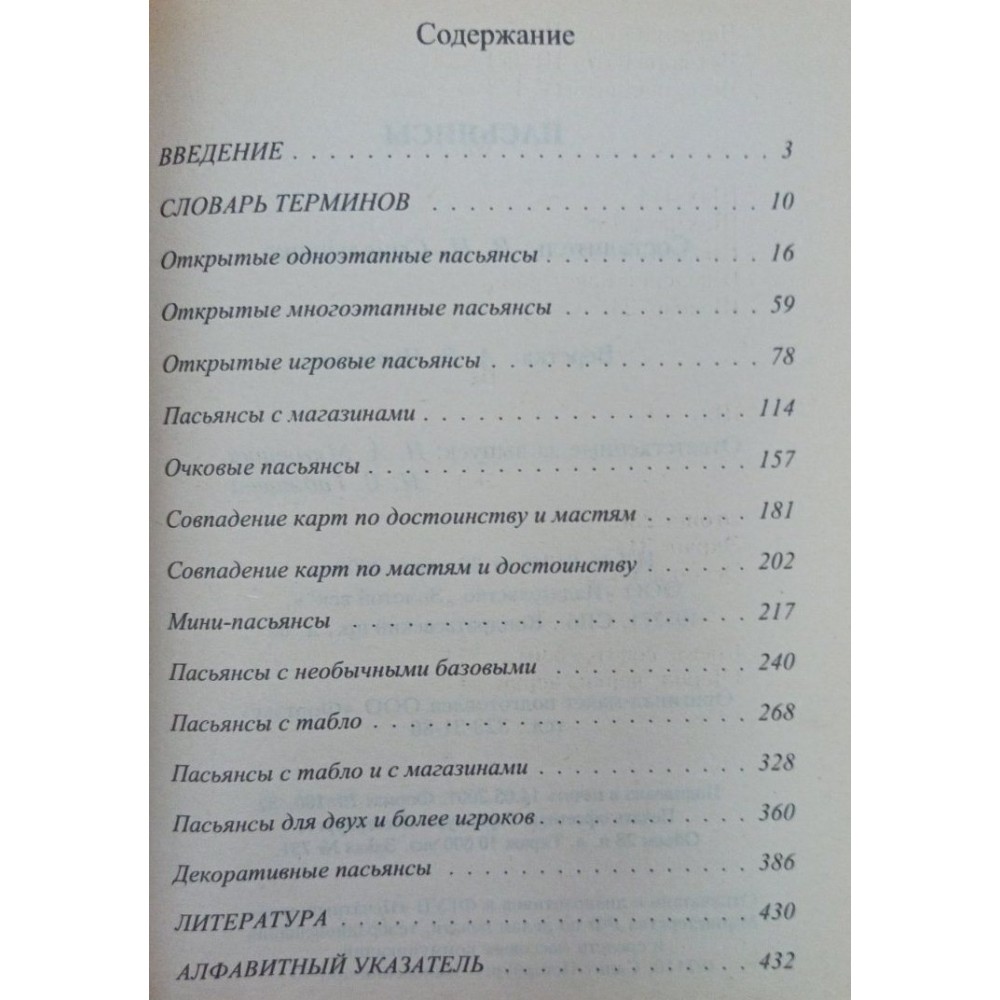 Унікальне енциклопедичне видання, яке докладно розповідає про пасьянс. Наведено правила розкладки понад чотириста пасьянсів.