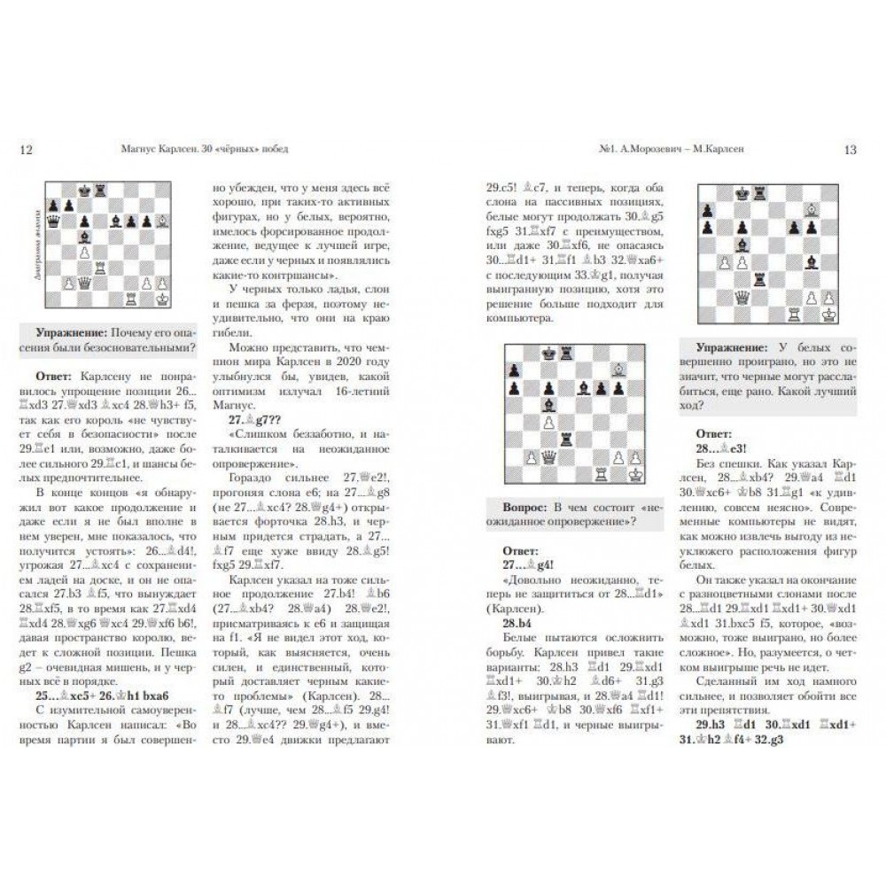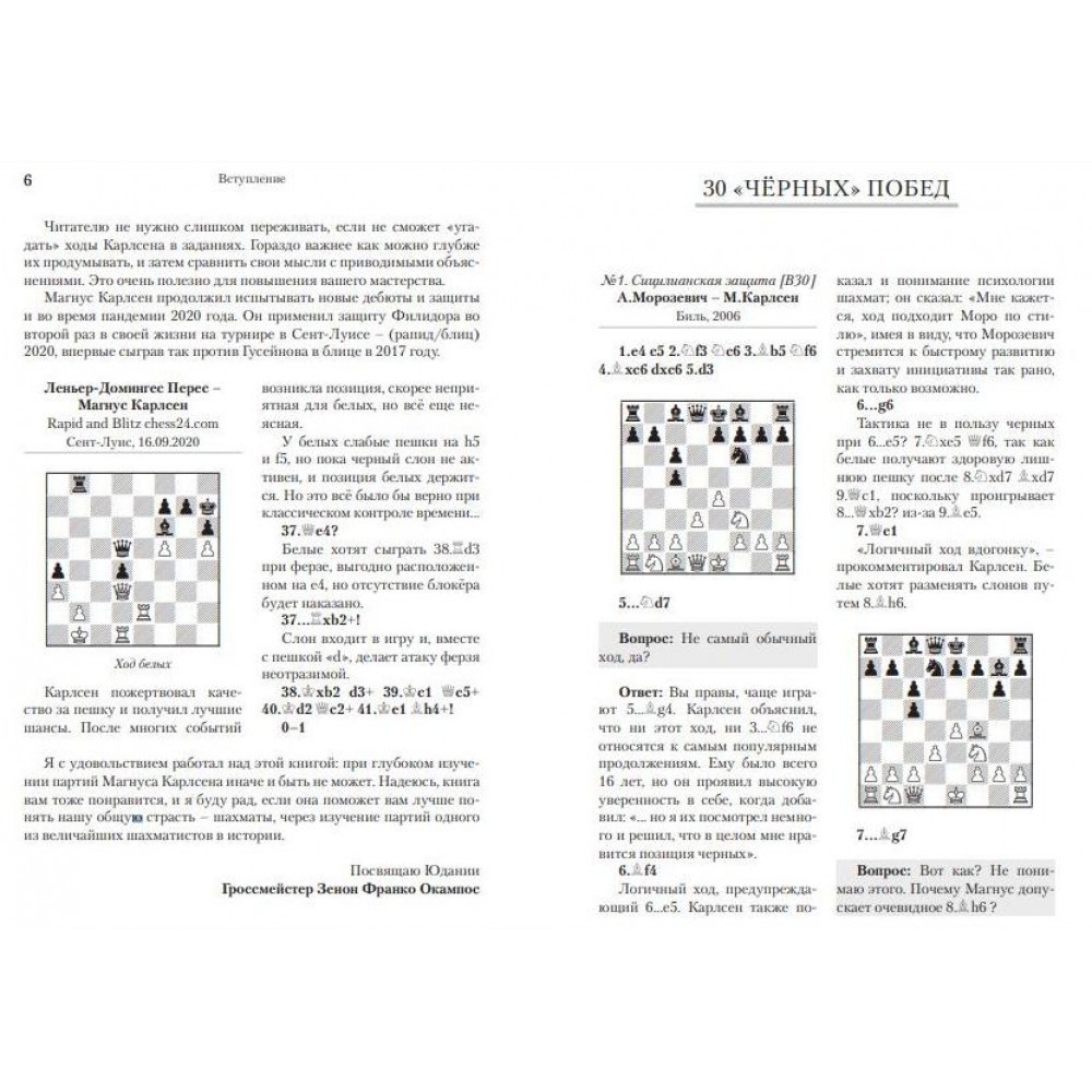 У своїй новій книзі гросмейстер Зенон Франко глибоко аналізує 30 «чорних» повчальних перемог (включаючи партії 2020 року) чемпіона світу Магнуса Карлсена. Книжка не перевантажена варіантами, акцент – на докладних поясненнях у стилі «хід за ходом», що формує ідеальну платформу для вивчення шахів. У «опорних» точках кожної партії читачеві пропонуються тестові питання, що допомагає і практичному вивченню ключових прийомів шахової гри, і надійному засвоєнню знань, що знаходять. Питання та відповіді залучають читача до процесу навчання та допомагають йому відстежувати зростання своєї шахової сили. Більшість партій взято із недавньої творчості Карлсена. Майже всі його суперники супергросмейстери – екс-чемпіони світу Віші Ананд та Володимир Крамник, а також Фабіано Каруана, Сергій Карякін, Шахріяр Мамедьяров, Олексій Широв, Максим Ваше-Лаграв, Левон Аронян, Аніш Гірі та ін.