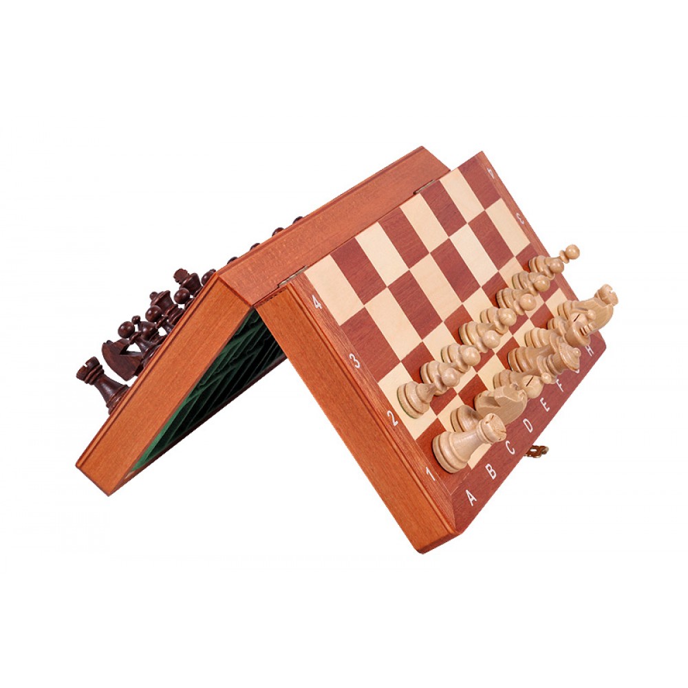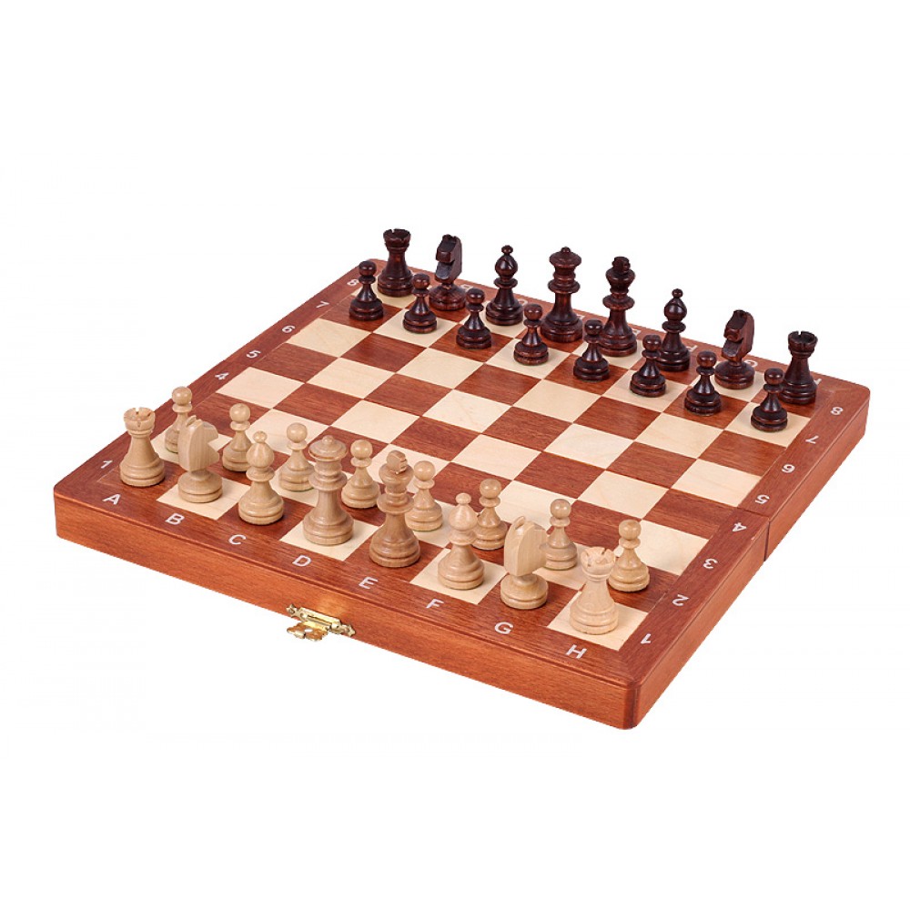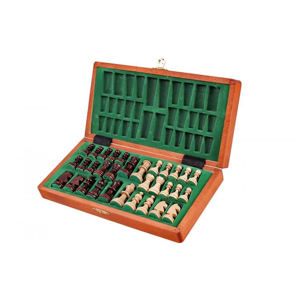 Ця модель шахів виготовлена за технологією "Маркетрі". Ця технологія використовувалася у Стародавньому Єгипті. Шпон двох порід дерева (темного та світлого) вирізуються під певним кутом і склеюються, за принципом мозаїки, разом. В результаті виходить шахова дошка з темними та світлими клітинами ручної роботи. Хороша якість виробу, зручна шахівниця, обважнені, різьблені фігури. Шахи стануть чудовим подарунком як досвідченому гравцю, так і шахісту-початківцю. Матеріал – клен. Розмір: 270x135x40 мм. (У закритому положенні). Дерев'яні фігури з масиву клена. Висота короля – 55 мм. Вага виробу – 0,7 кг. Виробник: Польща.