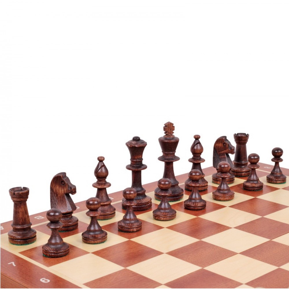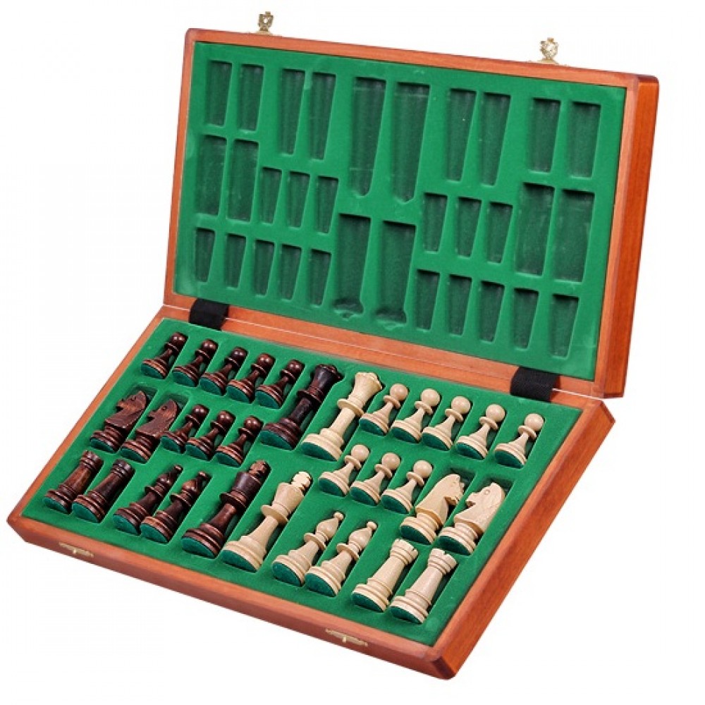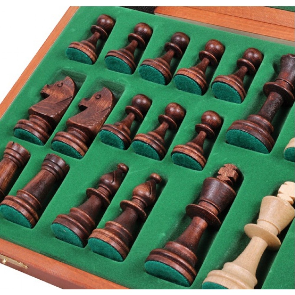 Ця модель шахів виготовлена за технологією "Маркетрі". Ця технологія використовувалася у Стародавньому Єгипті. Шпон двох порід дерева (темного та світлого) вирізуються під певним кутом і склеюються, за принципом мозаїки, разом. В результаті виходить шахова дошка з темними та світлими клітинами ручної роботи. Хороша якість виробу, зручна шахівниця, обважнені, різьблені фігури. Шахи стануть чудовим подарунком як досвідченому гравцю, так і шахісту-початківцю. Матеріал – клен. Розмір: 480x220x50 мм. (У закритому положенні). Дерев'яні фігури з масиву клена. Висота короля – 90 мм. Вага виробу – 2,0 кг. Виробник: Польща.
