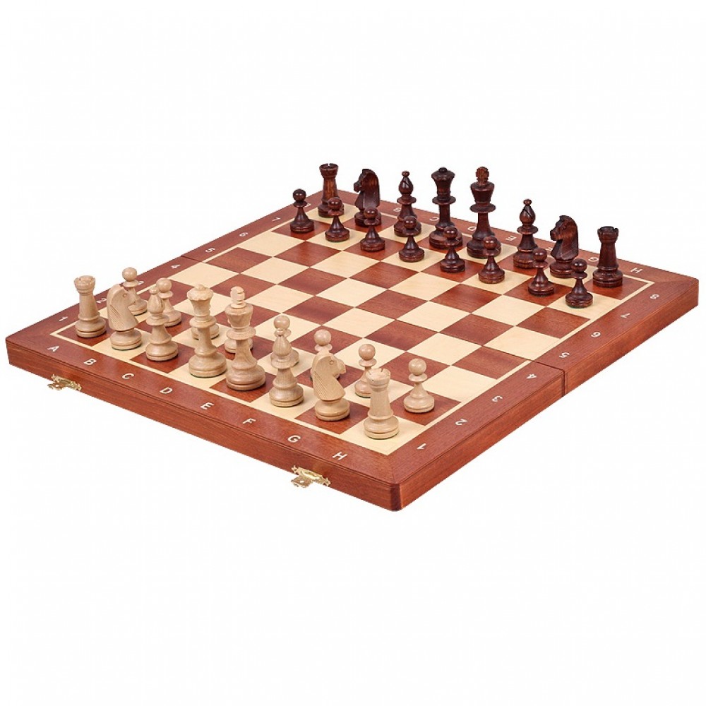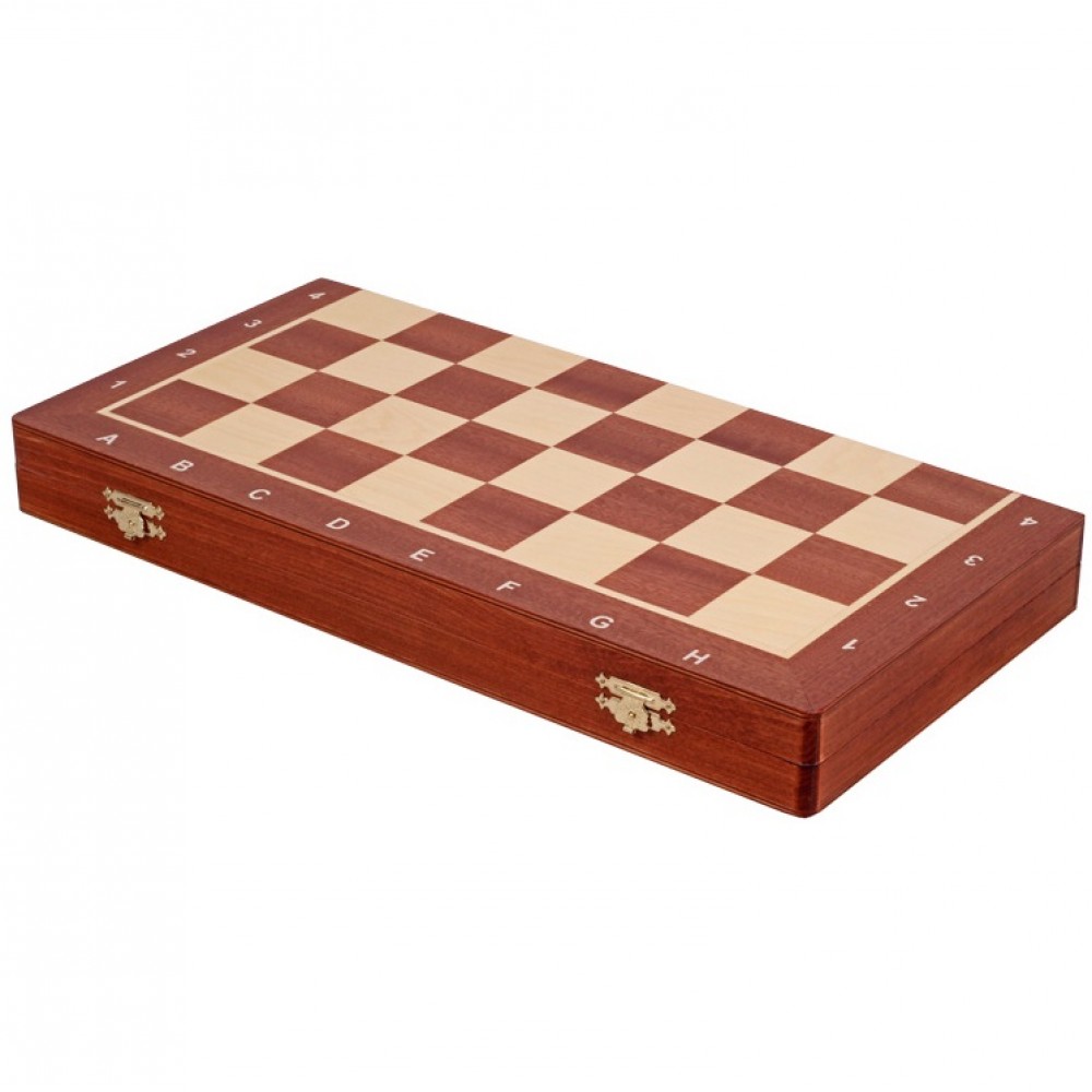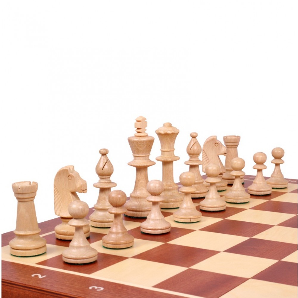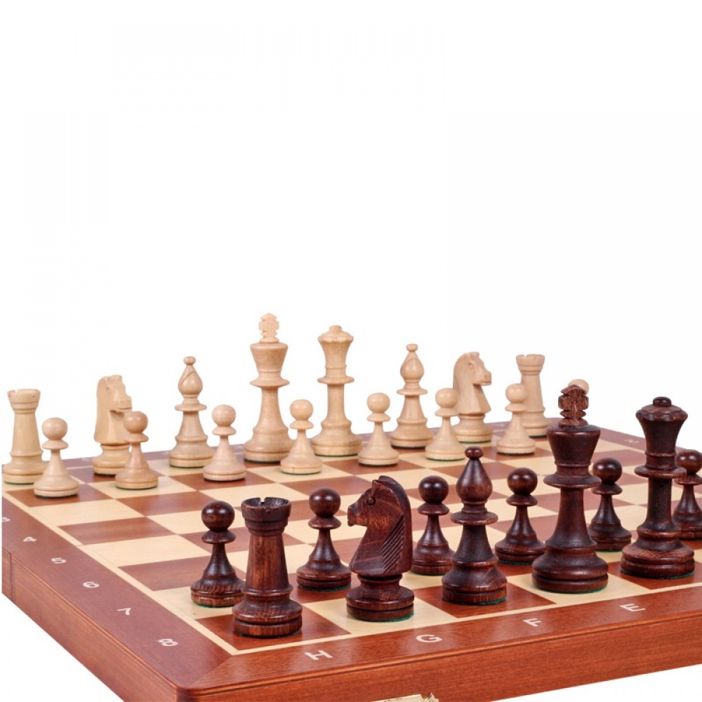 Ця модель шахів виготовлена за технологією "Маркетрі". Ця технологія використовувалася у Стародавньому Єгипті. Шпон двох порід дерева (темного та світлого) вирізуються під певним кутом і склеюються, за принципом мозаїки, разом. В результаті виходить шахова дошка з темними та світлими клітинами ручної роботи. Хороша якість виробу, зручна шахівниця, обважнені, різьблені фігури. Шахи стануть чудовим подарунком як досвідченому гравцю, так і шахісту-початківцю. Матеріал – клен. Розмір: 480x220x50 мм. (У закритому положенні). Дерев'яні фігури з масиву клена. Висота короля – 90 мм. Вага виробу – 2,0 кг. Виробник: Польща.
