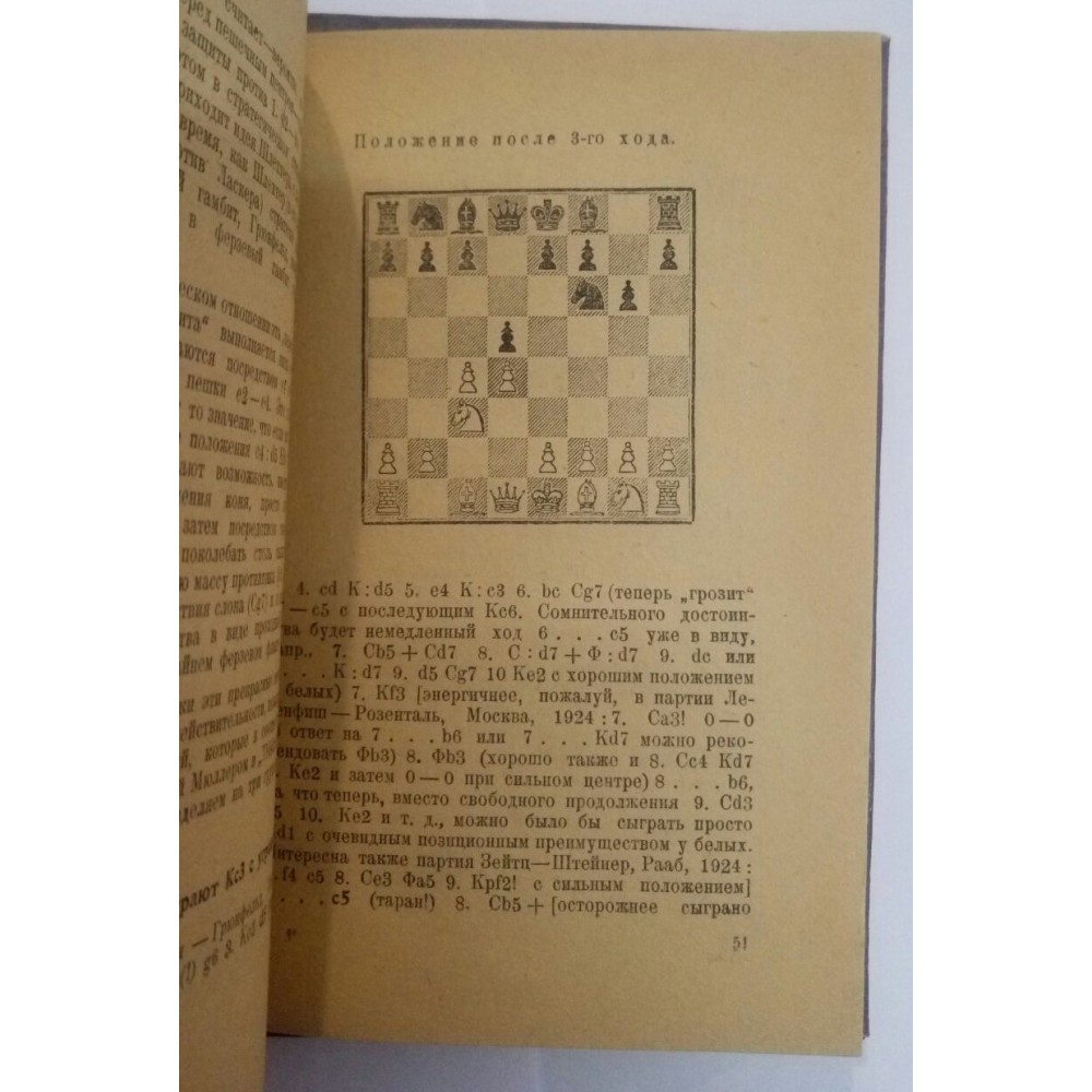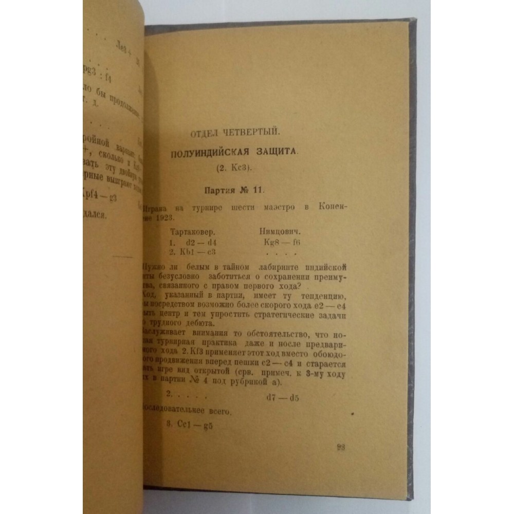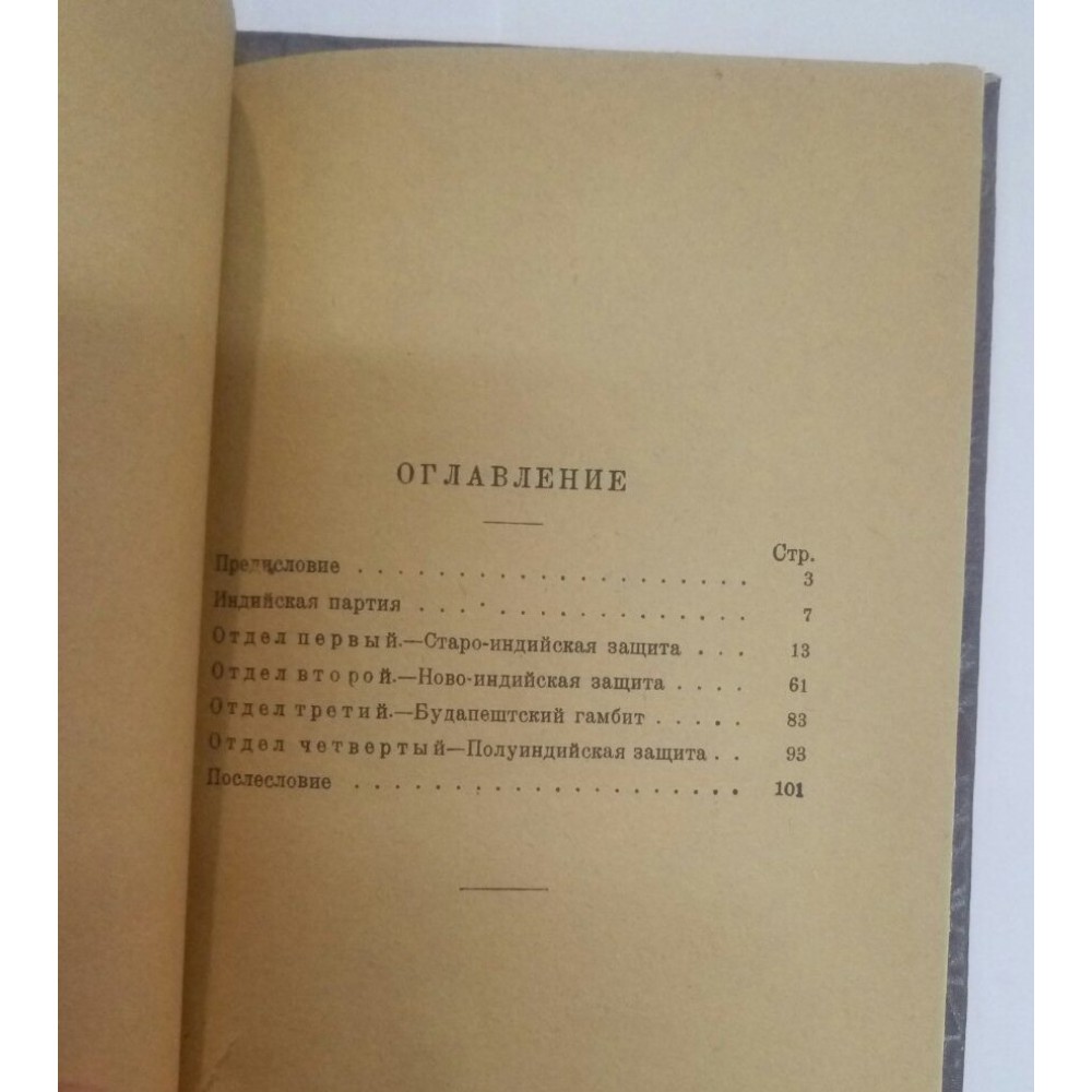 Зміст: Передмова. - Індійська партія. - Старо-індійський захист. - Ново-індійський захист. - Будапештський гамбіт. - Напівіндійський захист. – Післямова. Упоряд. та прокомент. д-р С. Г. Тартаковер; передисл. Григор'єва; пров. з ним. А. Н. Лаврова; за ред. В. І. Ненарокова. - М., 1925.