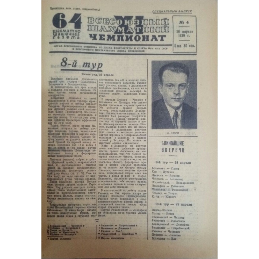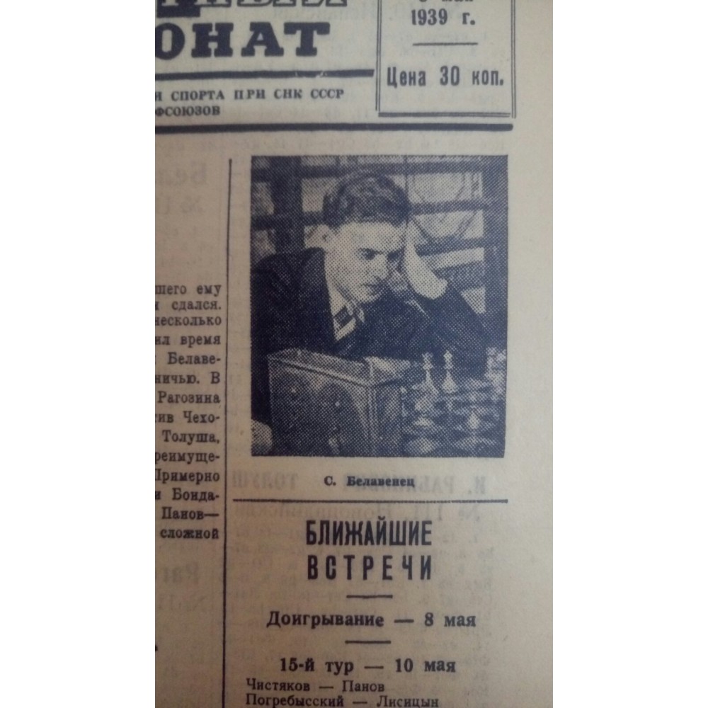 11-й чемпіонат СРСР (153 партії) проходив з 15 квітня по 16 травня 1939 року в Ленінграді. Учасники: М. Ботвінник, А. Котов, С. Білавенець, В. Макогонов, І. Бондаревський, Г. Левенфіш, В. Рагозін, В. Панов, О. Толуш, П. Романовський та ін.