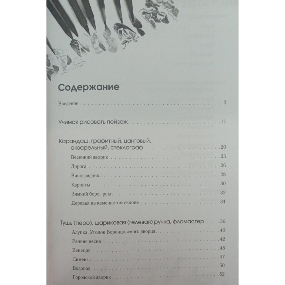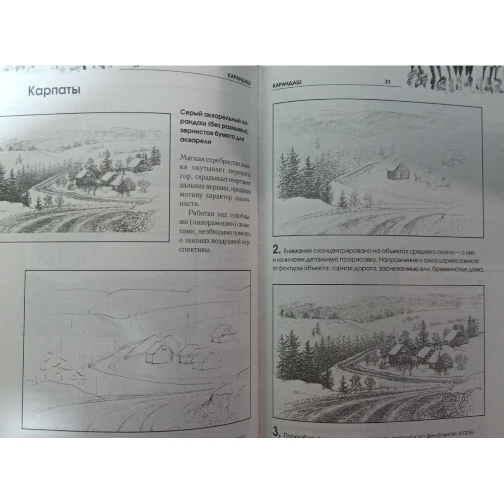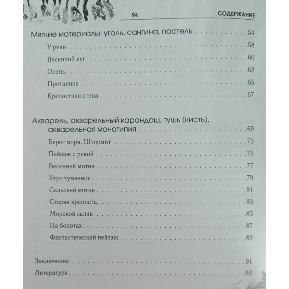 Букіністичне видання. Цей практичний посібник навчить вас створювати багатопланові пейзажні композиції у різноманітних техніках. У посібнику проілюстровано процес написання пейзажів від найпростіших ескізів до завершених малюнків. Вам не складно зафіксувати ліси та гори, водоспади та моря по пам'яті та з натури. Тонкощі малювання графітним та акварельним олівцем, гелевою ручкою, тушшю. Відображення різних світлових ефектів та передачі фактур. Тренувальні вправи з докладними інструкціями та ілюстраціями.