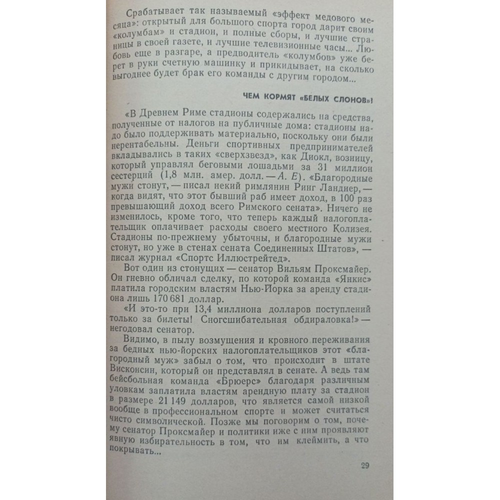 Журналіст агентства друку "Новини" розповідає про бізнес, який дедалі більше вторгається в американський спорт. Професійний спорт є у США, по суті, "монополістичною індустрією", якій притаманні найжорстокіші форми капіталізму. Автор наводить приклади всіляких махінацій власників професійних клубів, які задля великого бізнесу нелюдяно експлуатують спортивних "ідолів", йдуть на зневажання принципів чесної спортивної боротьби. Для широкого кола читачів.