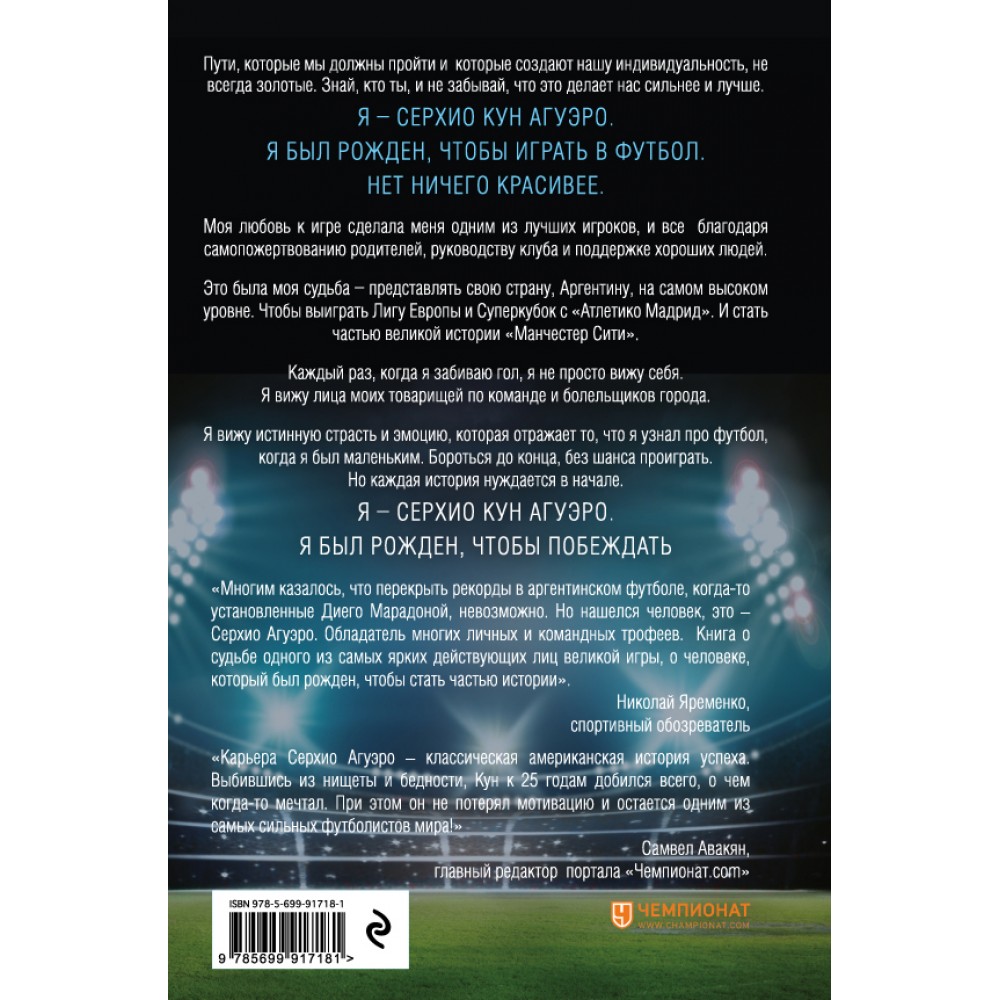 Букіністичне видання. Я Серхіо Кун Агуеро. Я був народжений, щоб грати у футбол. Немає нічого красивішого. Моя любов до гри зробила мене одним із найкращих гравців, і все завдяки самопожертві батьків, керівництву клубу та підтримці добрих людей. Це була моя доля, представляти свою країну на найвищому рівні. Щоб виграти Лігу Європи та Суперкубок з "Атлетіко" Мадрид. І стати частиною Великої історії "Манчестер Сіті". Щоразу, коли я забиваю гол, я бачу в цьому не лише себе. Я бачу обличчя моїх товаришів по команді та вболівальників. Я бачу справжню пристрасть та емоції. Боротися до кінця без шансу програти. Але кожна історія потребує на початку. Я Серхіо Кун Агуеро. Я народився, щоб перемагати.