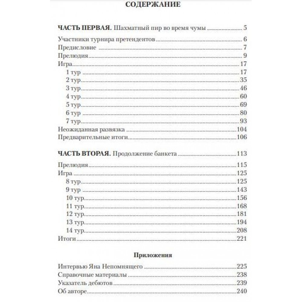 У своїй новій роботі авторитетний гросмейстер, тренер та автор розповідає про унікальний турнір претендентів, який через пандемію розтягнувся на 400 з лишком днів: перше коло було зіграно в Єкатеринбурзі навесні 2020 року, друге – лише через рік. Автор докладно аналізує всі 56 поєдинків провідних гросмейстерів світу, спираючись на психологічну складову: намагається пояснити, чому гравці приймали за дошкою та під час підготовки те чи інше рішення. Турнір вирізнявся неймовірним розпалом боротьби та порадував любителів шахів безліччю яскравих партій. Перше місце виборов російський гросмейстер Ян Непомнящий, який отримав право зіграти матч за корону з чемпіоном світу Магнусом Карлсеном (Норвегія). «Талант і мужність, виявлені найкращими шахістами світу під час всесвітнього лиха, гідні свого літопису» (В. Тукмаков). Доповнює книгу інтерв'ю Яна Непомнящего, яке він дав «за гарячими слідами» – у день закінчення турніру претендентів. Для широкого кола любителів шахів.