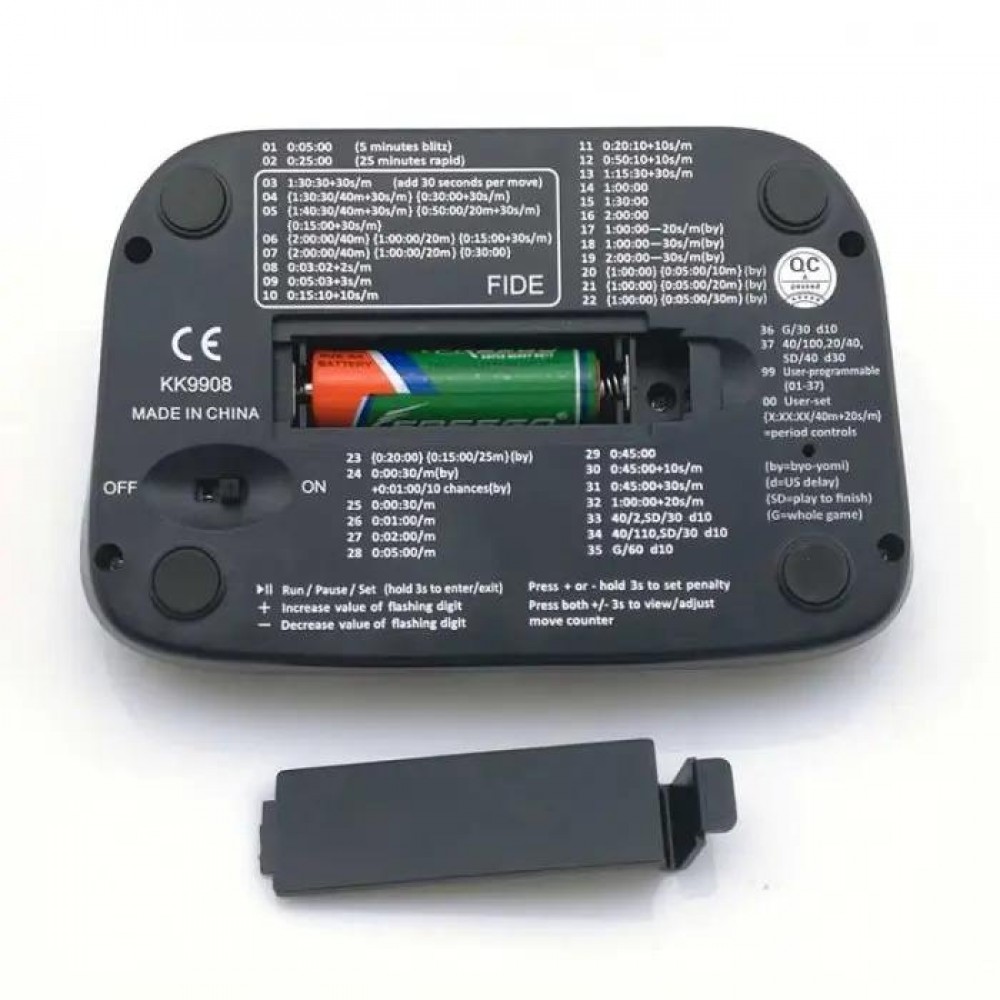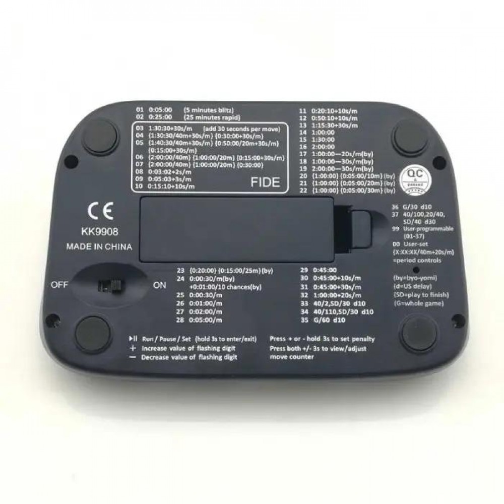 Електронний турнірний шаховий годинник KK9908, сертифікований FIDE (Міжнародною шаховою федерацією), придатний для використання на шахових турнірах будь-якого рівня. Встановлення різноманітних контролів часу, у тому числі контролю Фішера та Бронштейна. Всього 38 режимів, включаючи ручний.