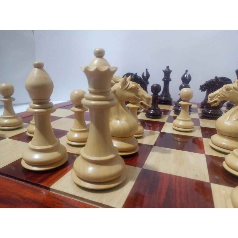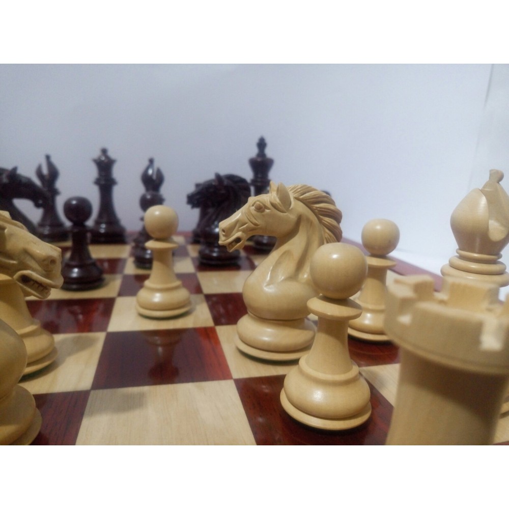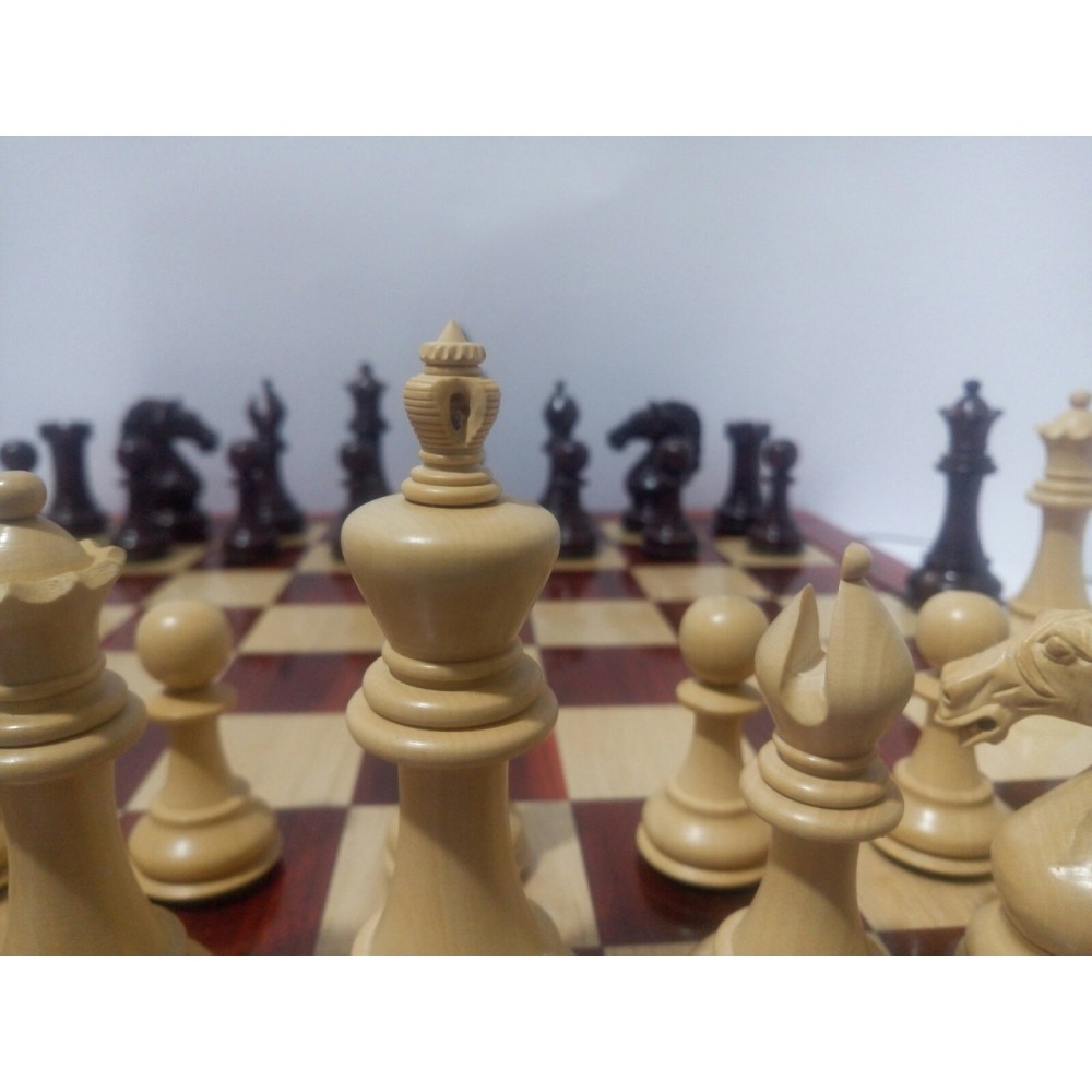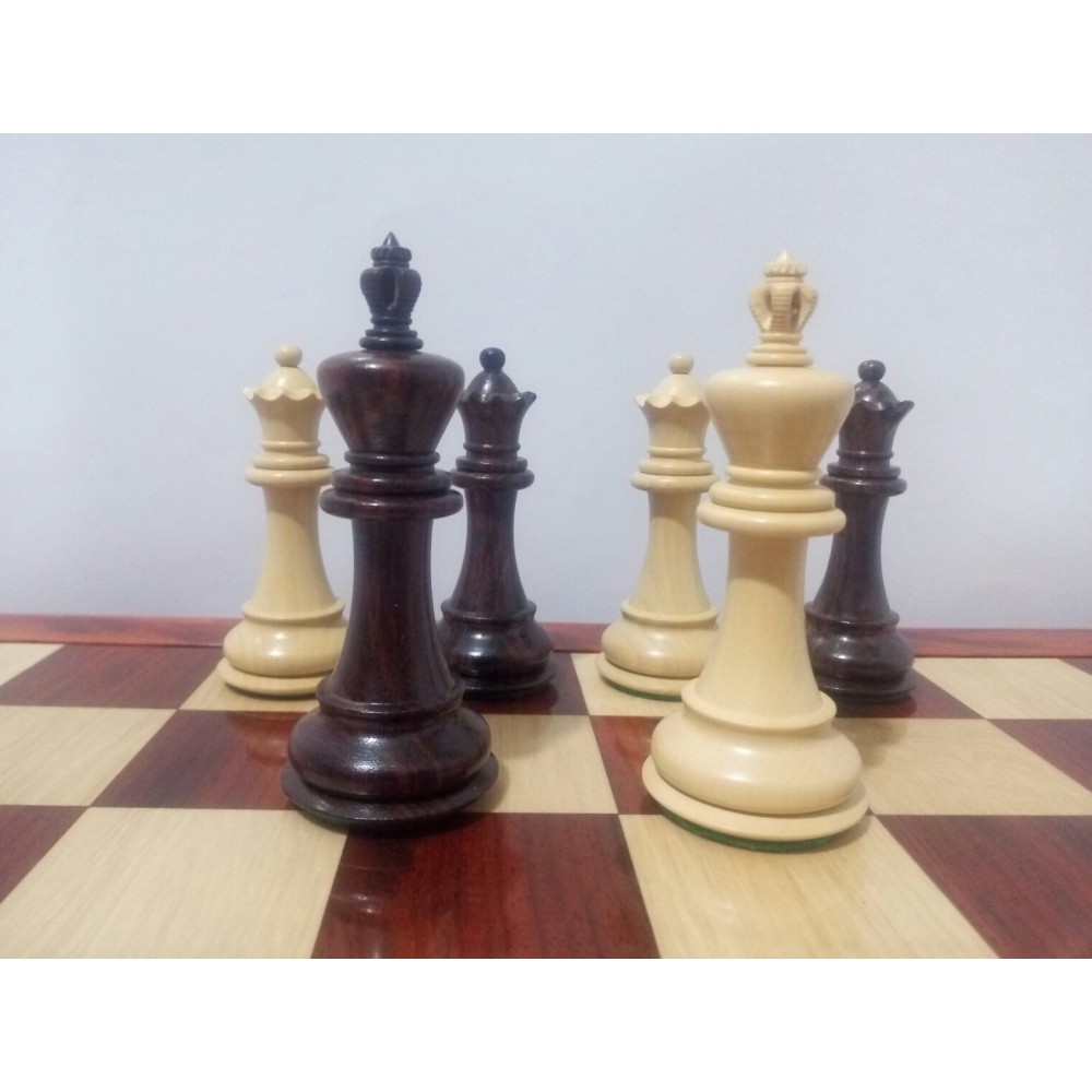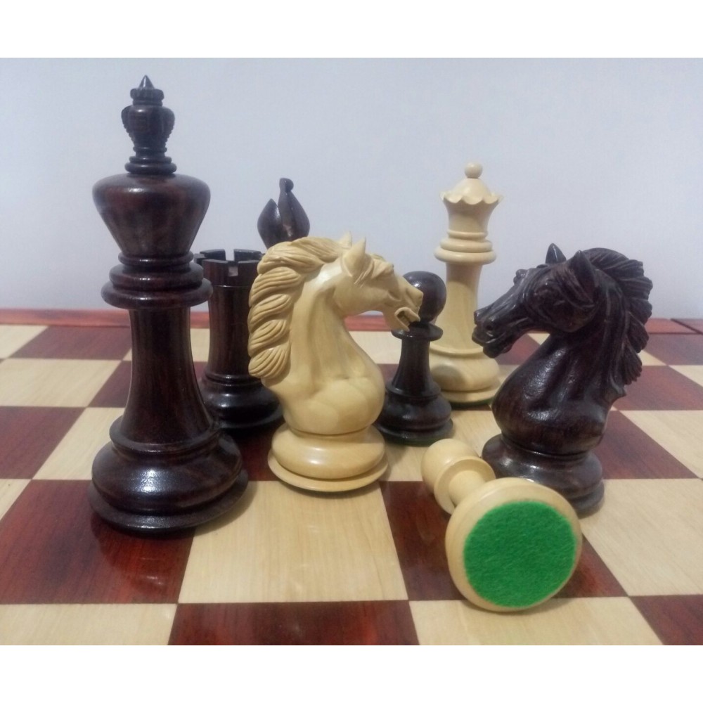 Шахові фігури з цільного дерева з металевим обтяжувачем усередині. Білі – самшит, чорні – ROSEWOOD (рожеве дерево). Фігури ручної роботи. Основи фігур покриті зеленим сукном. У наборі є два додаткові ферзи. Вага комплекту – 1500 грам. Виробництво Індія.