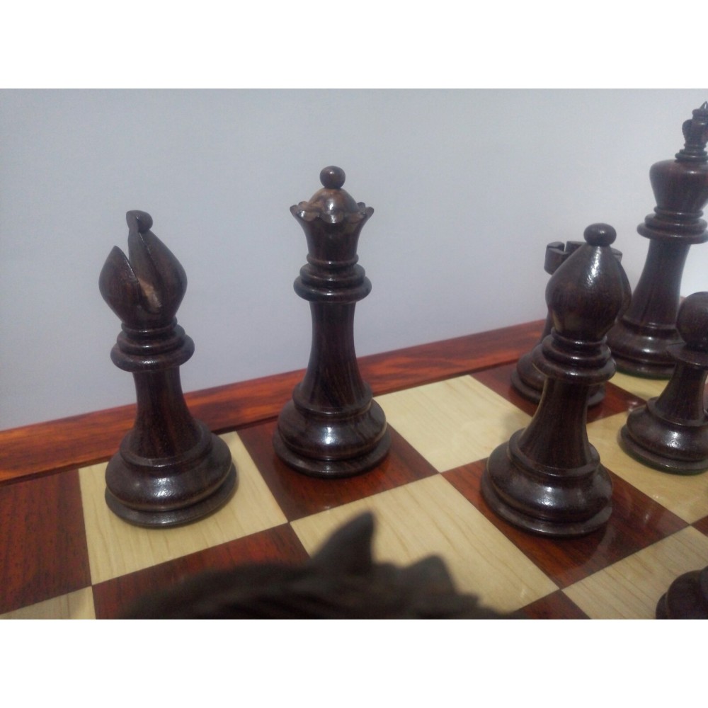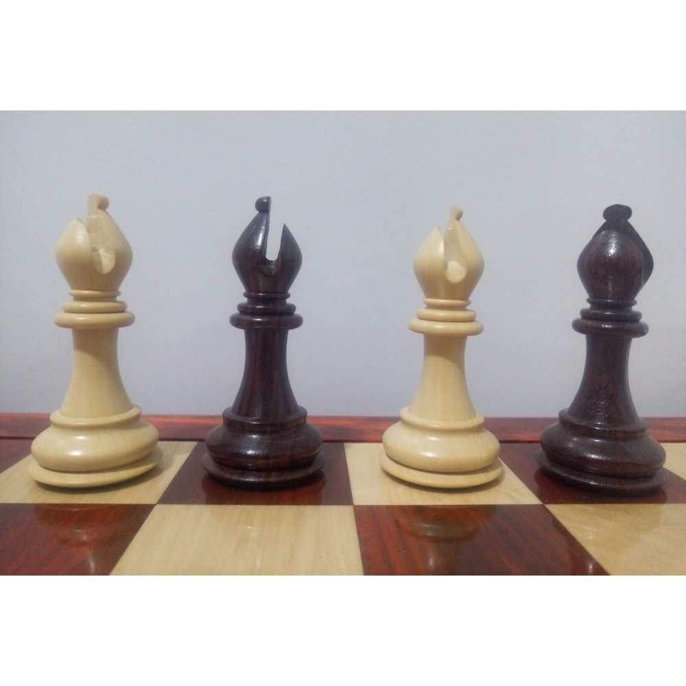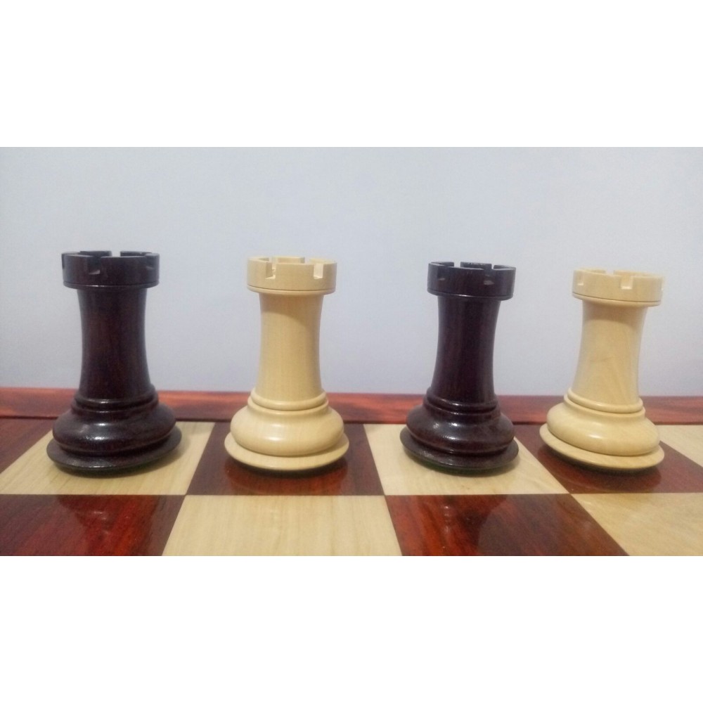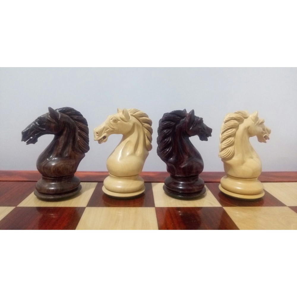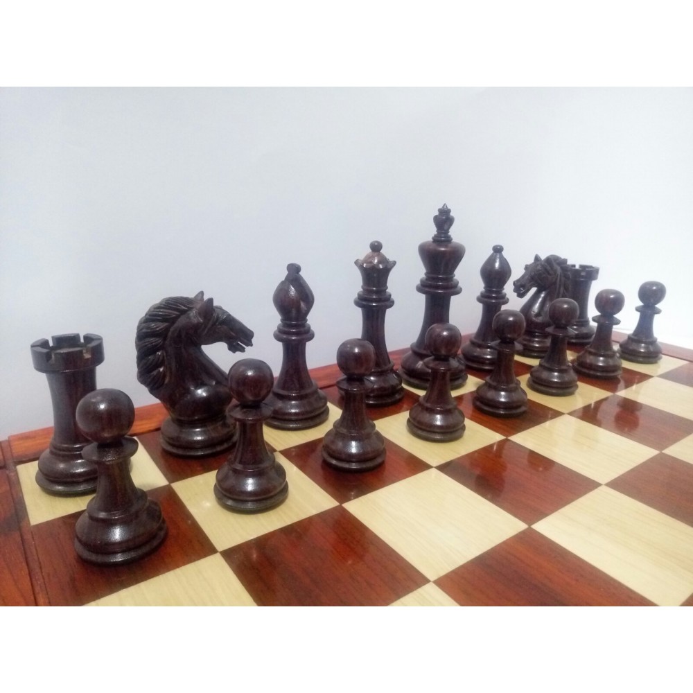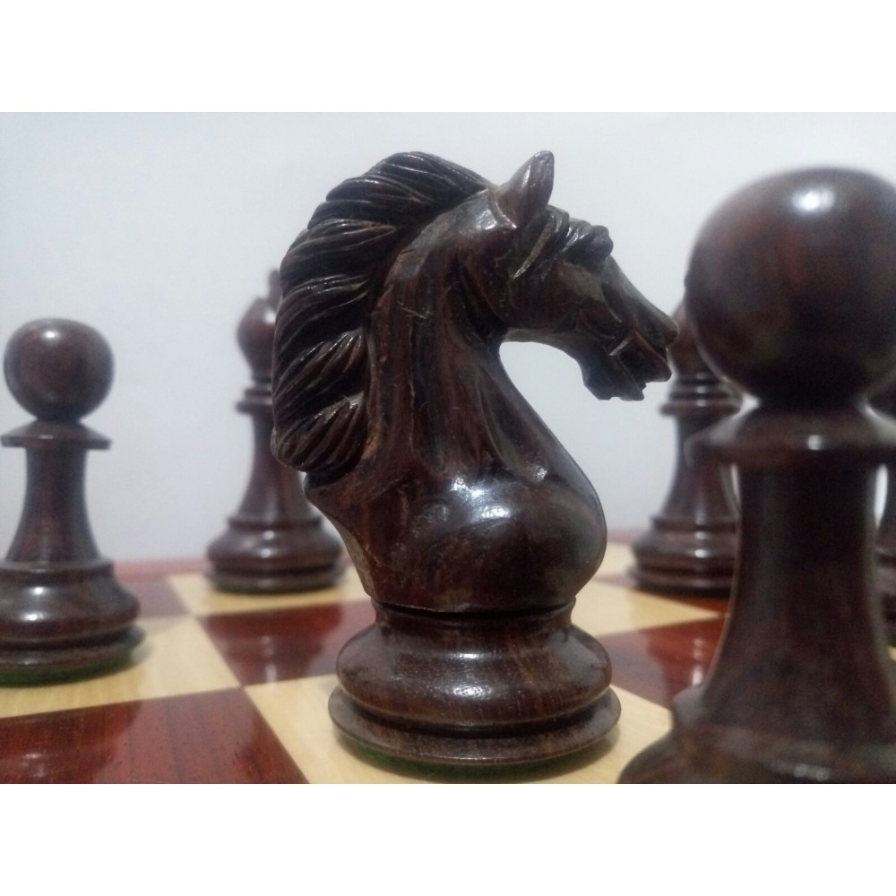 Шахові фігури з цільного дерева з металевим обтяжувачем усередині. Білі – самшит, чорні – ROSEWOOD (рожеве дерево). Фігури ручної роботи. Основи фігур покриті зеленим сукном. У наборі є два додаткові ферзи. Вага комплекту – 1500 грам. Виробництво Індія.