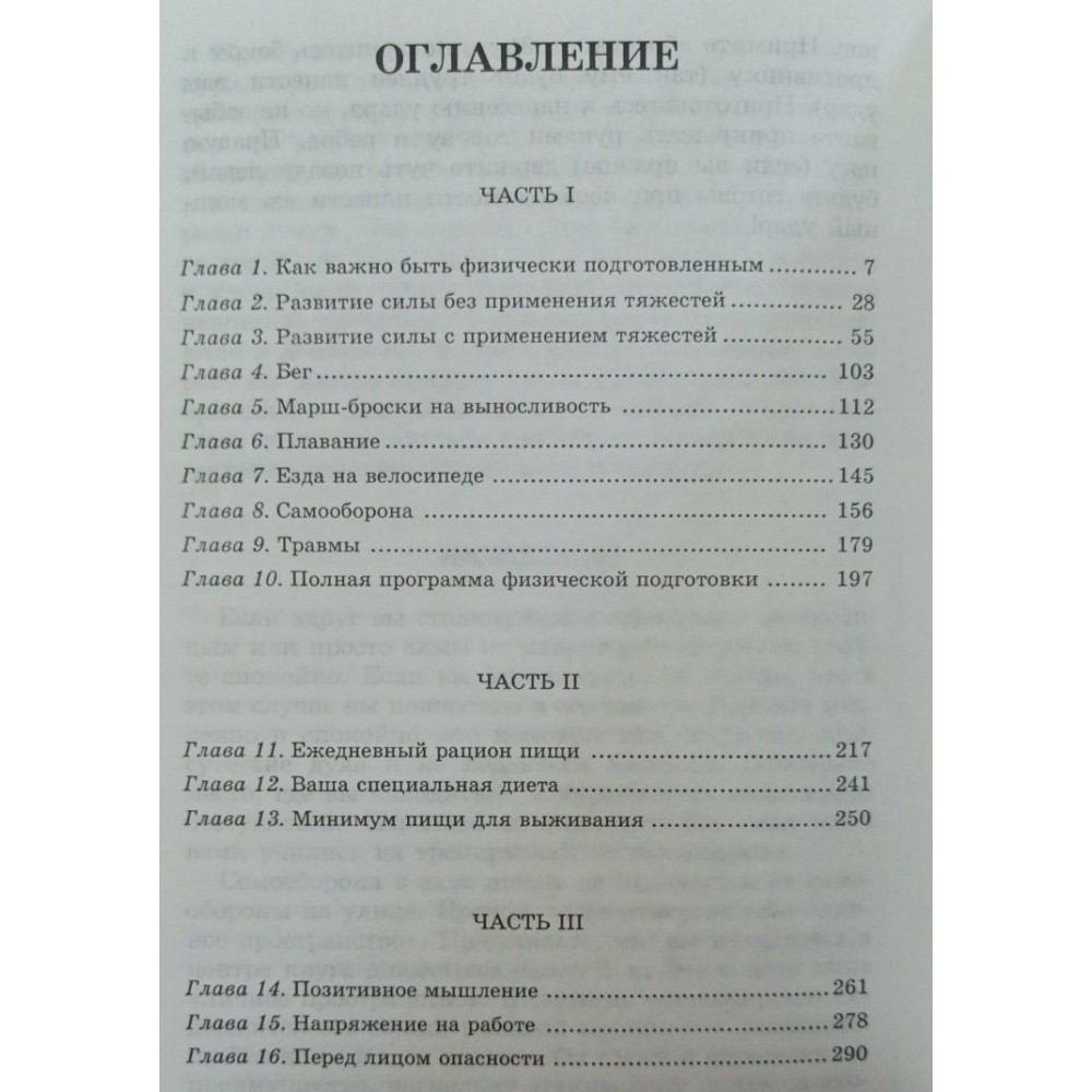 Букіністичне видання. Ця невелика книга, написана професіоналом, стоїть енциклопедії. Тут коротко, точно, чесно описано все, що має знати боєць спецназу. Тут розповідається, як придбати здатність переносити тривалі фізичні та розумові навантаження і виконати будь-яке завдання в обстановці, що постійно змінюється. Автор представляє методику повної фізичної та психологічної підготовки, рекомендує раціон бійця спецназу, способи виживання та надання першої допомоги, навички протистояння будь-якій небезпеці. Написана переконливо і просто, з великою кількістю практичного матеріалу та фотографій, книга корисна професіоналам і здатна вселити дух удосконалення не тільки в новачка-спецназівця, а й у будь-яку людину, яка побажала стати сильною, витривалою, здатною оперативно вирішувати складні завдання. Для широкого кола читачів.