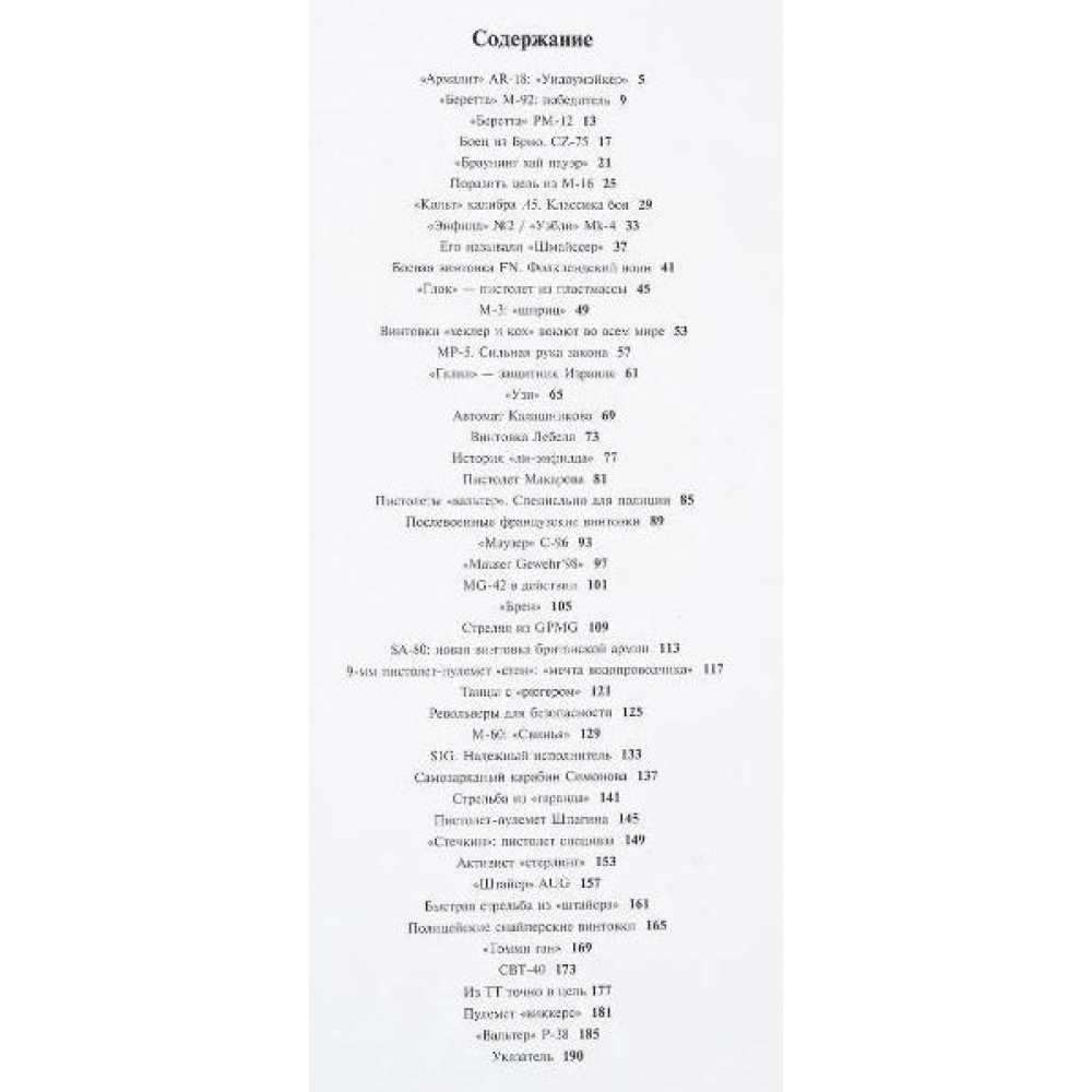 Книга містить опис 50 найбільш відомих у світі гвинтівок, кулеметів, пістолетів-кулеметів та пістолетів. Серед них легендарні М1б, "кольт", "калашників", ППШ, "Узі", "Галіл". Представлені і найсучасніші зразки особистої зброї, наприклад, $А 80 або «штейєр» АІС. Опис кожного зразка супроводжується кольоровою ілюстрацією. Кожна ілюстрація має докладний опис із зазначенням всіх значущих елементів конструкції та пристрою. Загалом у книзі близько 500 фотографій, що показують схеми розбирання та ілюструють застосування стрілецької зброї у бою.