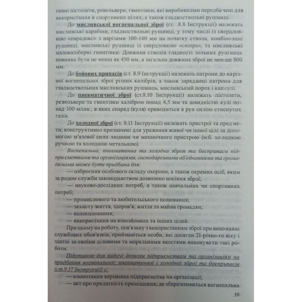 Це посібник - перша спроба створення методичних інформаційних рекомендацій, доступних та зручних у користуванні, для підприємств, установ, організацій (їх працівників), яким за родом діяльності чинним законодавством України дозволено користування вогнепальним оружням, спецзасобами, а також для громадян , які виявили бажання придбати або вже мають у власному користуванні мисливську вогнепальну, пневматичну, холодну зброю та спеціальні засоби самооборони, заряджені речовинами сльозоточивої та дратівної дії.