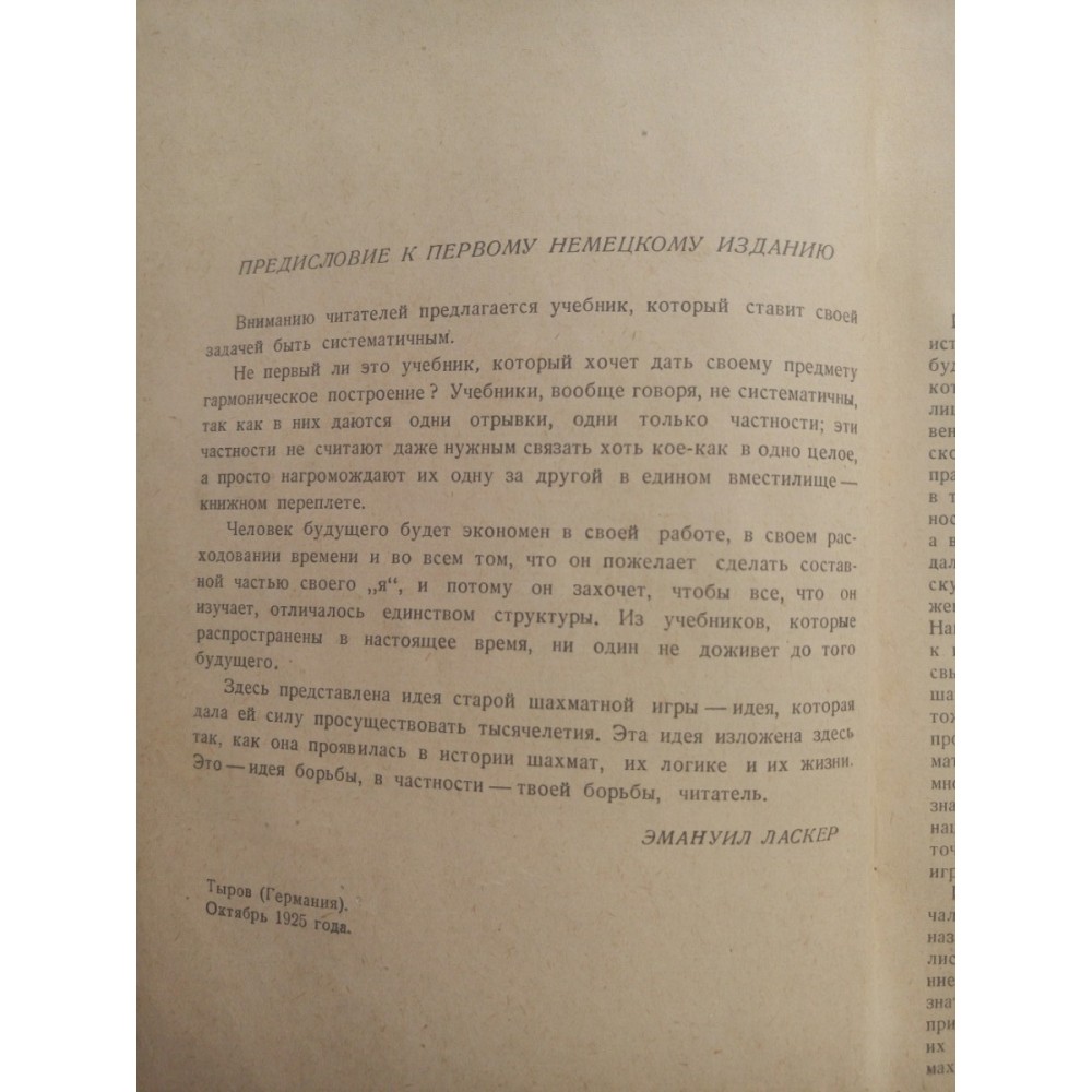 За цим підручником навчалися багато видатних шахісти. Книга містить початкові відомості про шахову гру, вчення про дебюти. Особливе місце займають розділи, присвячені позиційній боротьбі та проблемам шахової естетики. Для широкого кола читачів, які цікавляться шахами.