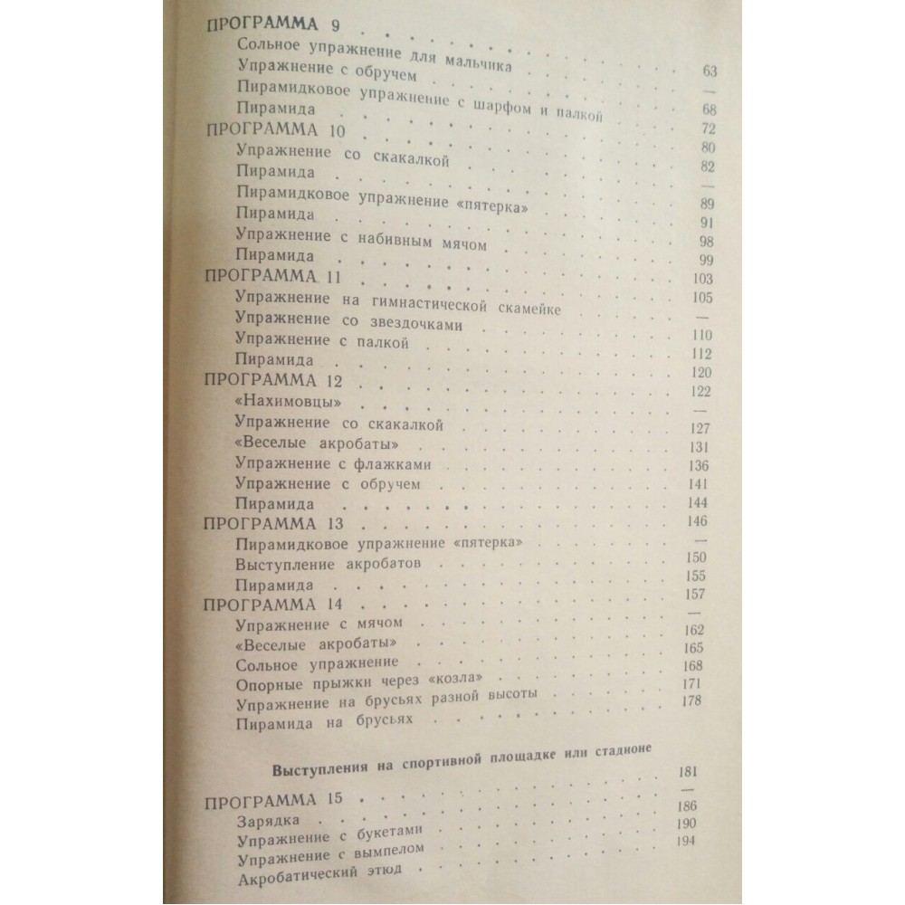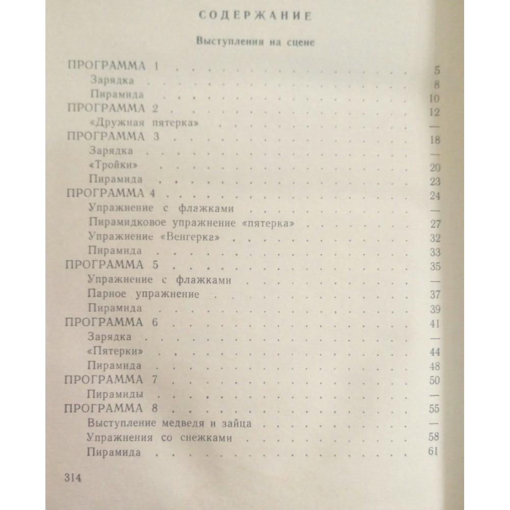 Ця книга — на допомогу юним гімнастам. У ній дається практичний матеріал для фізкультурних виступів на шкільному ранку, вечорі, на зборі піонерського загону, для виступу в піонерському таборі та біля піонерського багаття. Книга призначена для активу школярів — фізкультурників, піонерів і вчителів з фізичної культури. Матеріал пропонується у вигляді вісімнадцяти програм. Перші чотирнадцять програм для виступу на сцені, в залі або великій кімнаті. Інші чотири програми — для виступу на майданчику чи стадіоні. Програми, вправи та піраміди можуть бути використані і як самостійні номери для виступів на сцені та на майданчику.