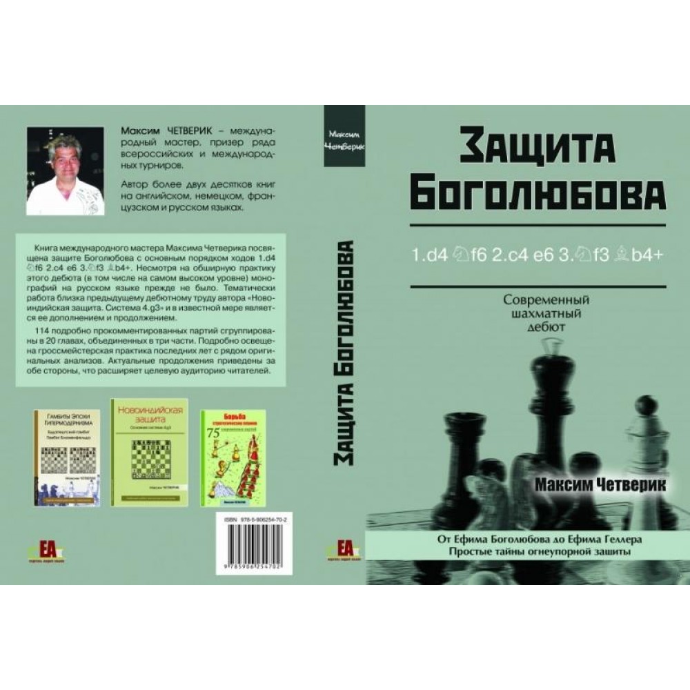 Книга міжнародного майстра Максима Четверика присвячена захисту Боголюбова з основним порядком ходів 1.d4 Cf6 2.c4 e6 3.Cf3 Eb4+. Незважаючи на велику практику цього дебюту (у тому числі на найвищому рівні) монографій російською раніше не було. Тематично робота близька до попередньої дебютної праці автора «Новоіндійський захист. Система 4.g3» і певною мірою є її доповненням та продовженням. 114 докладно прокоментованих партій згруповано у 20 розділах, об'єднаних у три частини. Детально висвітлена гросмейстерська практика останніх років із низкою оригінальних аналізів. Актуальні продовження наведено за обидві сторони, що розширює цільову аудиторію читачів.