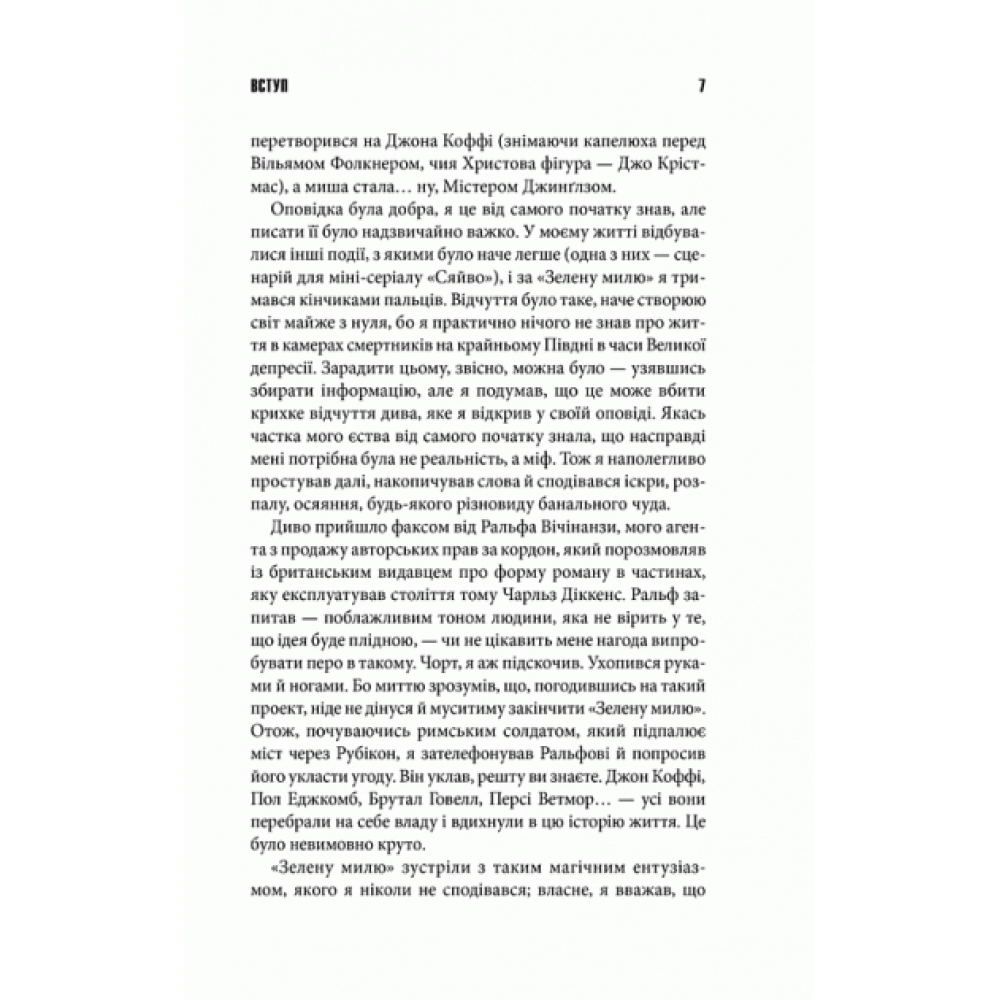 Роман про життя у в’язниці смертників. Історія Джона Коффі, ув’язненого з надзвичайними здібностями, стає символом людяності й трагізму.